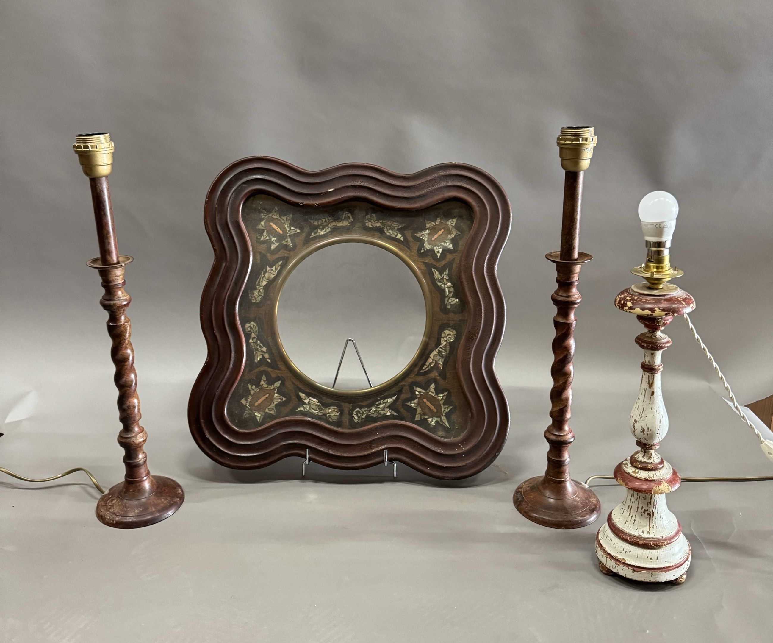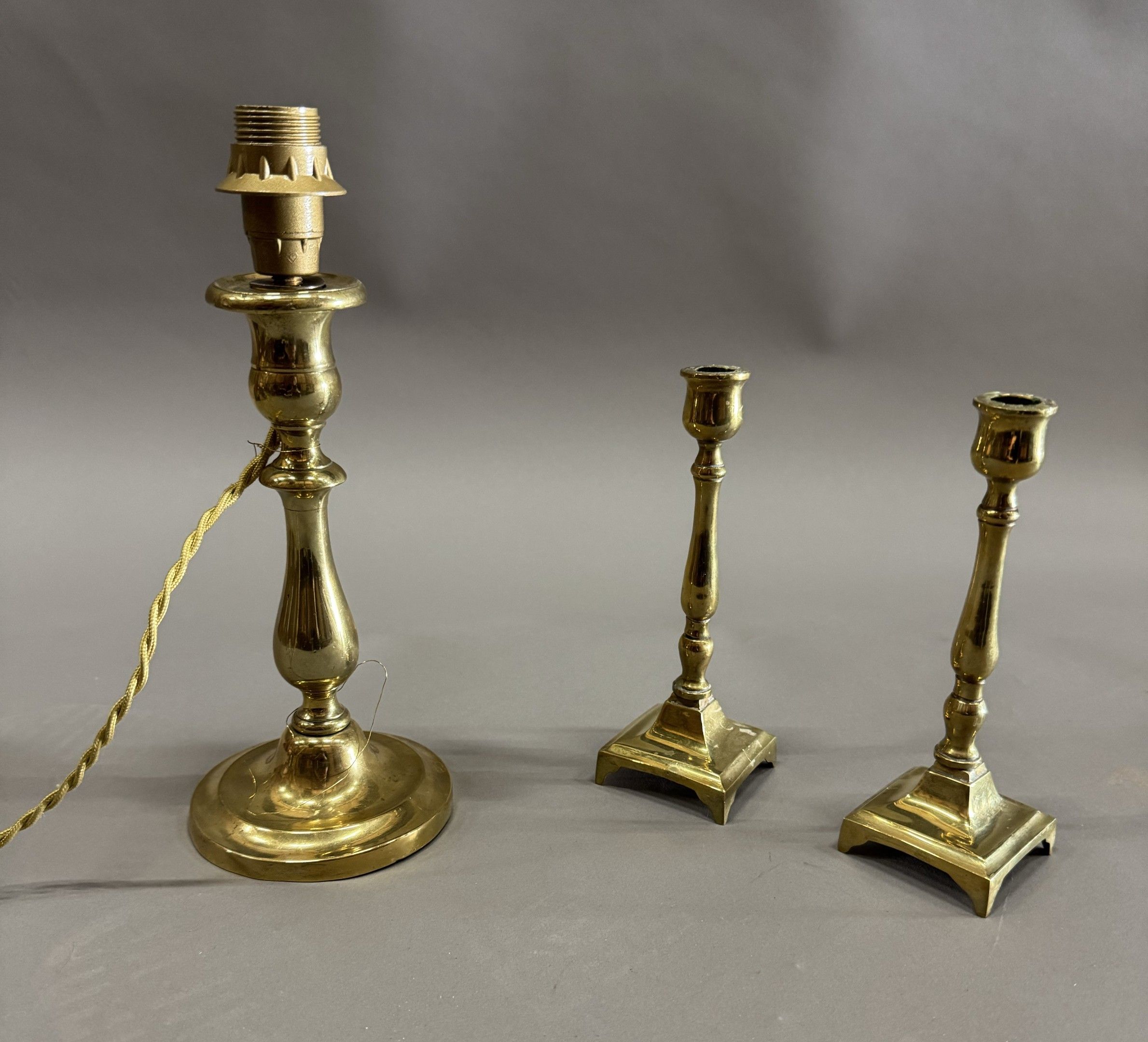 Set comprising a pair of metal lamps, the torso column shaft with faux wood patina. Modern work. Height: 50 cm. A white and ochre polychrome turned wood lamp. Height: 36 cm - A moulded wooden clock door. Pair of small turned brass candlesticks on a quadripod base (screw thread changed). A gilt brass candlestick is attached, the baluster shaft (wear, chips). Height: 28 cm.