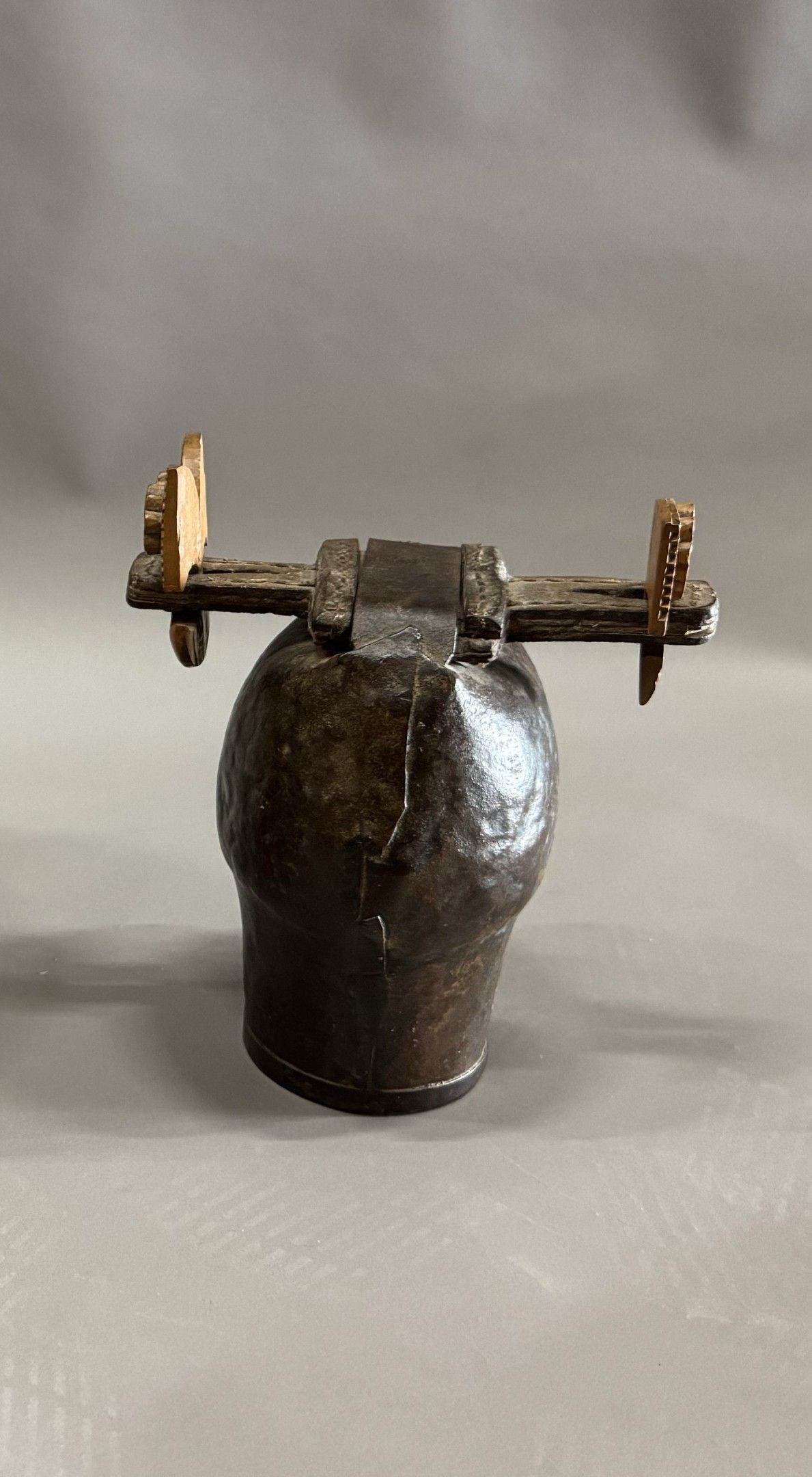 Clarinet bell, the clamps decorated with two wooden elements carved with floral motifs.