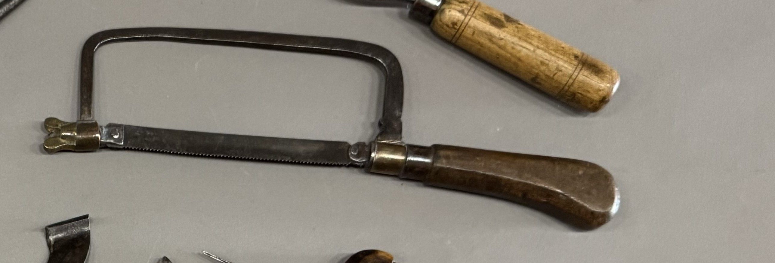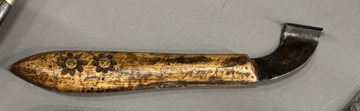 Set comprising a wrought-iron wood claw, the handle in natural wood carved with edelweiss. Popular Art work (accidents and missing parts). Height: 18 cm - A wrought iron amputation saw with a natural wood handle. Work of Popular Art (accidents and missing). Height : 29 cm.