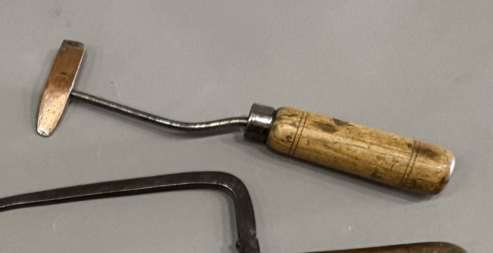 Probably a glazier's hammer, in wrought iron and turned wood.