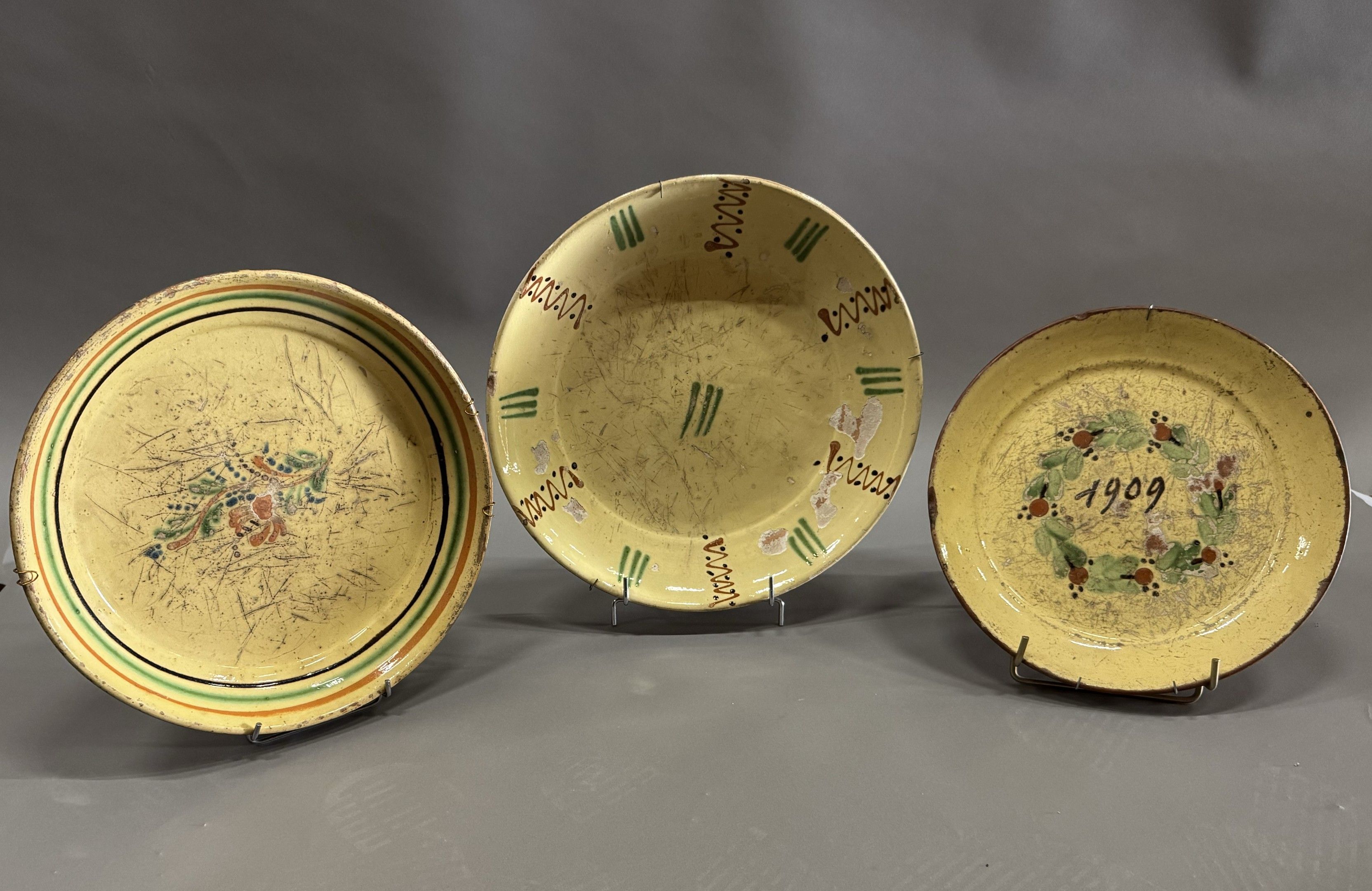 SAVOIE - Three glazed earthenware pitchers with mottled decoration (chips and missing pieces). Height : 14 cm - 19 cm - 19,5 cm - PAYS DE SAVOIE - POTERIE DE MARNAZ (probably) - Three circular dishes with yellow background, one dated 1909 in the centre in a floral medallion (chips and missing). missing). Diameters: 28 cm - 31 cm - 34 cm