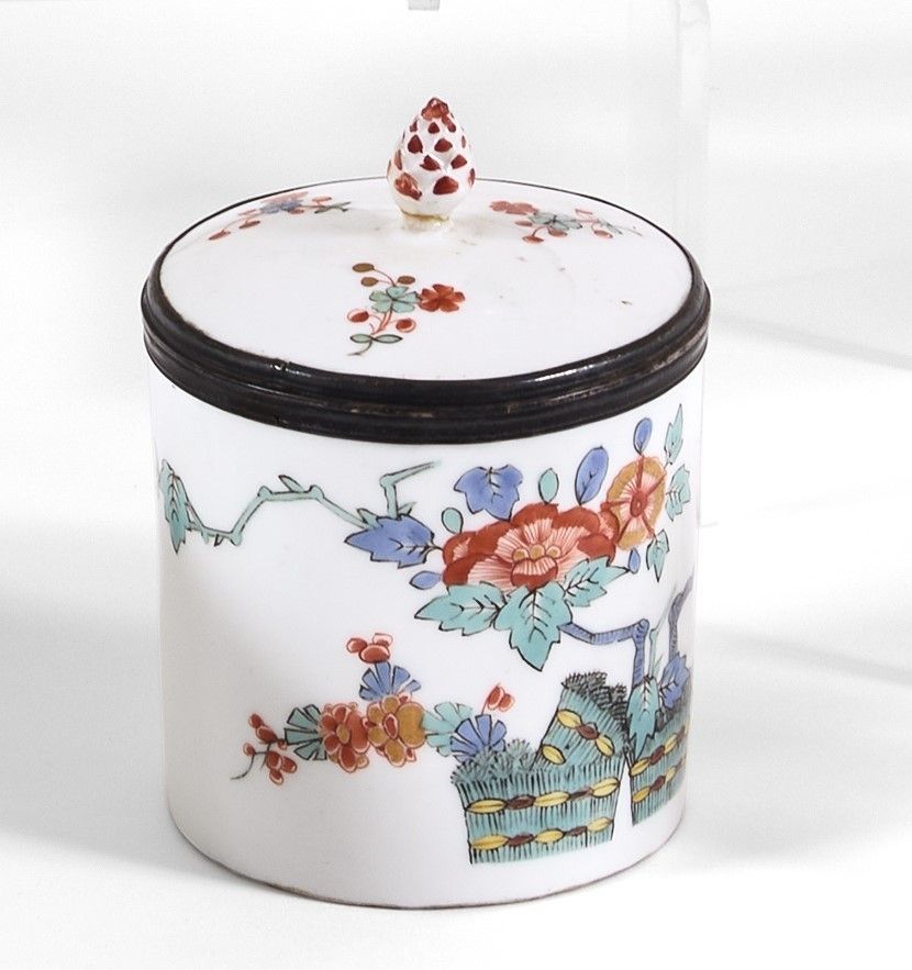 Covered ointment jar in porcelain with polychrome decoration in the Kakiemon style of hedges decorated with flowering branches. The lid is in the shape of a pine cone enhanced with iron red.