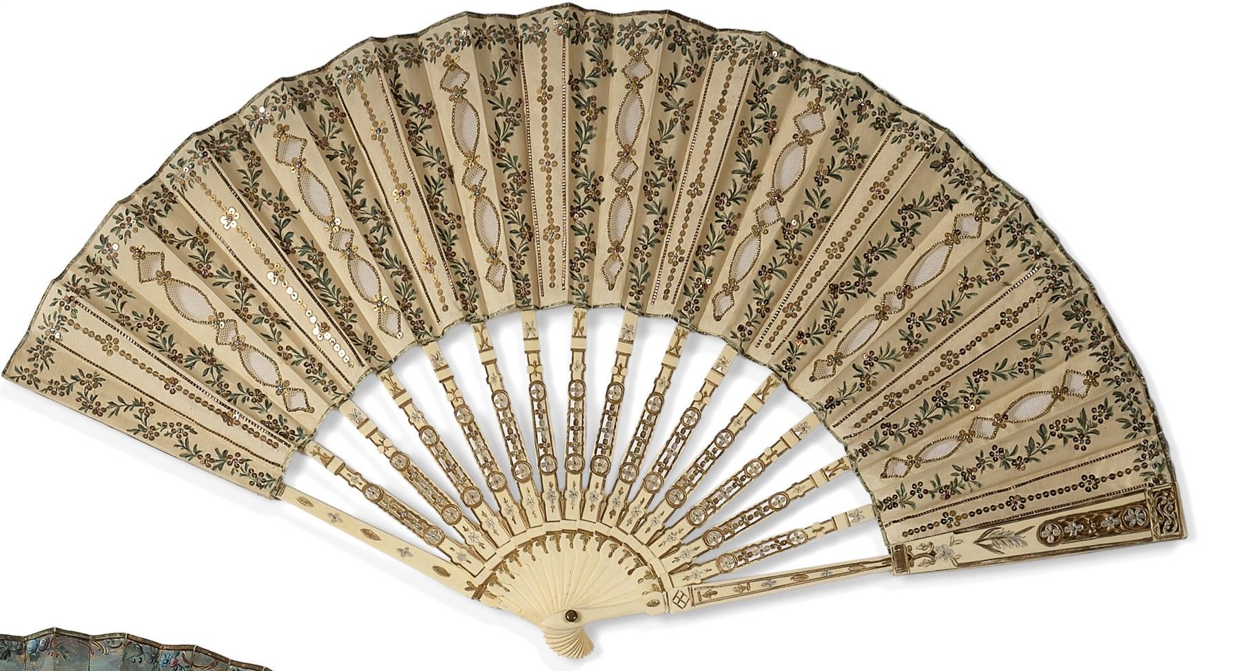 Folded fan in the 18th century style, painted with flowers enhanced with sequins and tulle openings punctuating the leaf. Mute reverse.