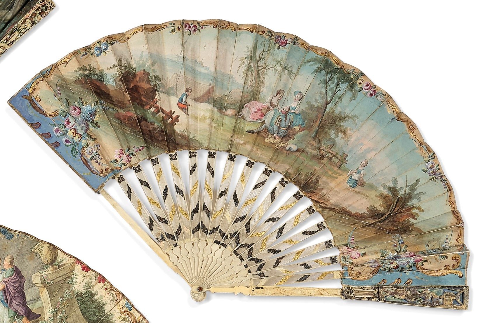 Folded fan, the leaf in skin, mounted in the English style, and painted with Amphitrite in the company of Zephyr, on her chariot, pointing Neptune out to Love who is about to shoot an arrow at her. Reverse painted with an animated cartel of peasants fishing near small houses.