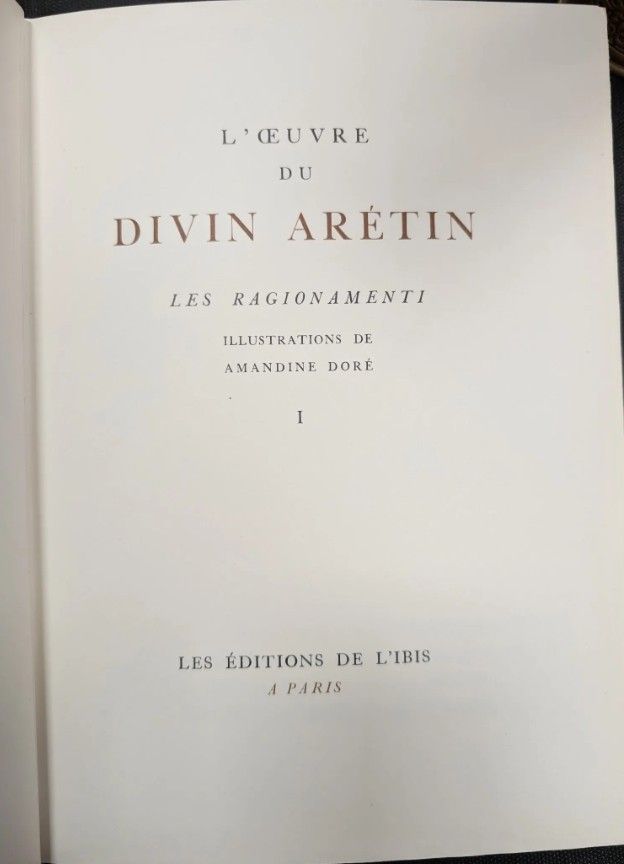 ARETIN (Pietro Bacci, known as L') - L'oeuvre du Divin Arétin. Les Ragionamenti - Illustrations by Amandine Doré - Paris, Editions de L'Ibis, 1970 - 2 vol. in 4°, publisher's binding, slipcase, gilt head (spine unstuck)