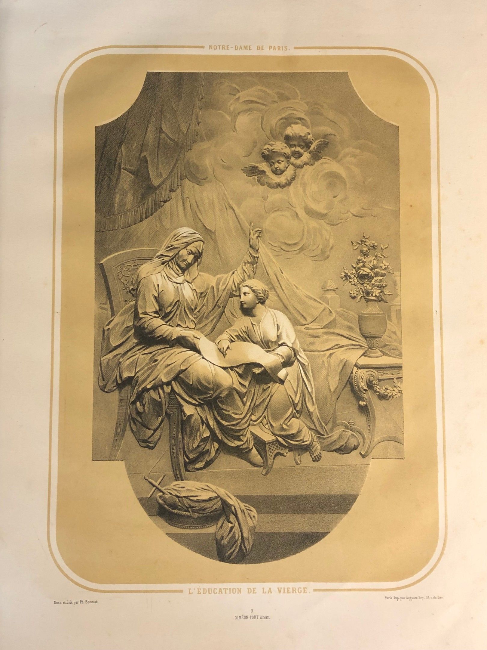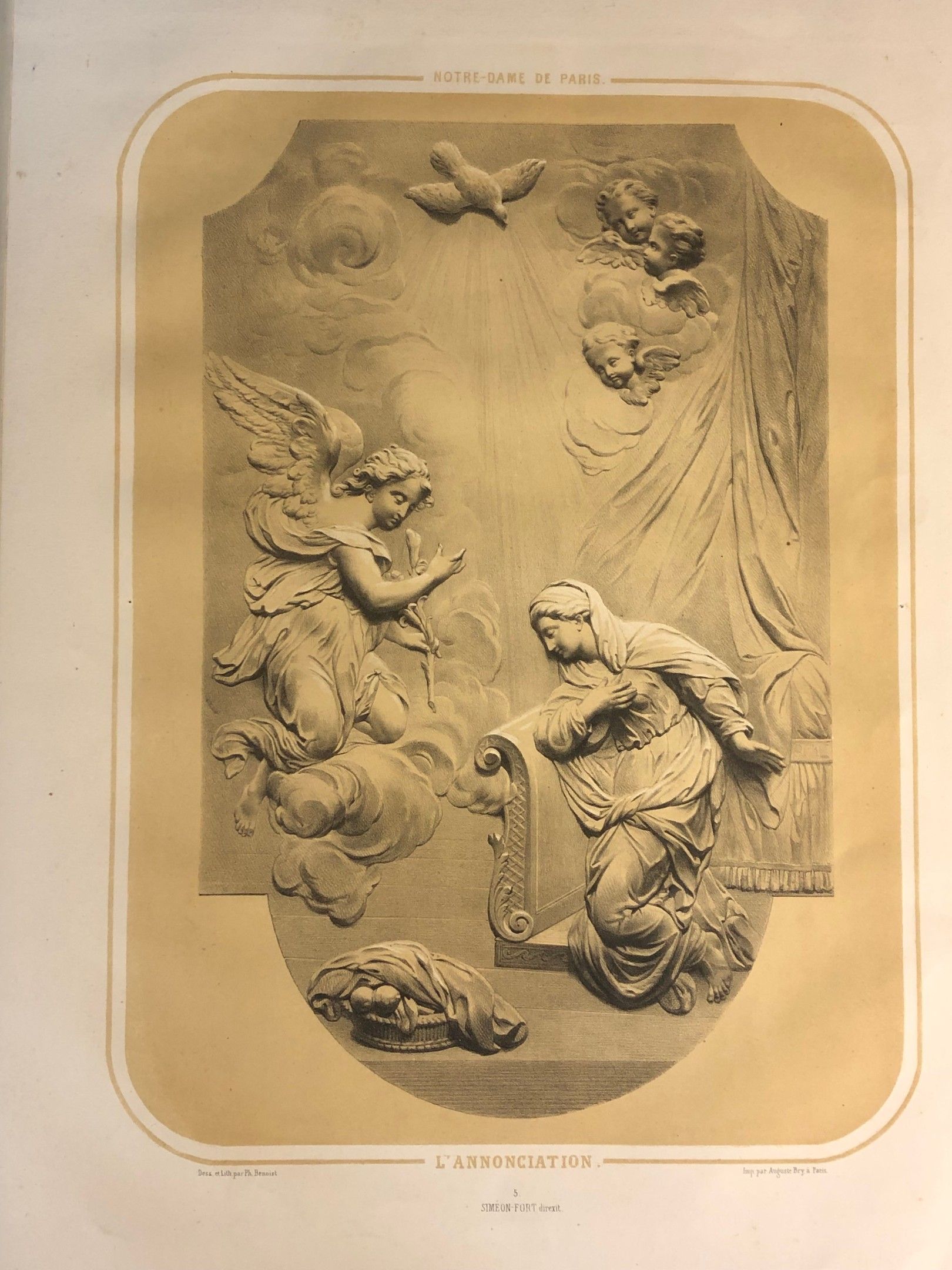 Le vœu de Louis XIII - Boiseries du chœur de Notre-Dame de Paris, , dessinées sous la haute direction de SIMEON-FORT - Premier Album : La vie de la Vierge - Paris, A. Cadart et Luquet, 1864 - In folio, title page, text page, 10 lithographs drawn and lithographed by Ph. Benoist, printed by Auguste Bry in Paris, green half-percale with defects (spotting).