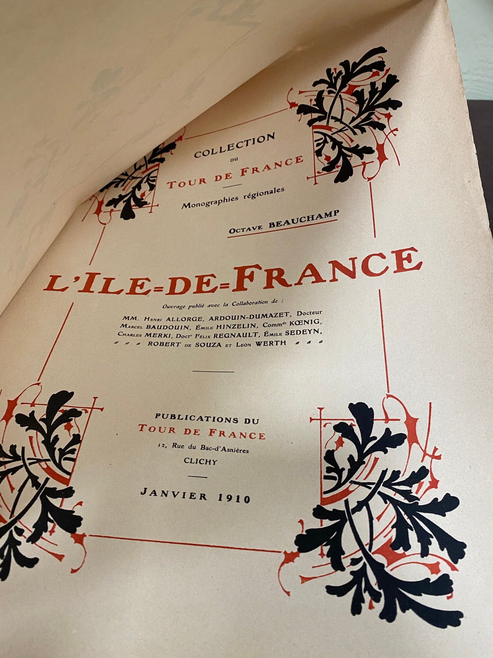 Octave BEAUCHAMP. L'Ile-de-France. Clichy, Publications du Tour de France, 1910. In-4, paperback. Numerous out-of-text illustrations in colour and black and numerous illustrations in the text. Numbered copy 1176 out of 1200 copies (some foxing, some damage).