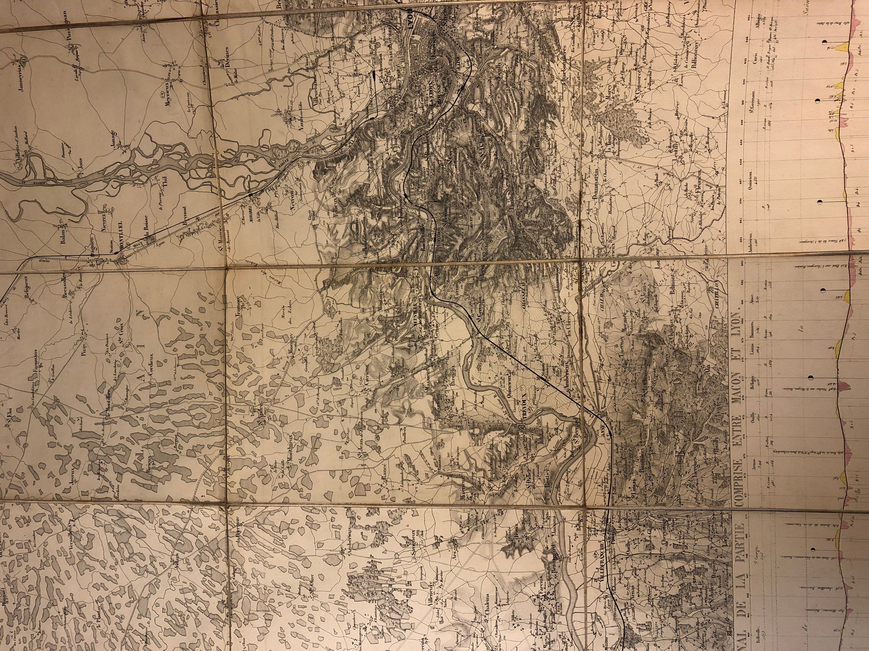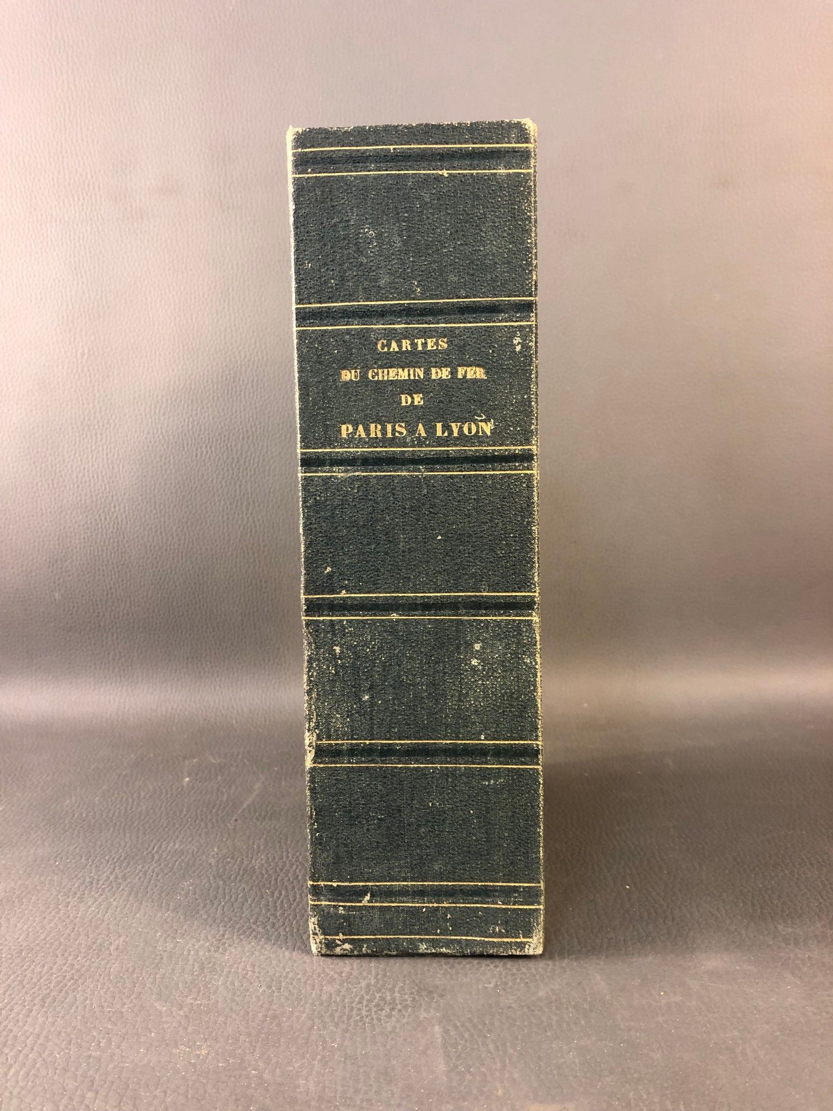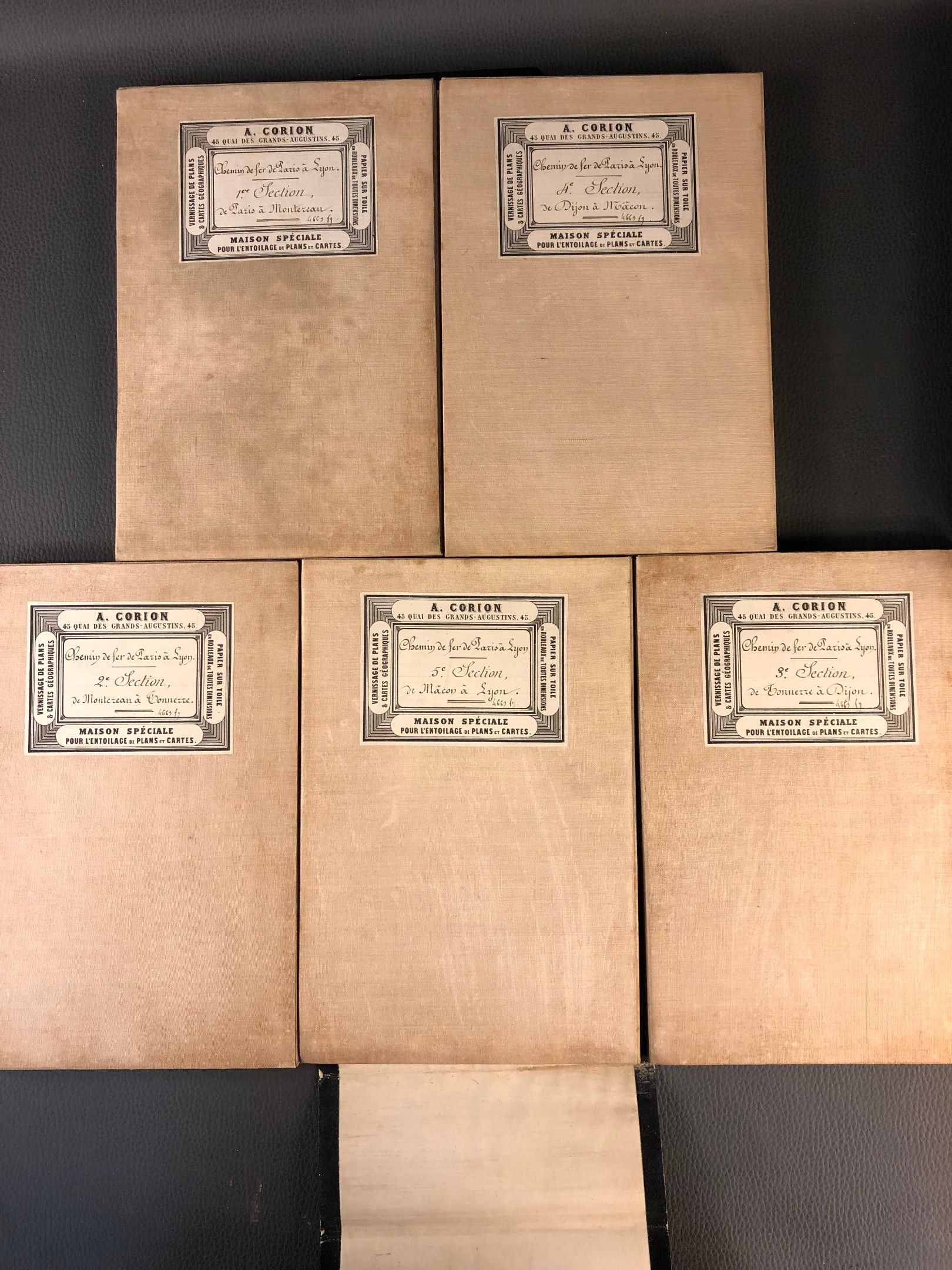 [CHEMIN DE FER] Ministère des travaux publics - Chemin de fer de Paris à Lyon - Carte itinéraire - Avec profil longitudinal, échelles et légendes - Etui boite (25 ht x 17 cm) percale verte (frottis) (des piqures) contenant les 5 sections : - From Paris to Montereau (71.5 x 161 cm), - From Montereau to Tonnerre (71.5 x 161 cm), - From Tonnerre to Dijon (71.5 x 161 cm), - From Dijon to Macon (71.5 x 192 cm), from Macon to Lyon (71.5 x 161 cm) - Covered maps by A. Corion, a firm specialising in the covering of maps and plans - Lith. Lemercier, engraved on stone by the Avril brothers - Title on spine, on 1st plate name of former owner: M. Hely d'Oissel, administrateur
