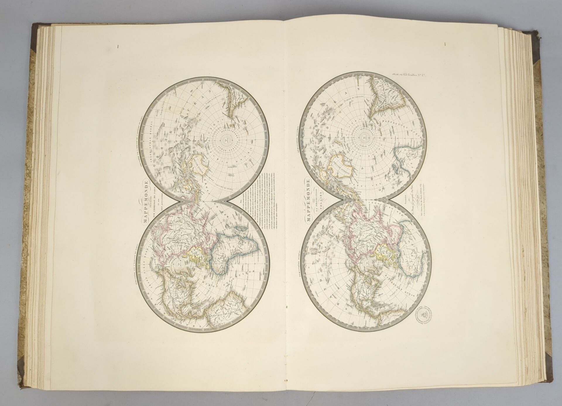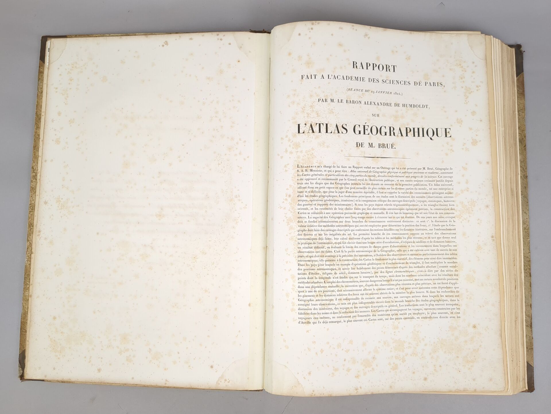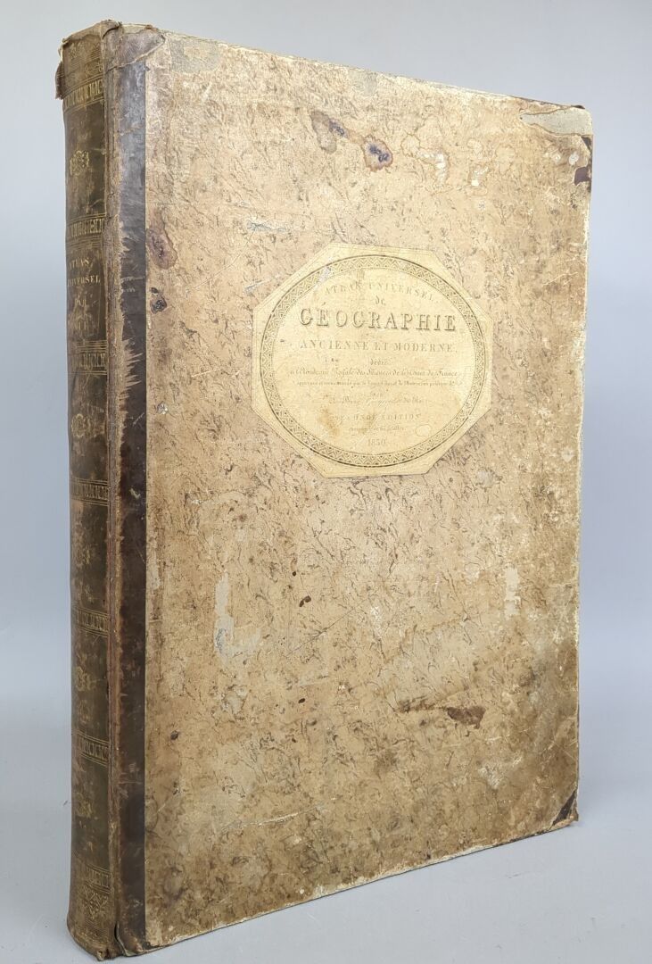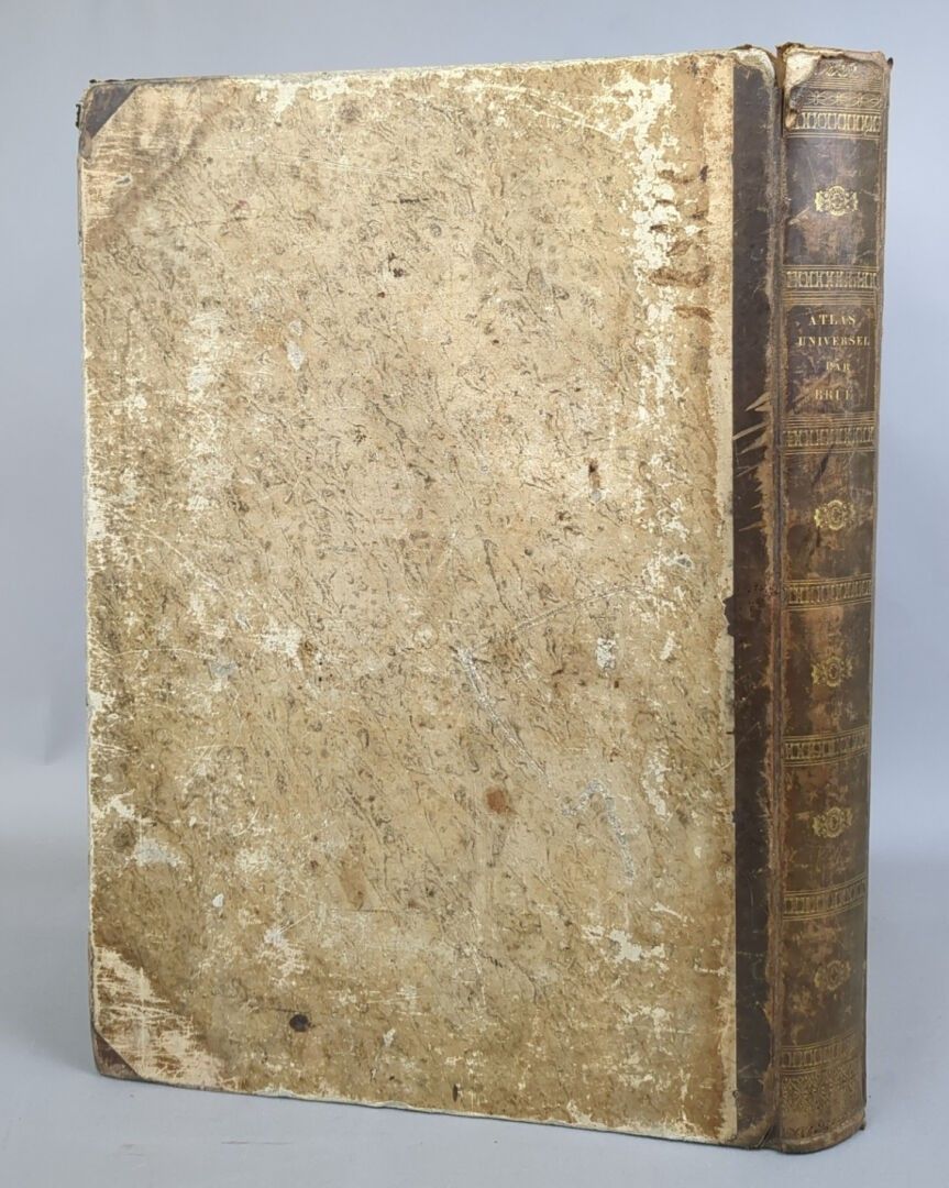 BRUÉ (Adrien Hubert). Atlas Universel de Géographie physique, politique, ancienne & moderne, contenant les cartes générales et particulières de toutes les parties du monde...., second edition, Paris, chez l'Auteur, 1830. One volume in-folio, contemporary half basane, smooth spine decorated, first cover titled. Binding damaged and missing, text foxed, map of France torn and missing.