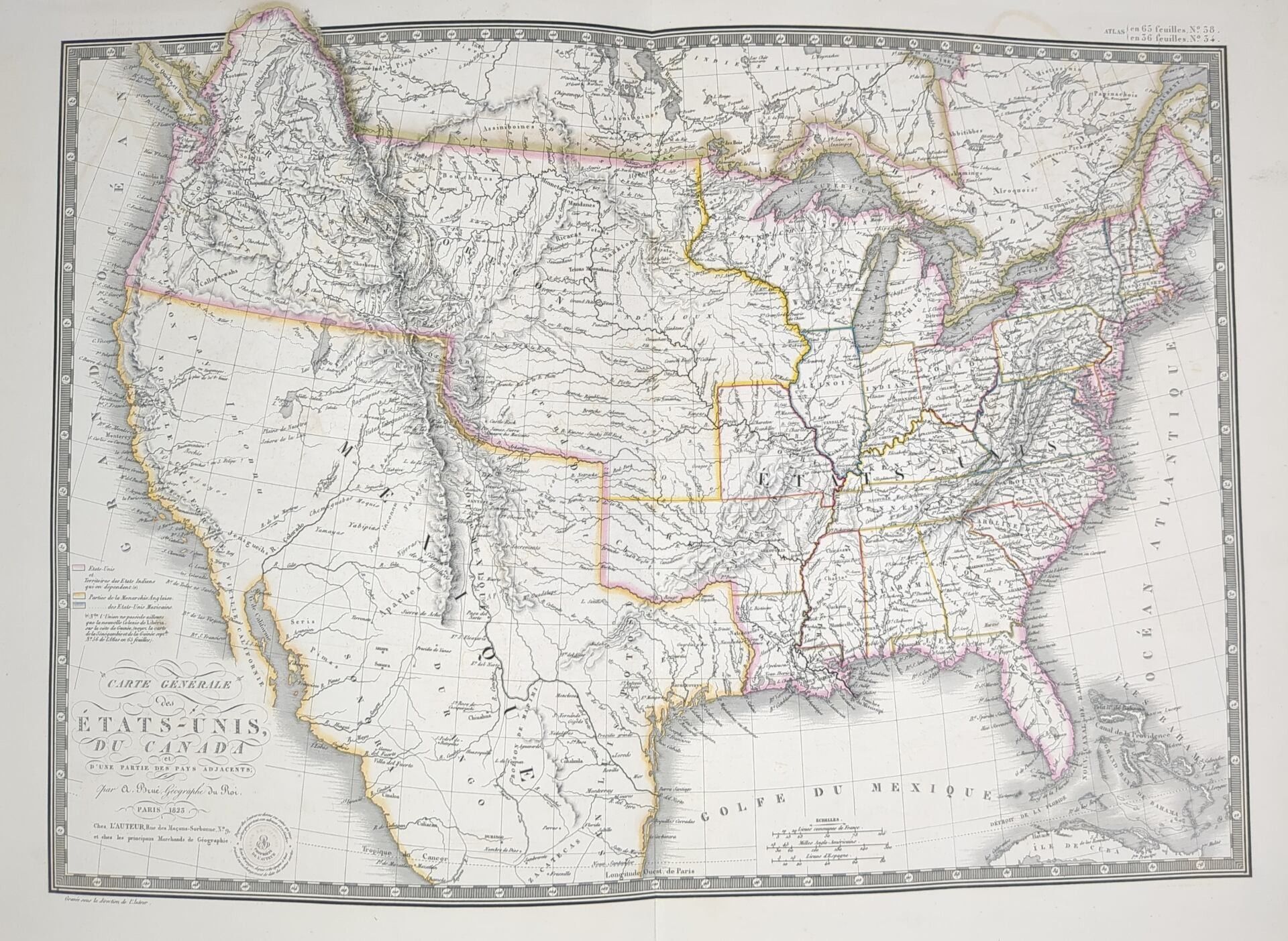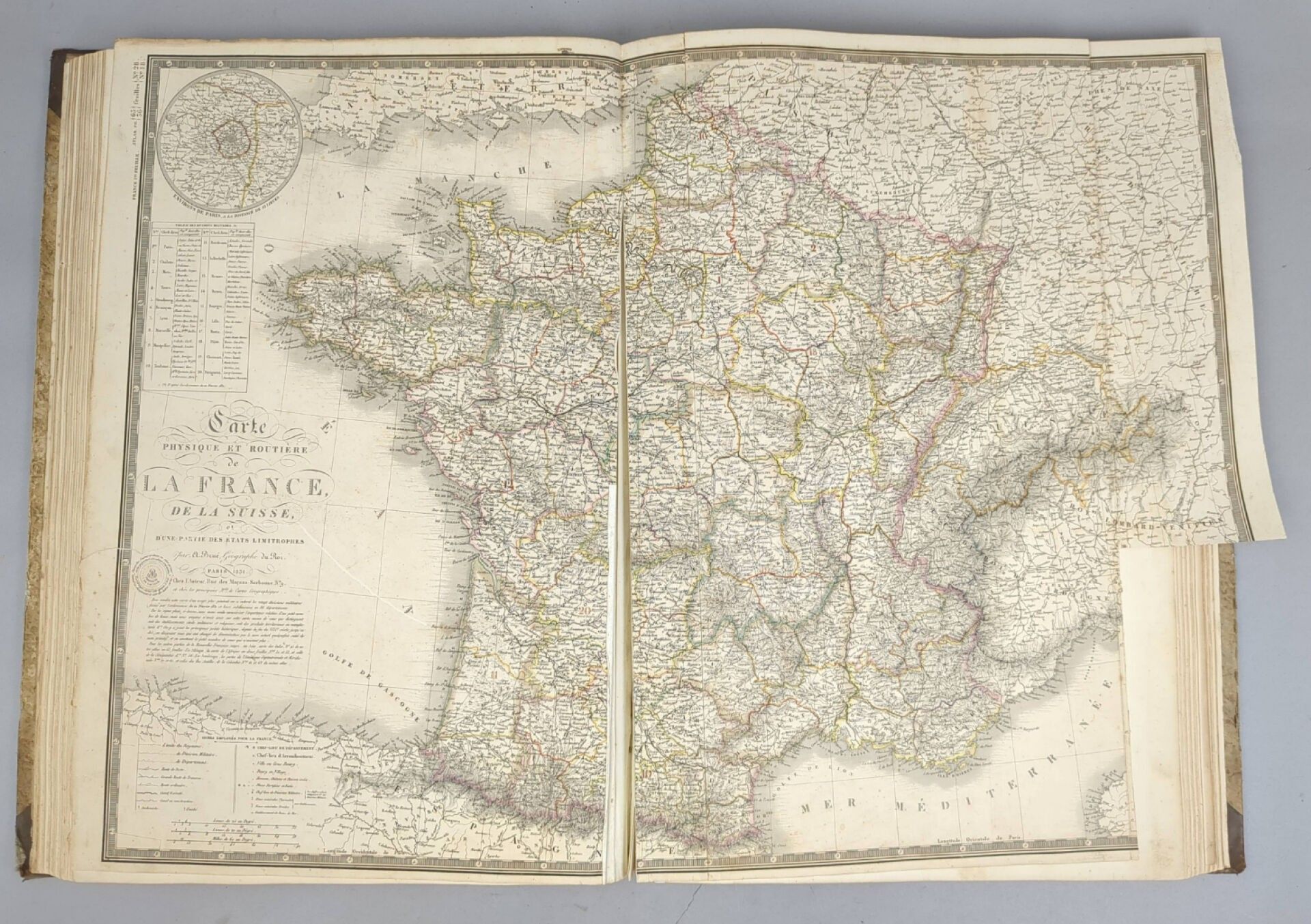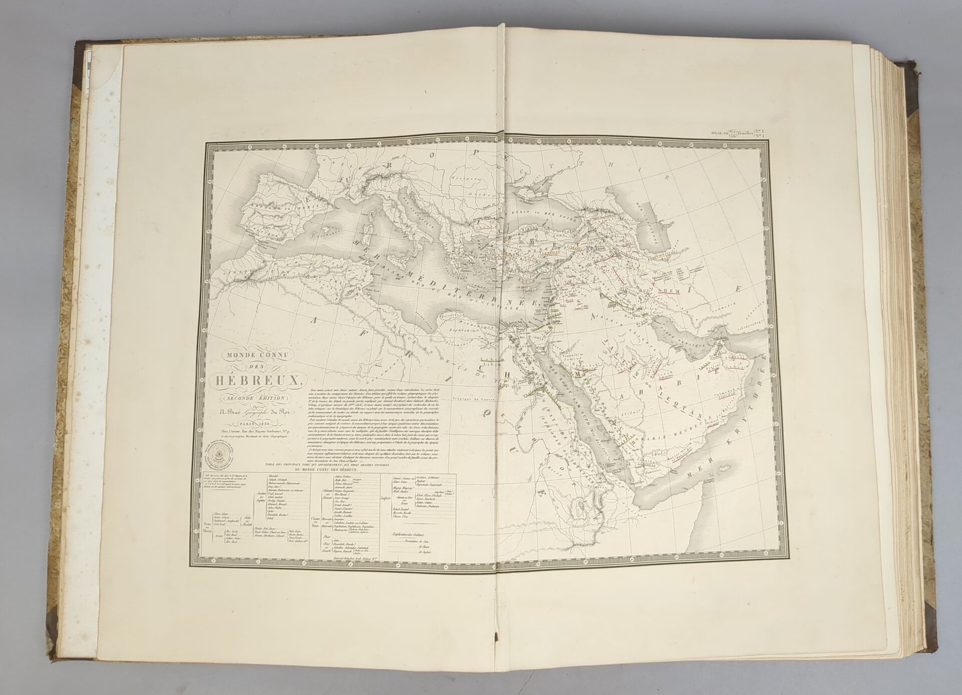 BRUÉ (Adrien Hubert). Atlas Universel de Géographie physique, politique, ancienne & moderne, contenant les cartes générales et particulières de toutes les parties du monde...., second edition, Paris, chez l'Auteur, 1830. One volume in-folio, contemporary half basane, smooth spine decorated, first cover titled. Binding damaged and missing, text foxed, map of France torn and missing.