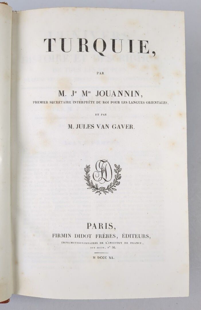 [Turkey] JOUANNIN (J.M.) and VAN GAVER (J.). Turkey. Paris, Didot, L'Univers pittoresque, 1840. One volume in-8, contemporary half calf, smooth spine decorated (faded). 462 pp, (1) f. 96 hors-texte plates and 1 map.