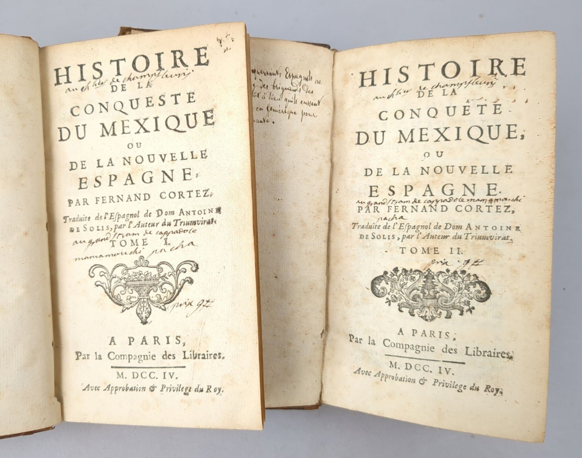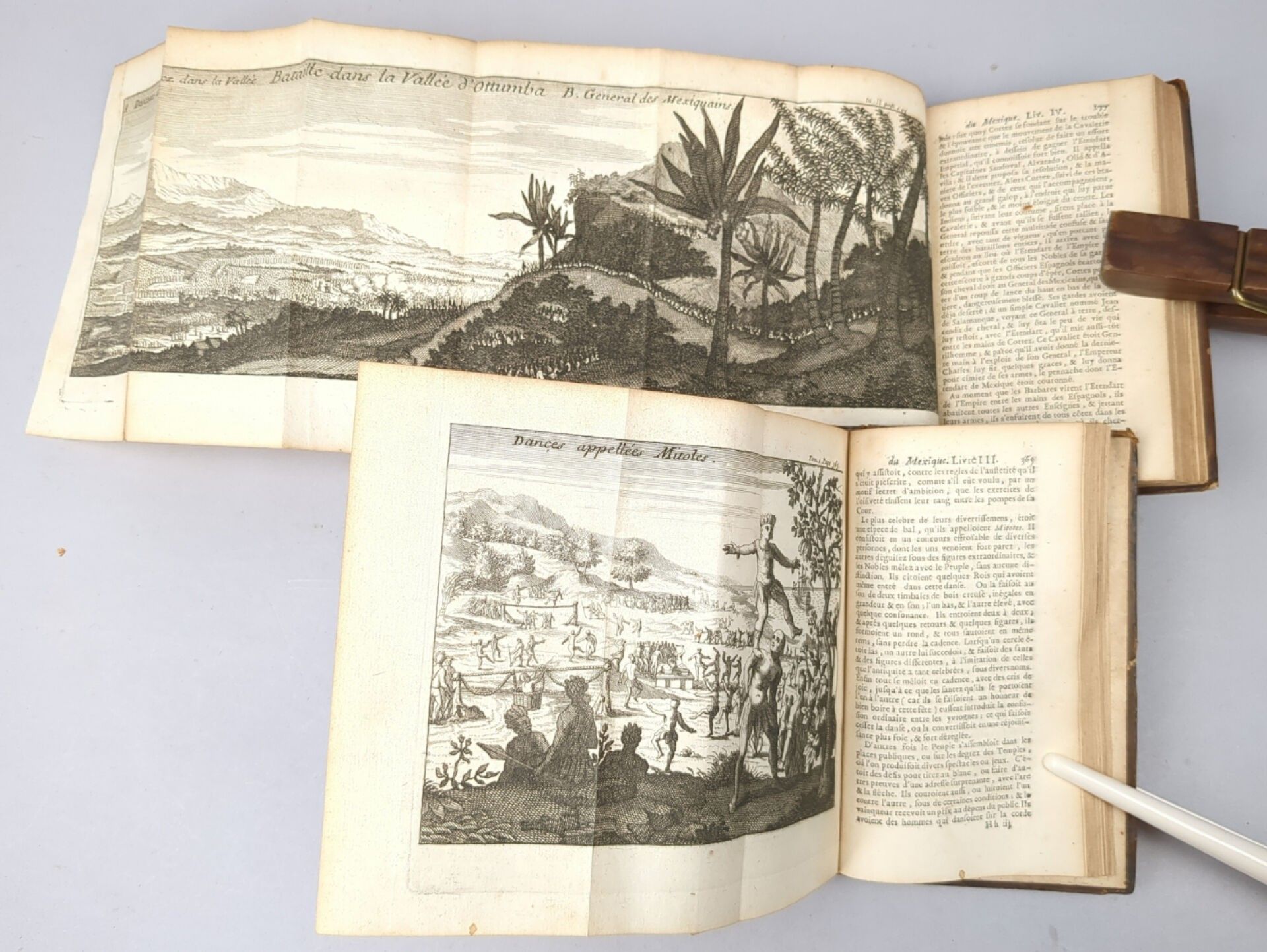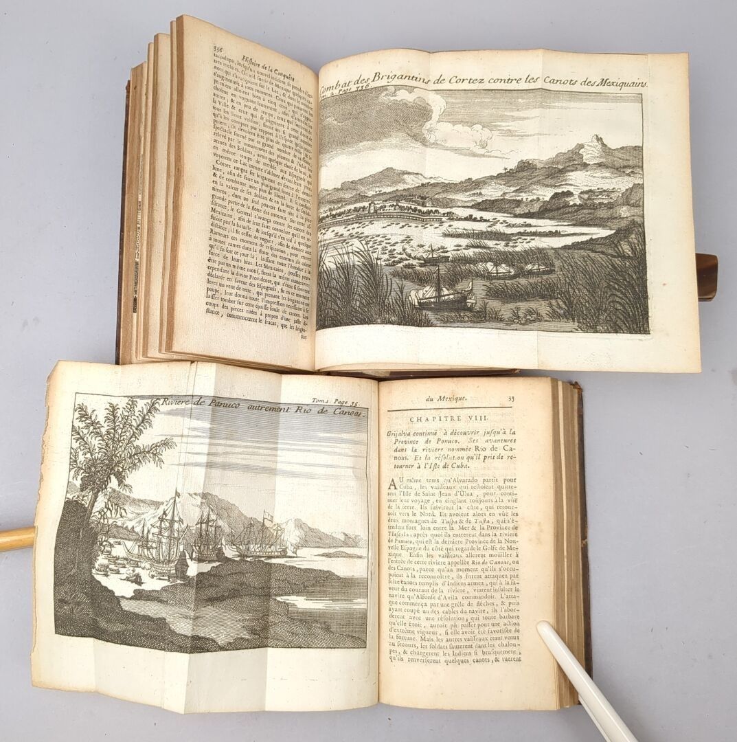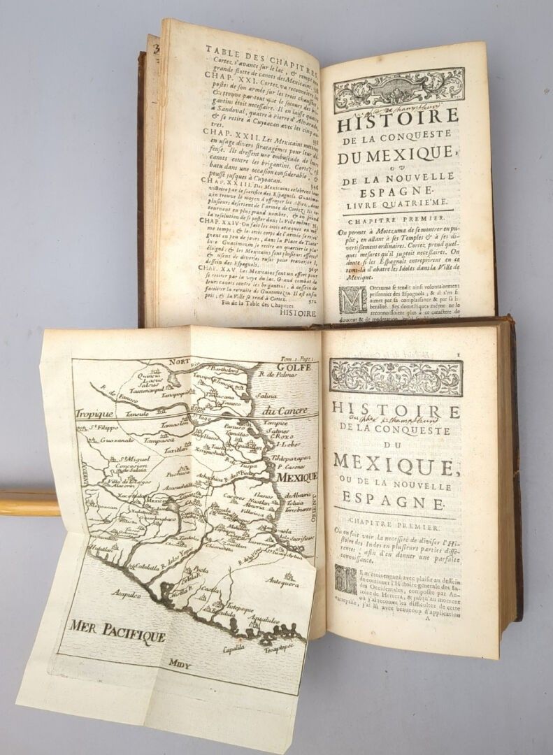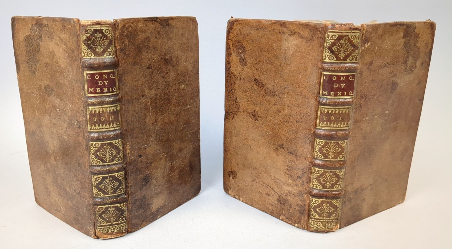 [America] SOLIS (Antonio de). History of the conquest of Mexico, or of New Spain, by Fernand Cortez. Paris, la Compagnie des libraires, 1704. 2 volumes in-12, full contemporary basane, spine ribbed and decorated. (18) ff. 412 pp. 10 pp. and (6) ff. 380 pp. 7 ff. Defects to bindings, paper slightly browned, scattered foxing, tear without loss to one map.