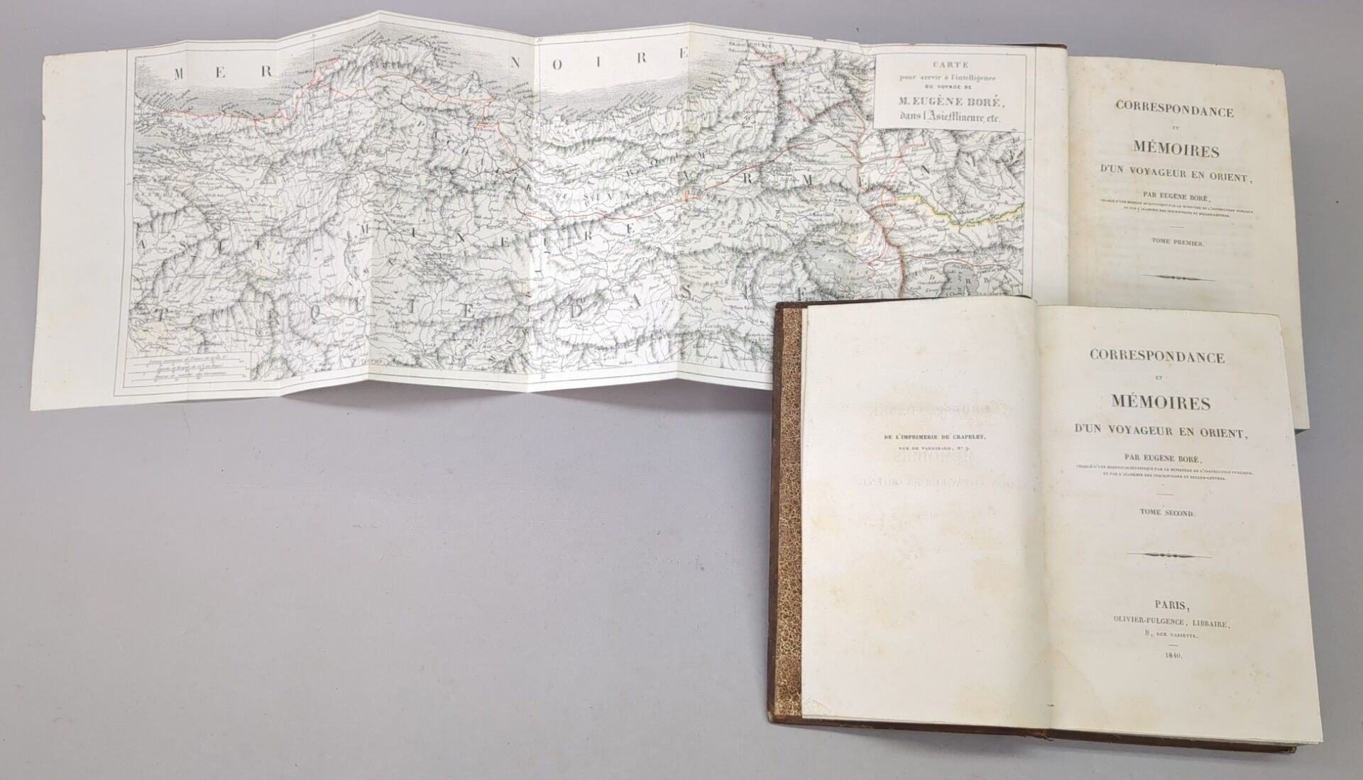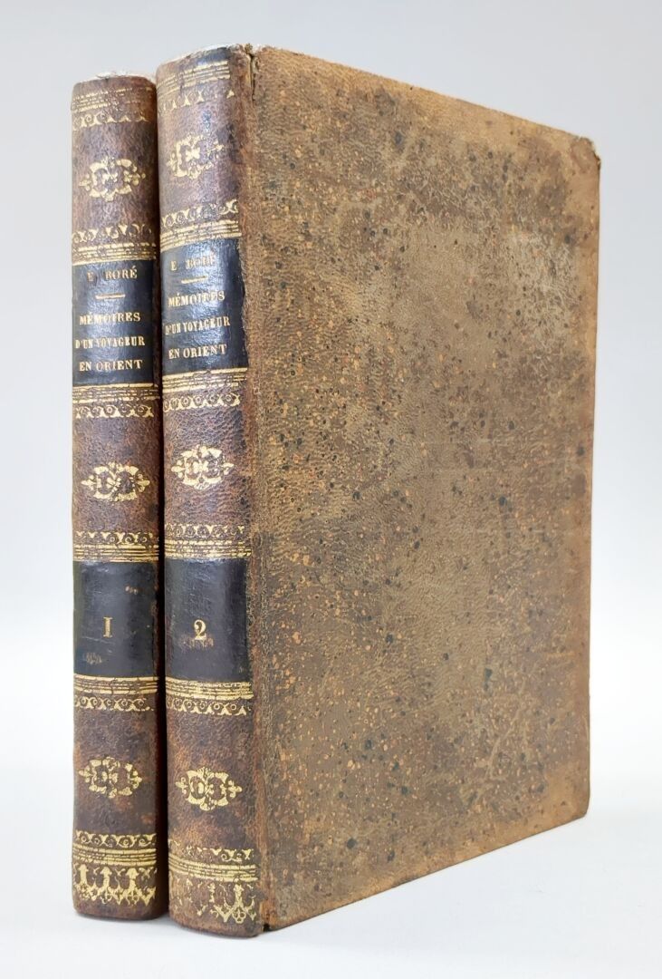 BORÉ (Eugène). Correspondence and memoirs of a traveller in the Orient. Paris, Olivier Fulgence, 1840. 2 volumes in-8, full contemporary brown basane, smooth spine decorated. VIII, 425 pp. and (2) ff. 498 pp. Wear.