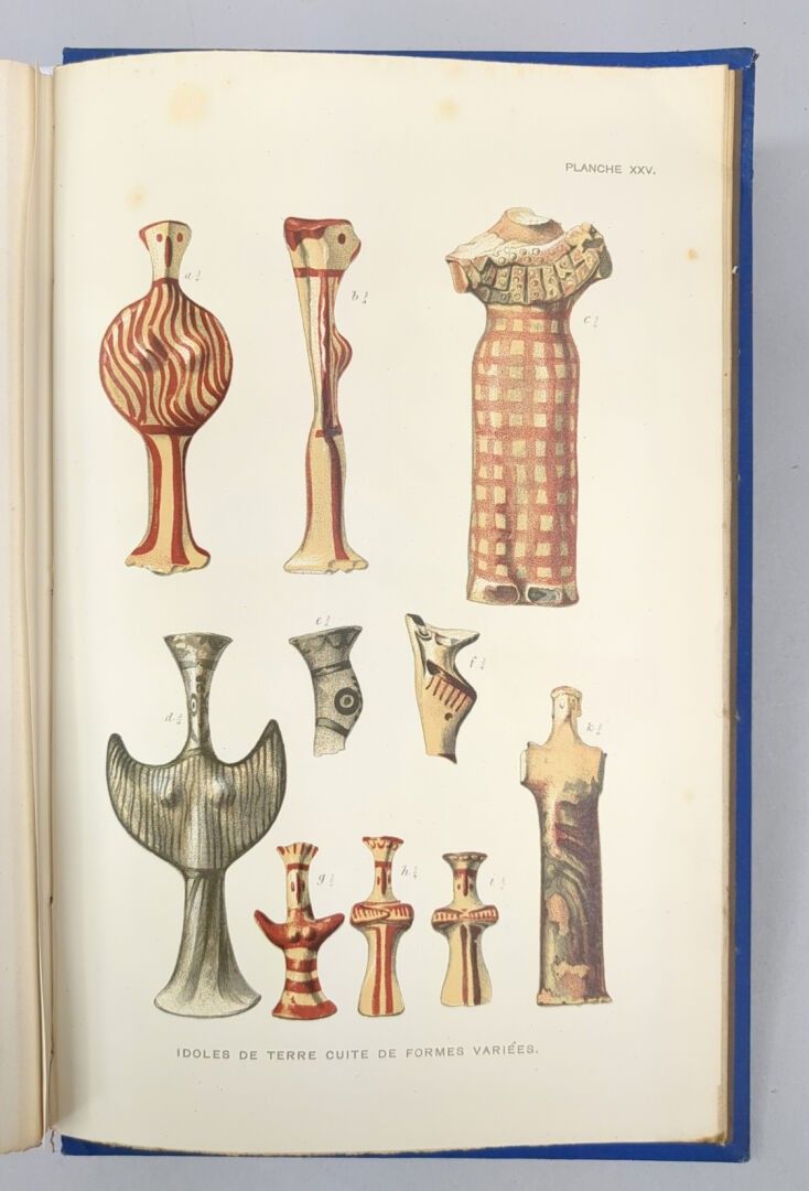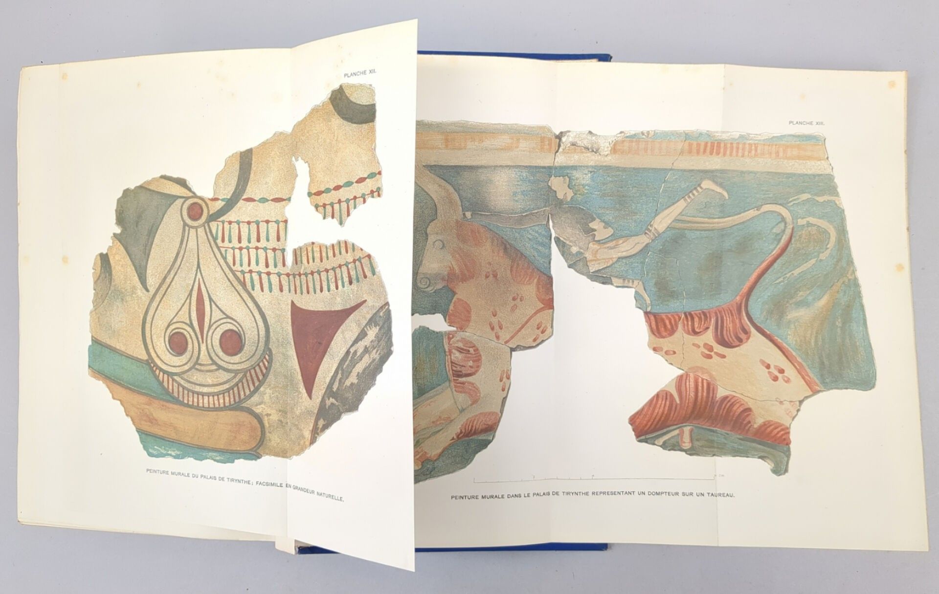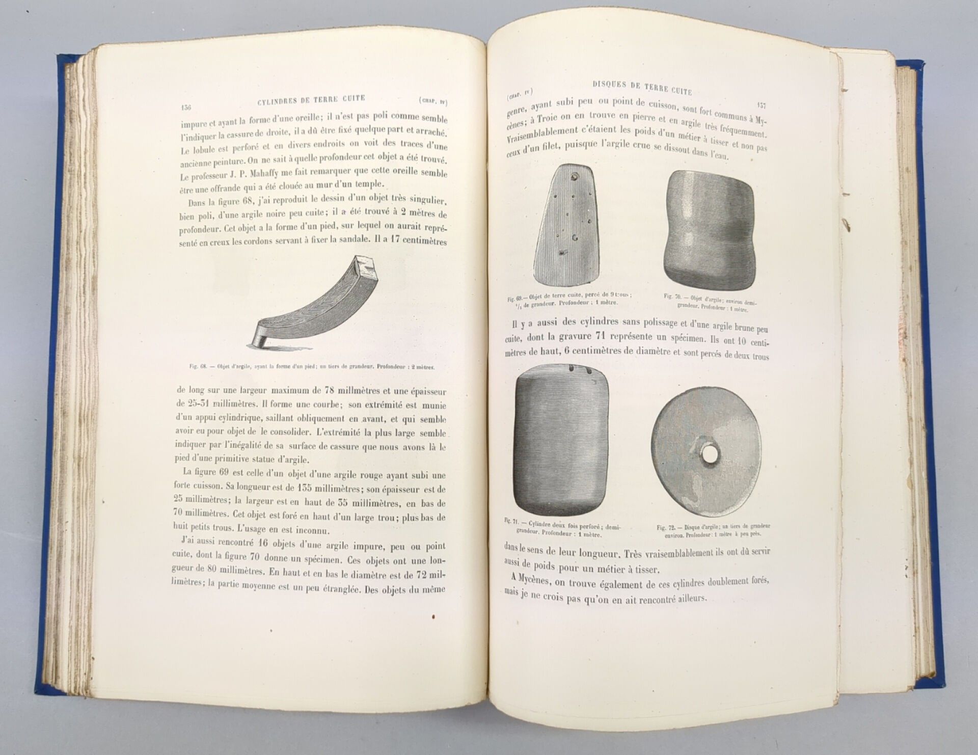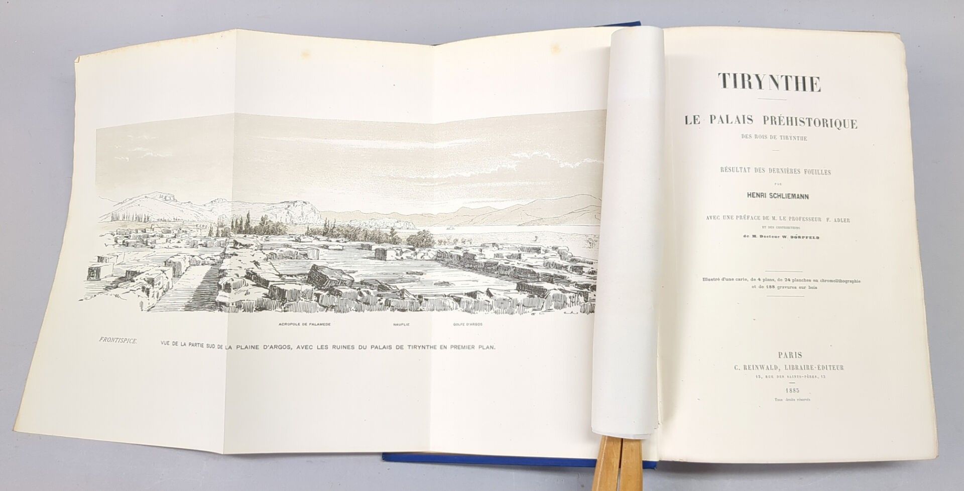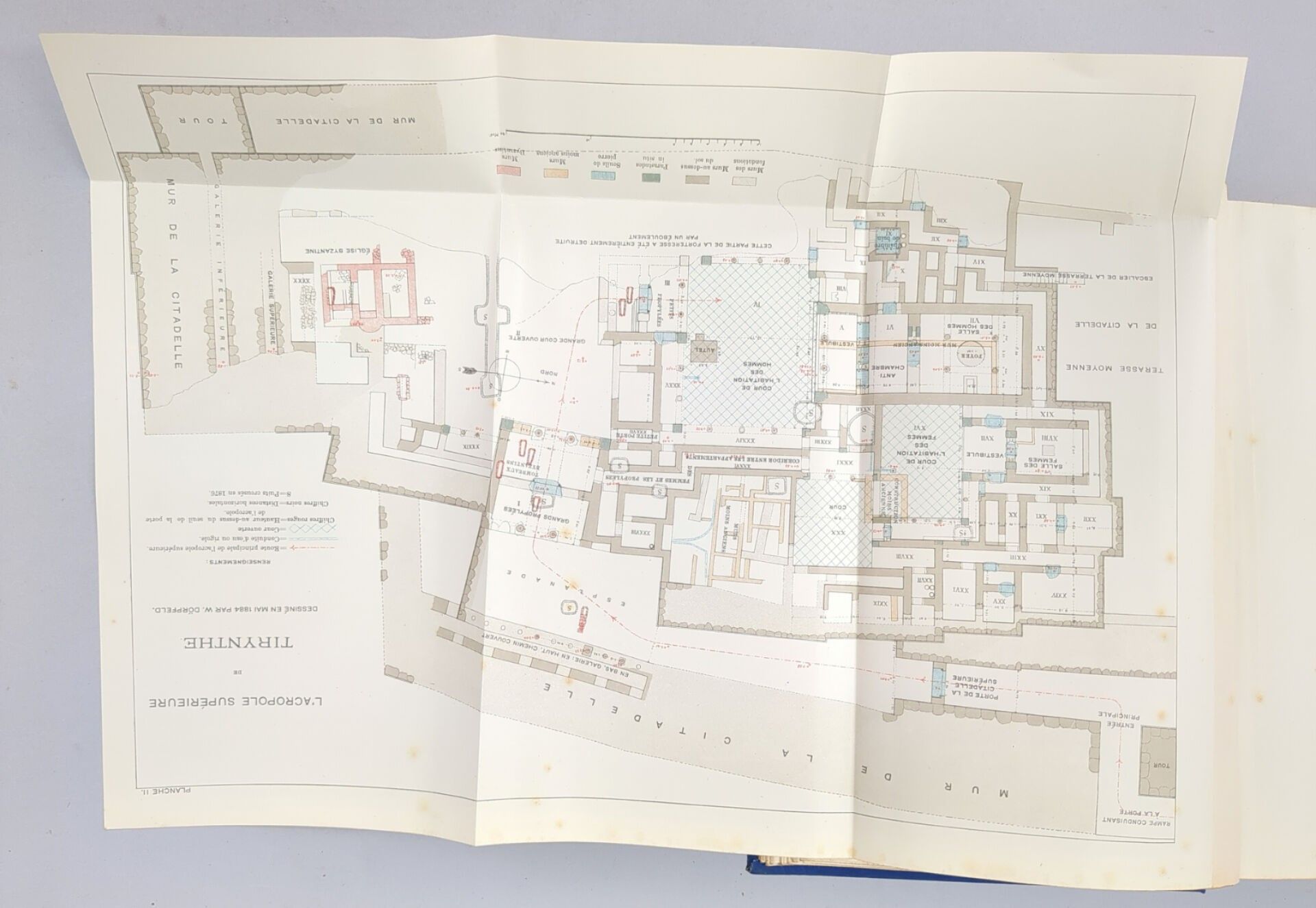 Original French edition published before the German edition. Schliemann excavated Tirynthe with Wilhelm Dörpfeld from 1876 to 1885, discovering the palace of the ancient Mycenaean city.