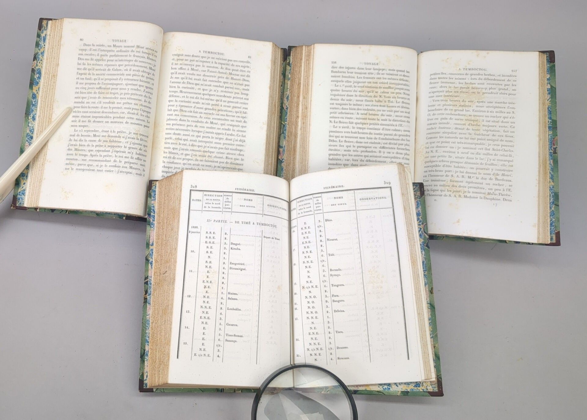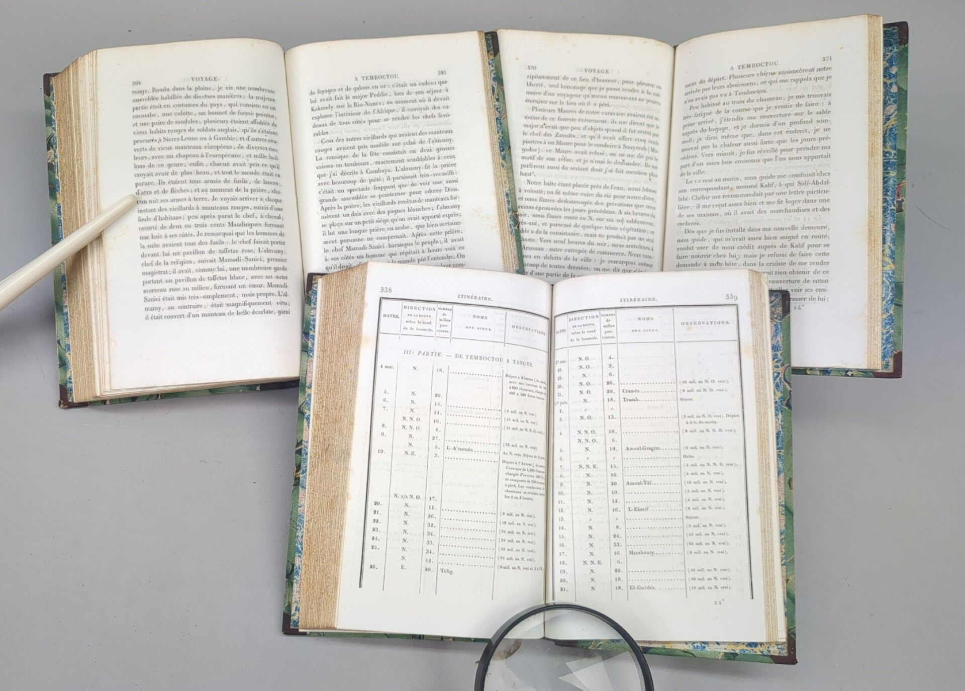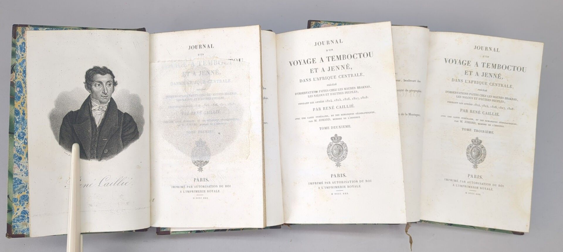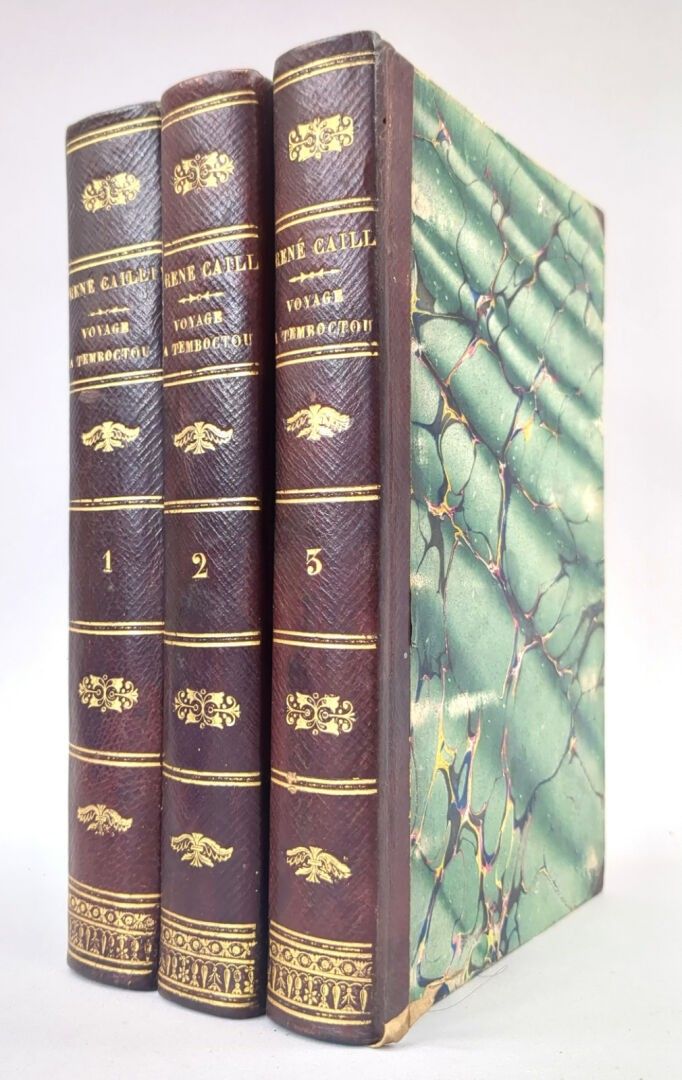 [Africa] CAILLIÉ (René). Journal d'un voyage à Temboctou et à Jenné, dans l'Afrique centrale, précédé d'Observations faites chez les Maures Braknas, les Nalous et d'autres peuples pendant les années 1823-1828. Paris, Imprimerie royale, 1830. 3 volumes in-8, contemporary half basane, smooth spine decorated. (2) ff, XII, 475; (2) ff, 426 pp.; (2) ff, 404 pp., (1) f. First edition illustrated with the portrait of the author on the frontispiece of volume I. Without the Atlas. René Caillé (1799-1838) set sail for Senegal in 1816. In order to win the prize offered by the Société de Géographie for the first European to enter Timbuktu, he decided to learn Arabic for a year and to initiate himself into Islam in order to perfect his deception: passing himself off as an Egyptian kidnapped as a child by Napoleon's army and wanting to rejoin his family. He was the first Christian to enter the city, in April 1828, and to leave alive, but he returned ill, wrote his book and died prematurely.