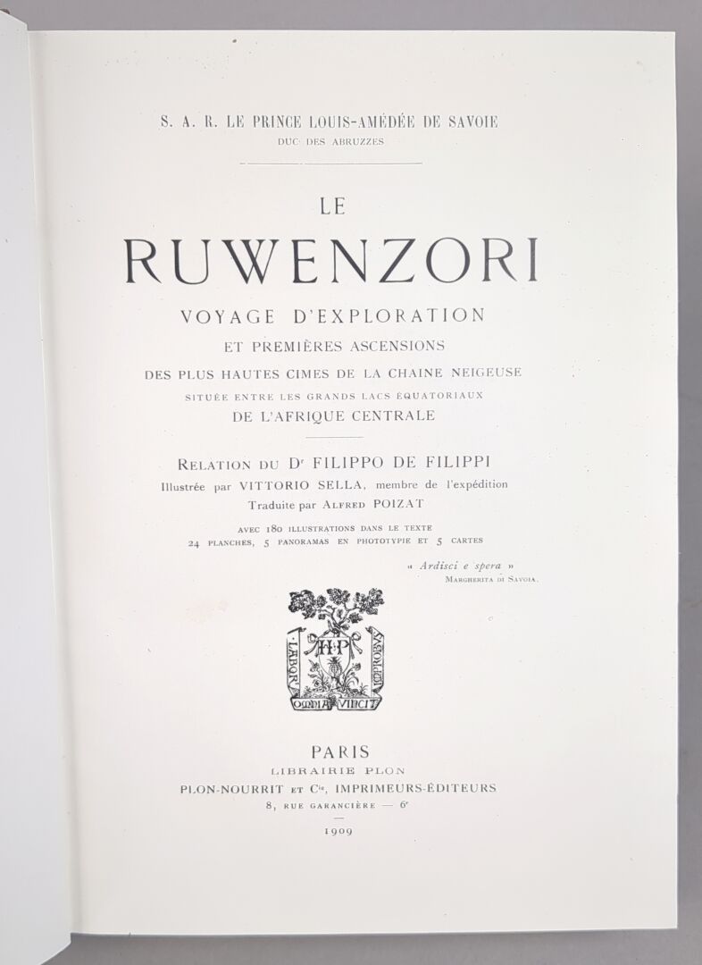 [Africa] SAVOIE (Louis Amédée de) & FILIPPI (Filippo de). Le Ruwenzori, voyage d'exploration et premières ascensions des plus hautes cimes de la chaîne neigeuse de l'Afrique centrale. Plon-Nourrit et Cie, imprimeurs-éditeurs, Paris, 1909. One volume in-8, full post taupe boards, leather title page (Ateliers Laurenchet). (5) ff. 356 pp. Spotting to spine.