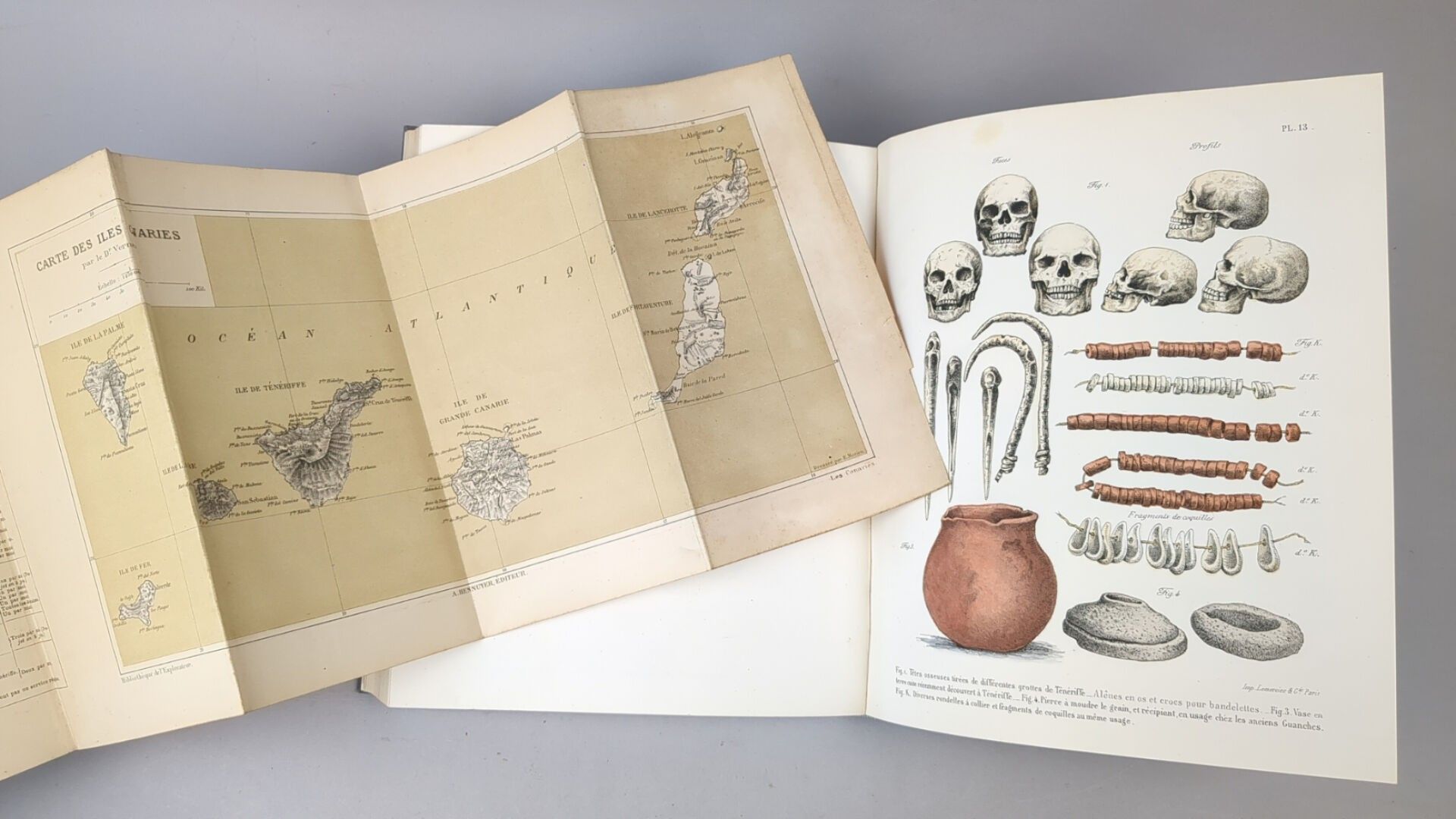 4 plates hors-texte, 42 engravings in-texte and 1 folding map. Account of two scientific missions between 1876 and 1887 by the anthropologist René Verneau (1852-1938).