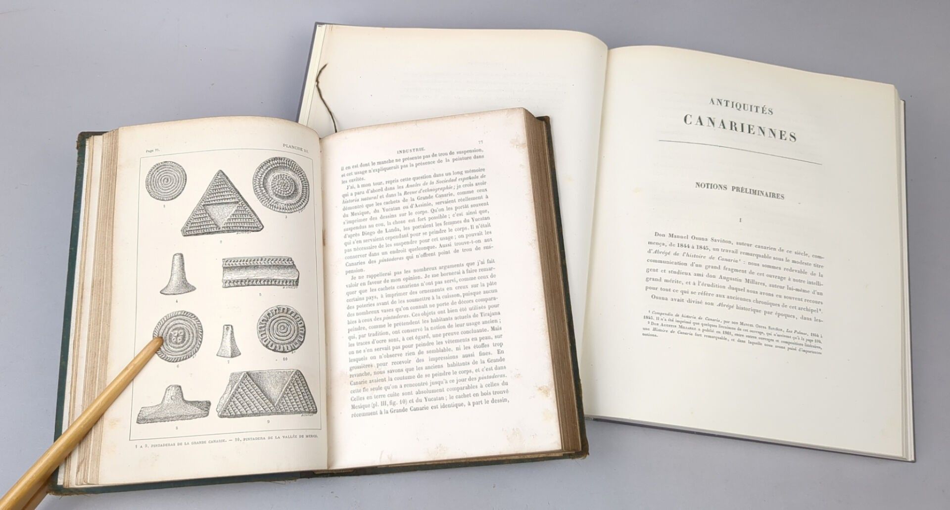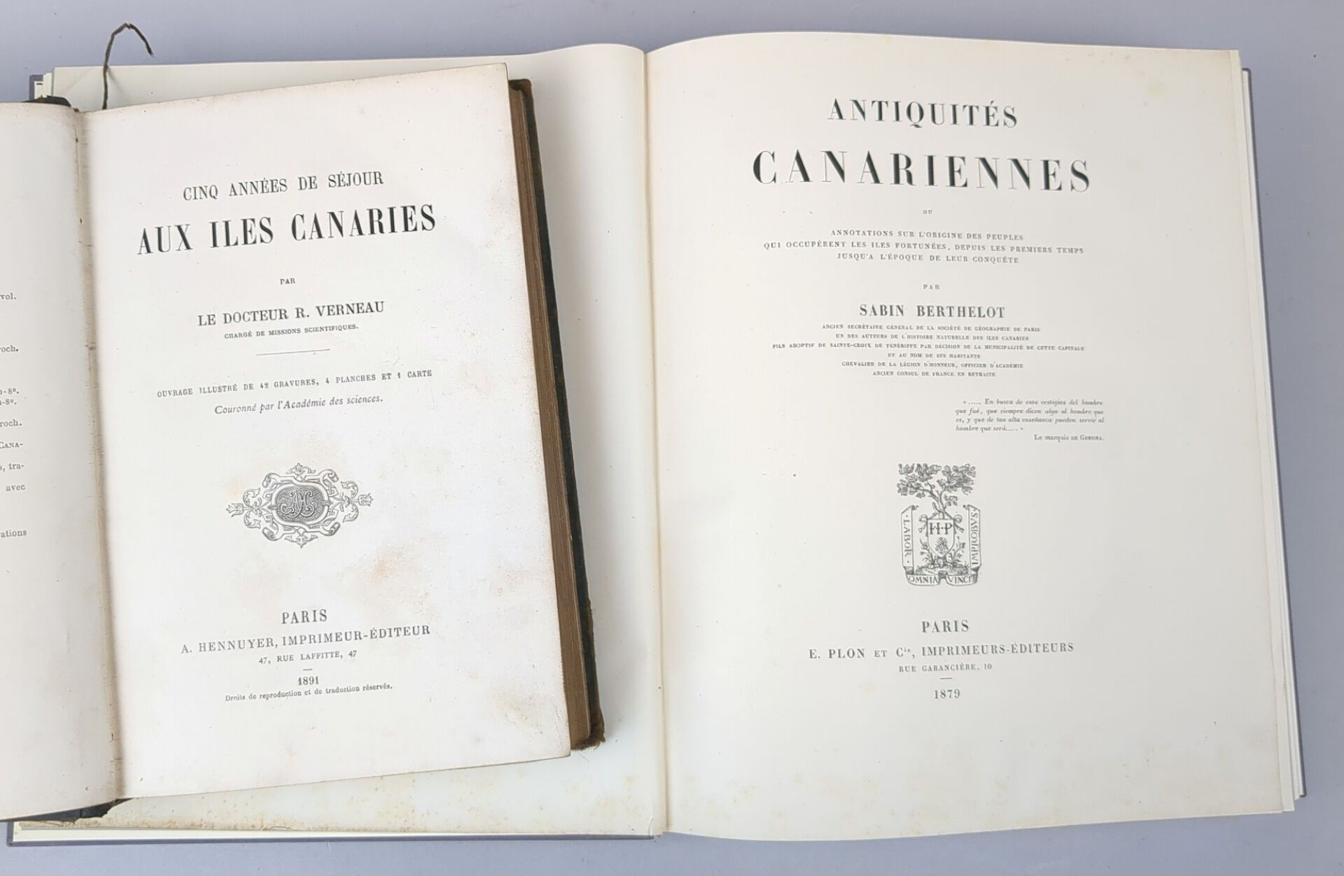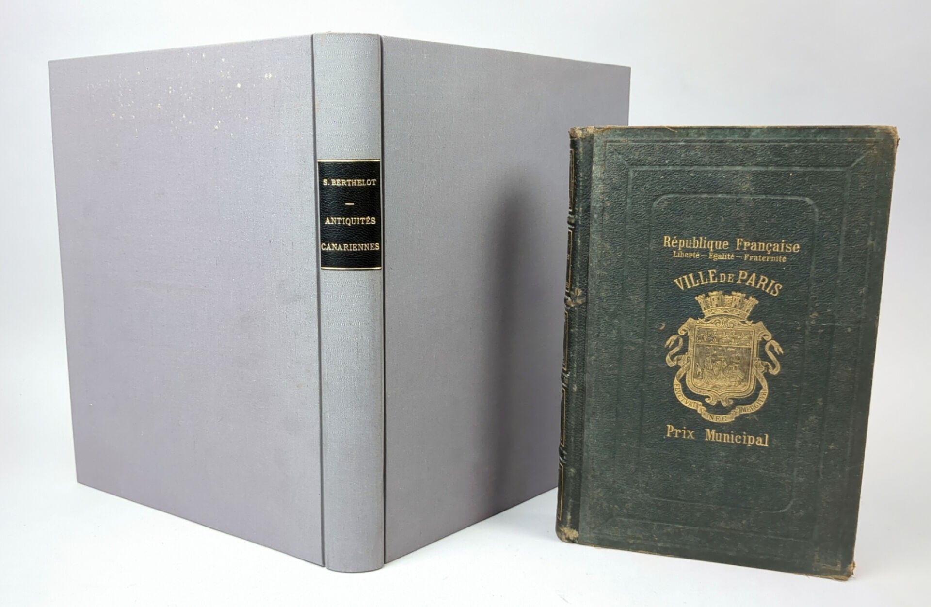2/ BERTHELOT (Sabin). Antiquités canariennes ou Annotations sur l'origine des peuples qui occupèrent les îles Fortunées, depuis les premiers temps jusqu'à l'époque de leur conquête. Paris, Plon et Cie, 1879. One large volume in-8, full modern cloth, leather title-piece, cons. cover (Ateliers Laurenchet). (2) ff, 251 pp, (1) f.