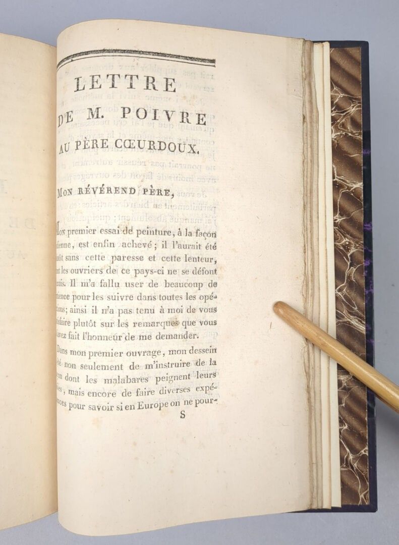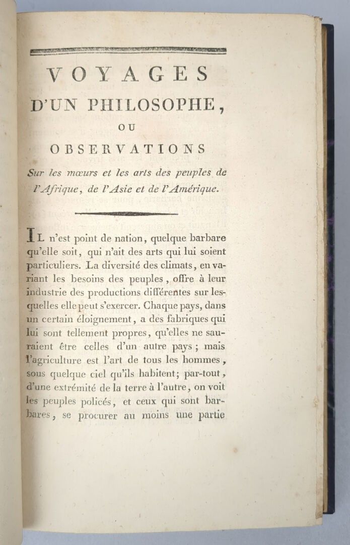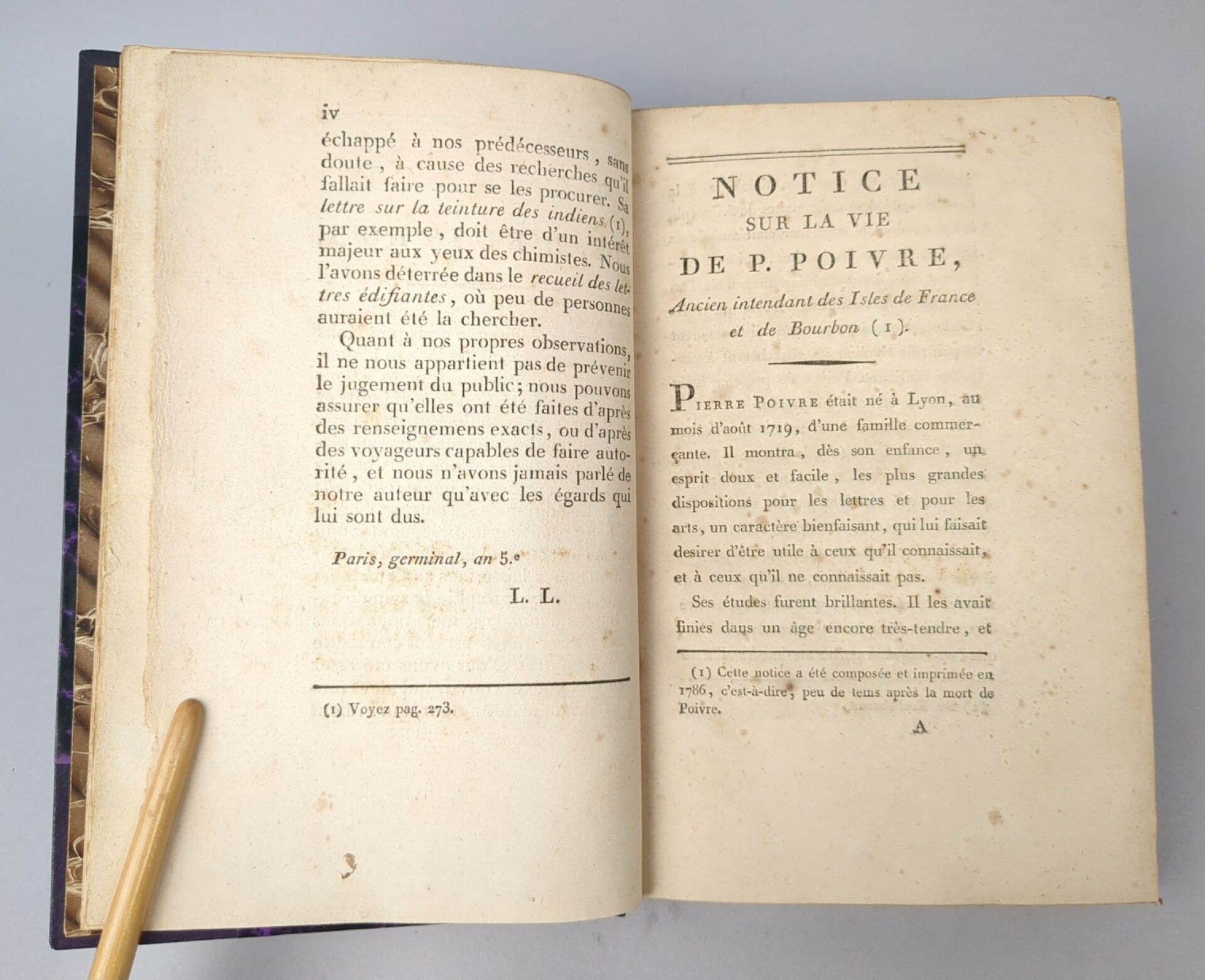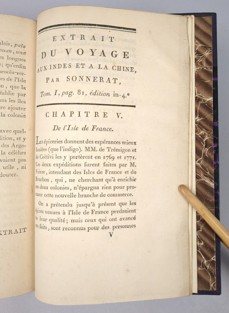 "Rare voyage also containing the travel reports of frigate lieutenant Etcheverry in the Philippines and the Moluccas. A French horticulturist and colonial administrator, Pierre POIVRE (1719-1786) is best known for having transplanted and cultivated spices such as cloves and nutmeg on the islands of Mauritius and Reunion, thus breaking the Dutch monopoly on the spice trade".