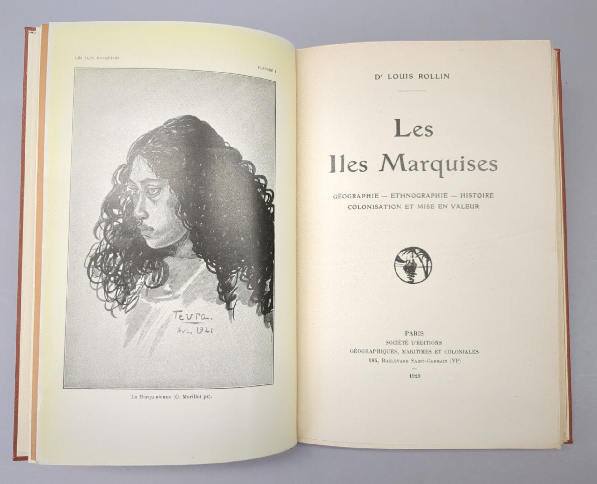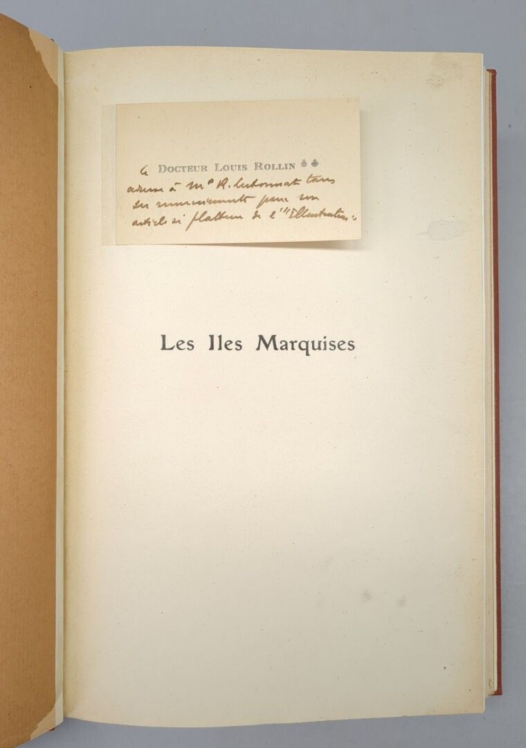 [Polynesia] ROLLIN (Dr. Louis). Les Îles Marquises (Géographie, Ethnographie, Histoire et Colonisation) P., Sté d'Ed. Maritimes et coloniales, 1929. One volume in-8, full cloth post, leather title-piece, cons. cover (Ateliers Laurenchet).334 pp.