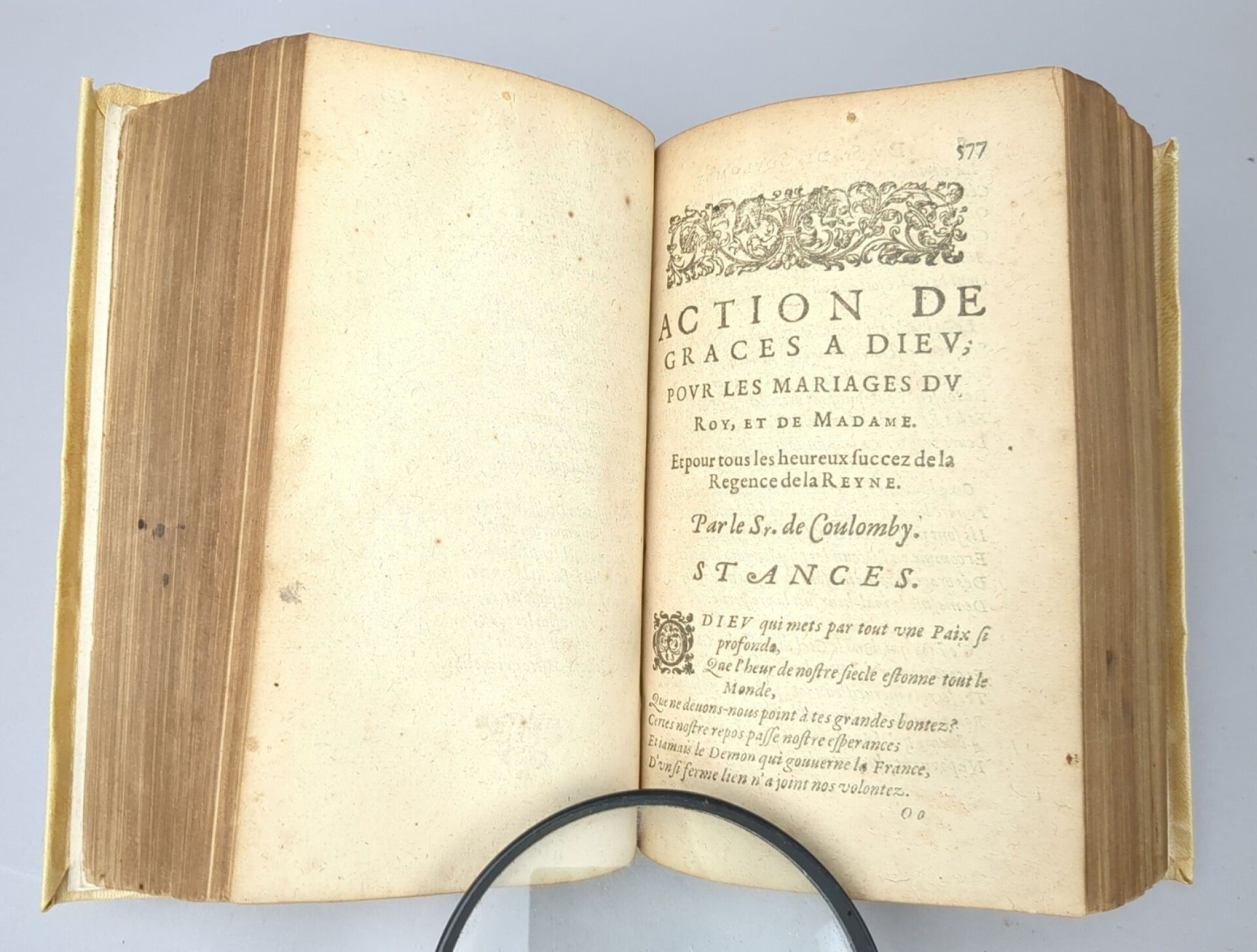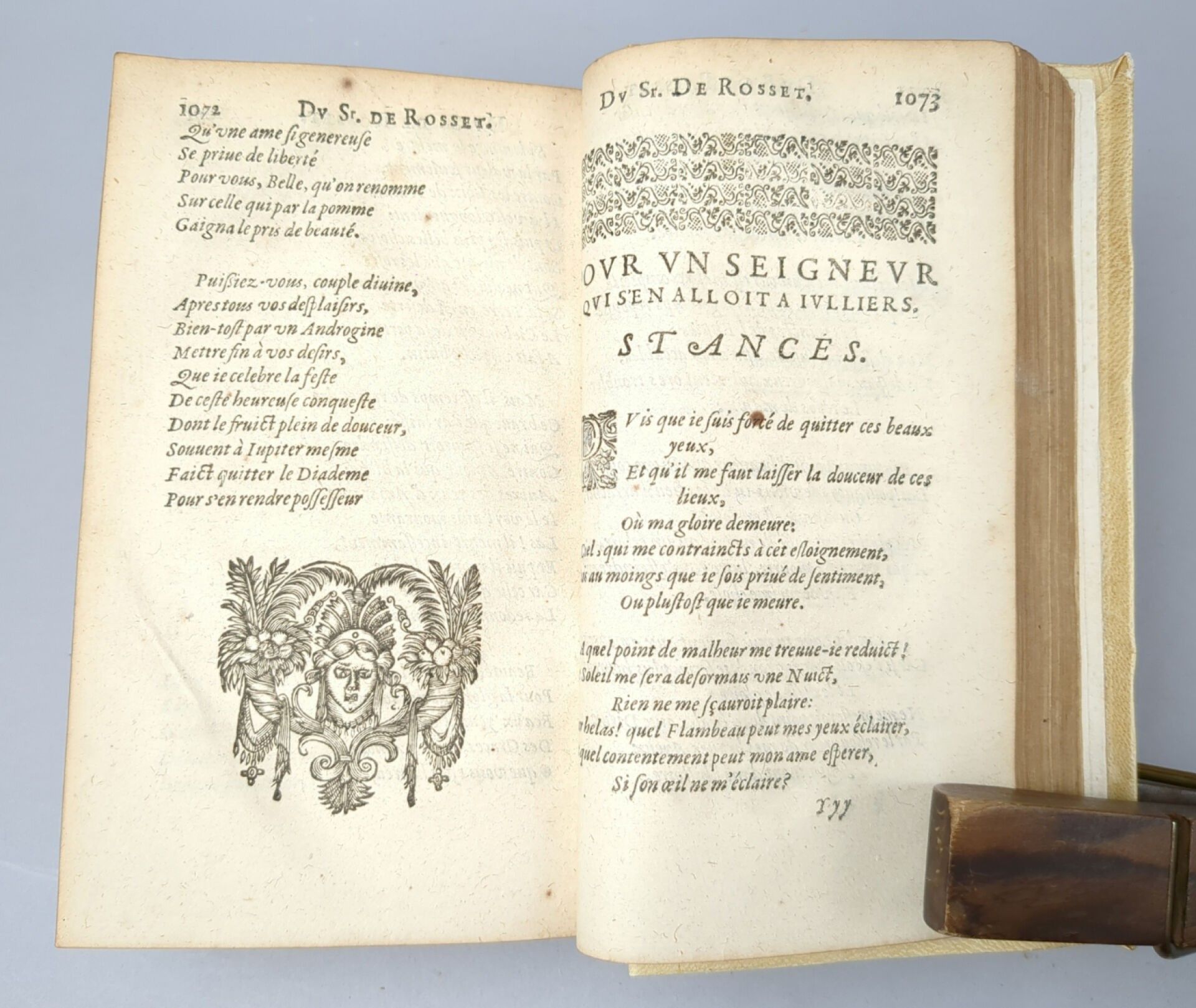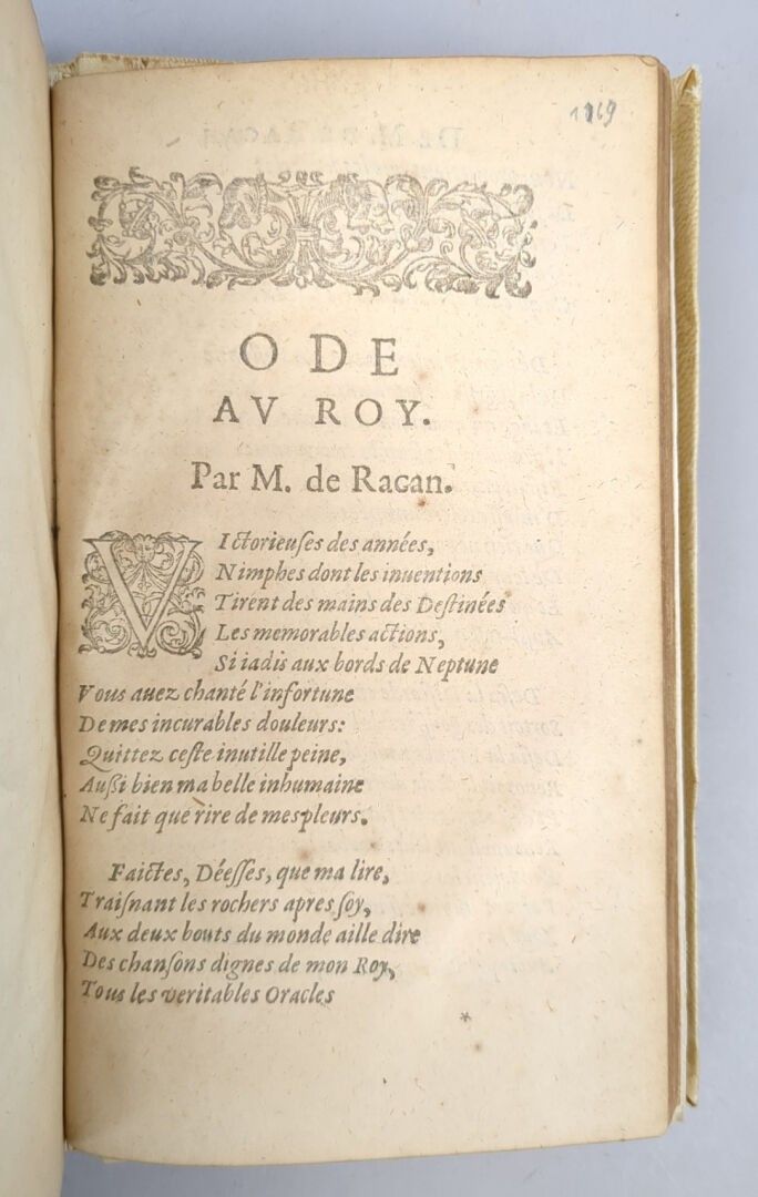 This volume is important because it includes the first poems by Honorat de Bueil, seigneur de Racan (1589-1670), all unpublished: "this collection must therefore be considered as the true original edition of Racan" (Tchemerzine). These poems occupy 16 unnumbered leaves bound at the end of the volume, just before the Table.