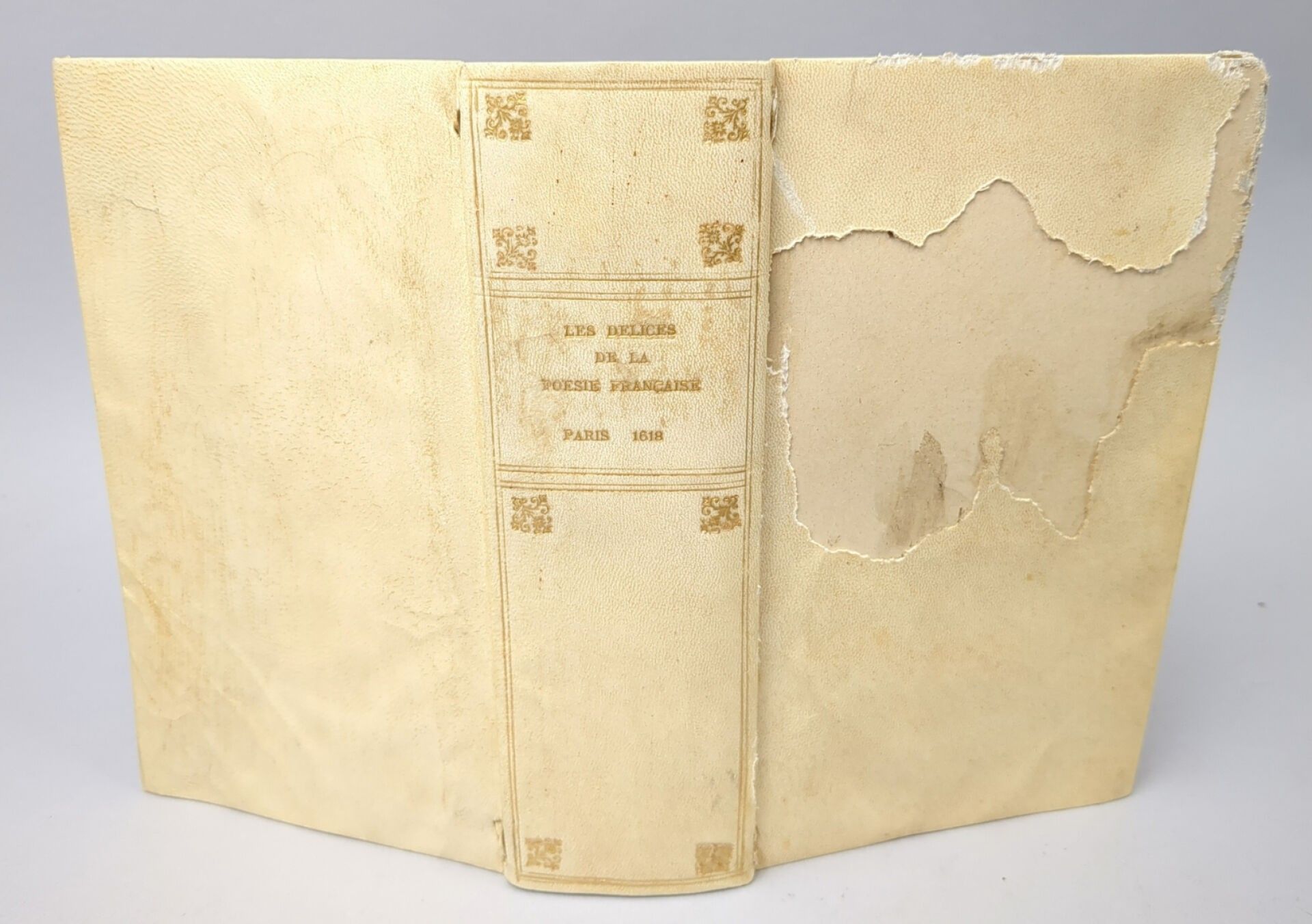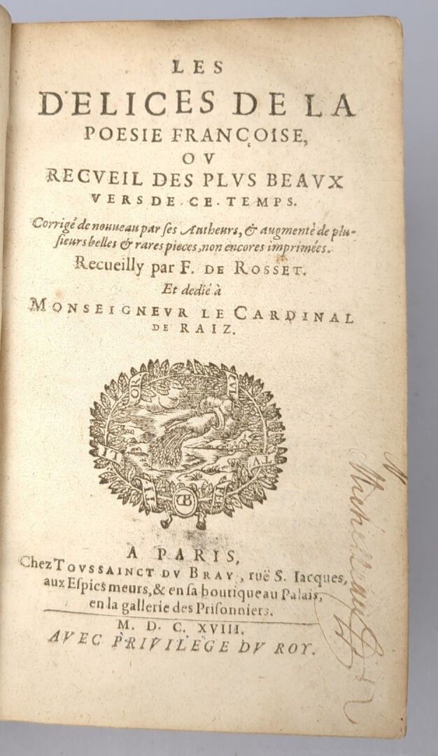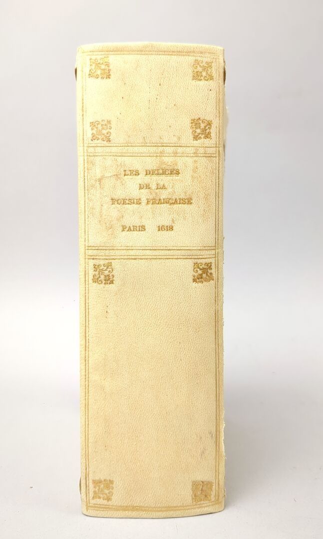 ROSSET (Fr. de). Les délices de la poésie françoise ou dernier recueil des plus beaux vers de ce temps. Corrigé de nouveau par ses Auteurs et augmenté de plusieurs belles et rares pièces non encore imprimées. Paris, Toussaint du Bray, 1618. One volume in-8 full vellum with posterior flaps, gilt title, all edges gilt. Missing vellum on first cover.
