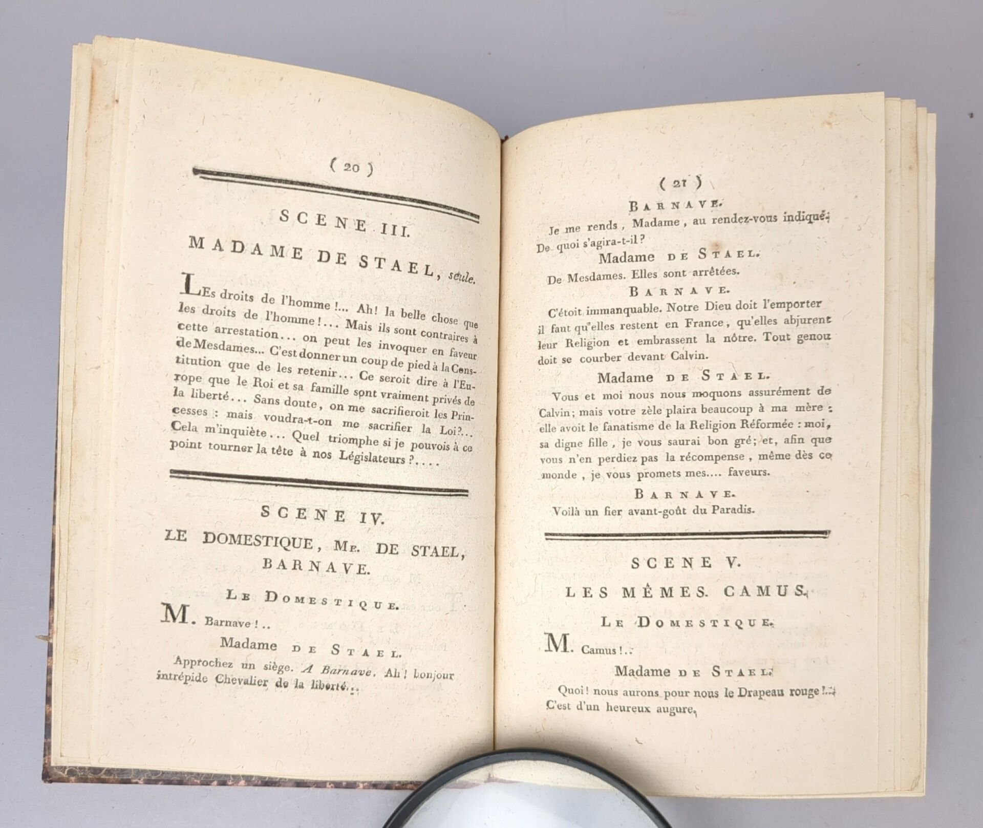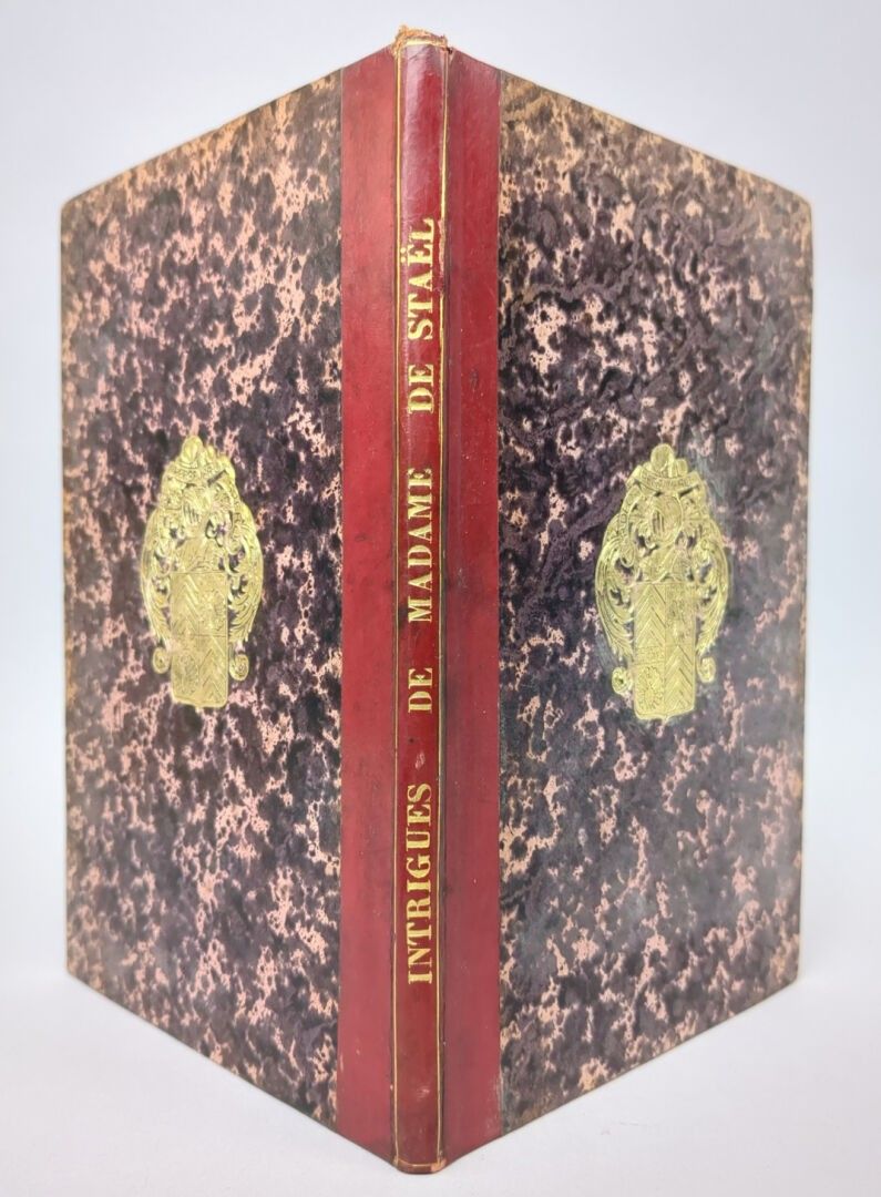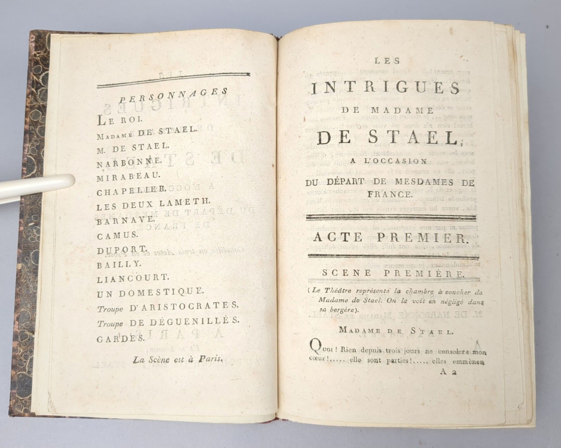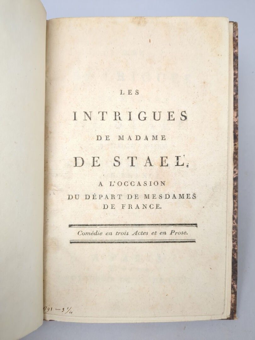 [Anonymous] Les intrigues de Madame de Staël à l'occasion du départ de Mesdames de France. Comedy in three Acts and in Prose. A Paris, de l'impr. d'un Royaliste et se trouve au Boudoir de Mme de Staël, s.d. [1791]. One volume in-8, 19th century half calf, coat of arms in centre of boards. 59 pp.