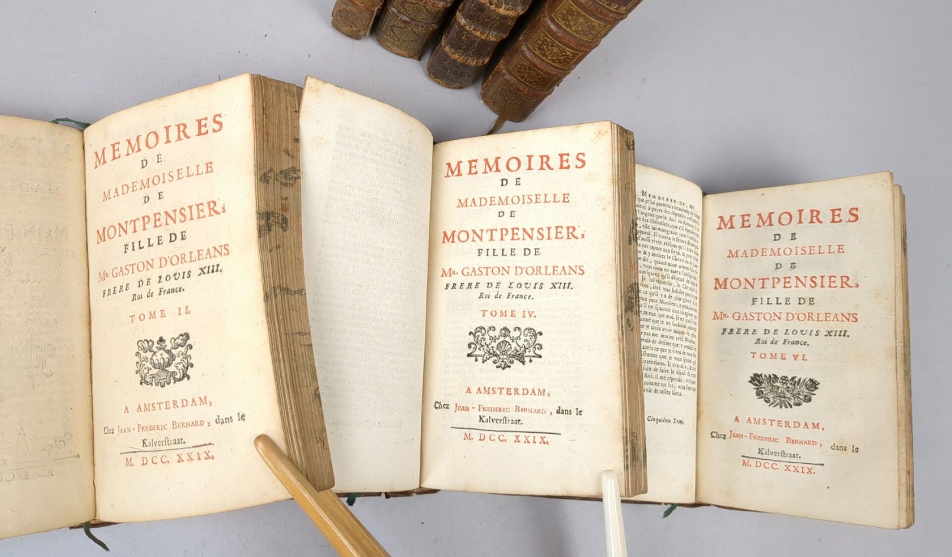 1/ MONTPENSIER (Anne Marie Louis d'Orléans, duchesse de). Mémoires de Mademoiselle de Montpensier, fille de Mr. Gaston d'Orléans, frère de Louis XIII. Amsterdam, Jean-Frédéric Bernard, 1729. 6 volumes bound in 3 volumes.