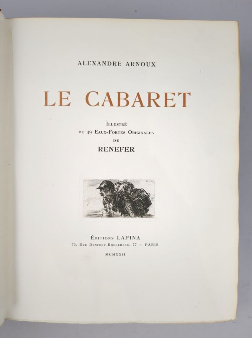 ARNOUX (Alexandre). Le Cabaret. Illustrated with 49 original etchings by RENEFER. Paris, Lapina, 1922. One volume in-4, cornered half-chagrin, spine ribbed, gilt head, covers and spine preserved. Spine lightened, slight rubbing, int. fresh.