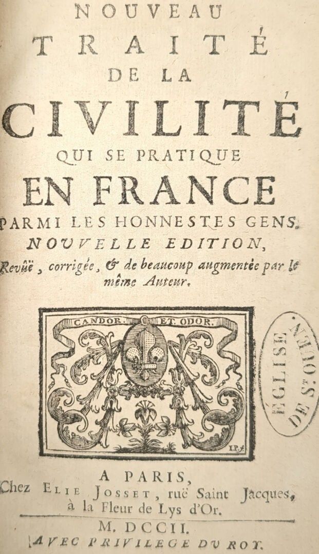 [COURTIN (Antoine de). Nouveau Traité de la civilité qui se pratique en France parmi les honnestes gens. Paris, Josset, 1702. One volume in-12, full contemporary basane, spine ribbed and decorated. (8) ff., 338 pp., (9) ff.