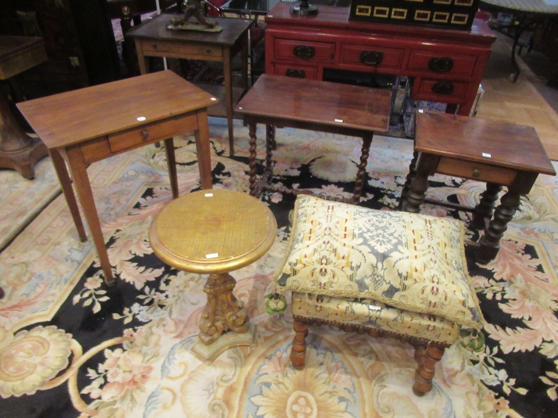 Three side tables and a gilded wooden pedestal table, plus a stool. All in the