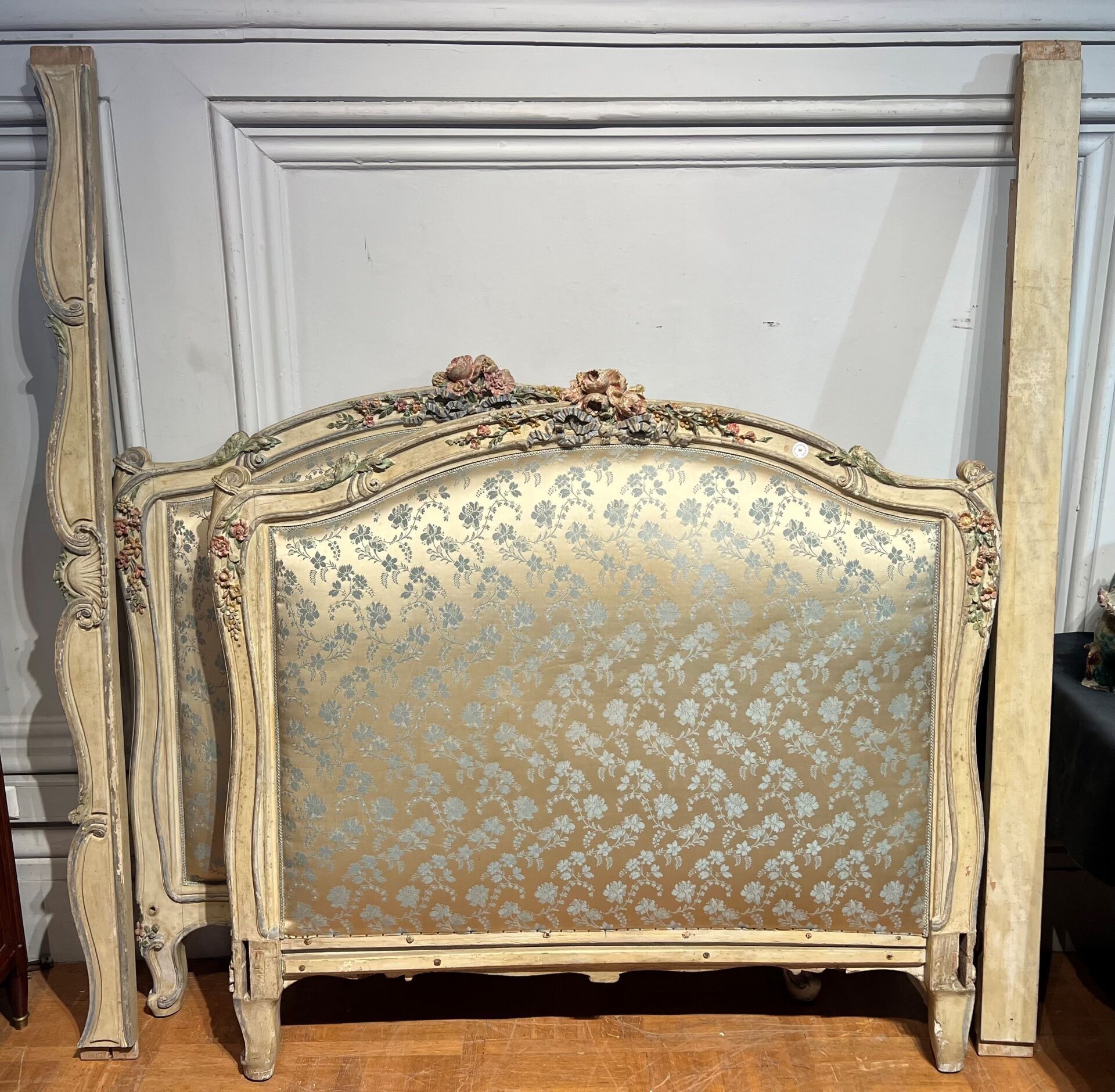 Large repainted and rebacked wooden bed decorated with ribbo…