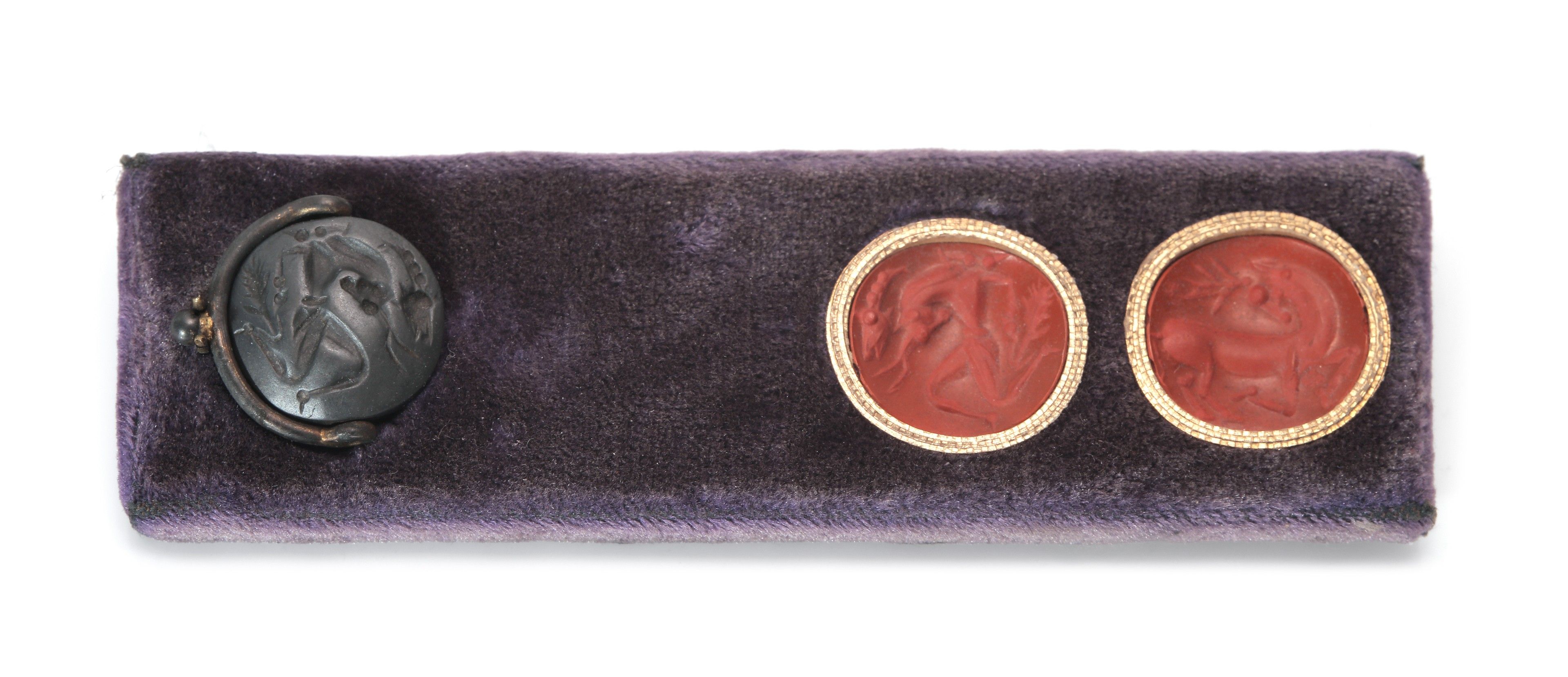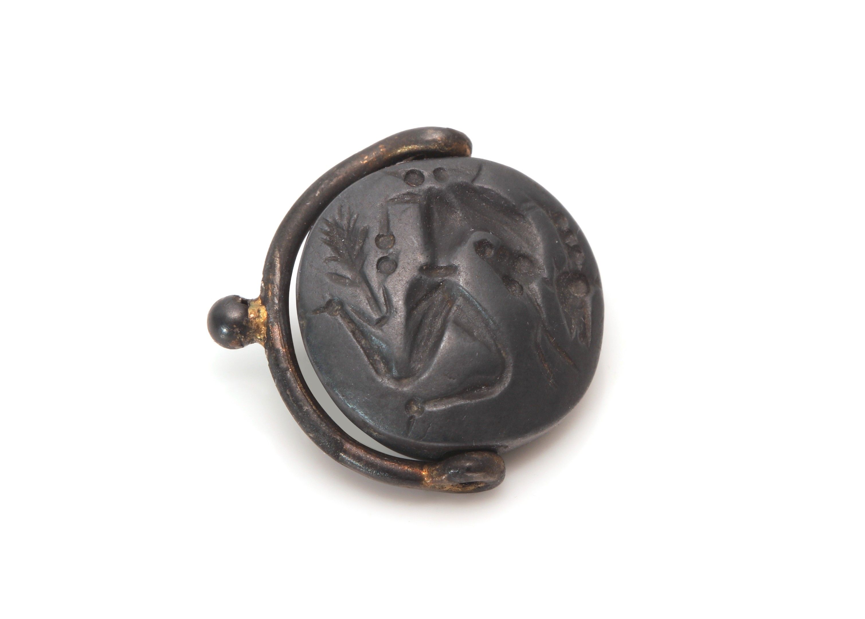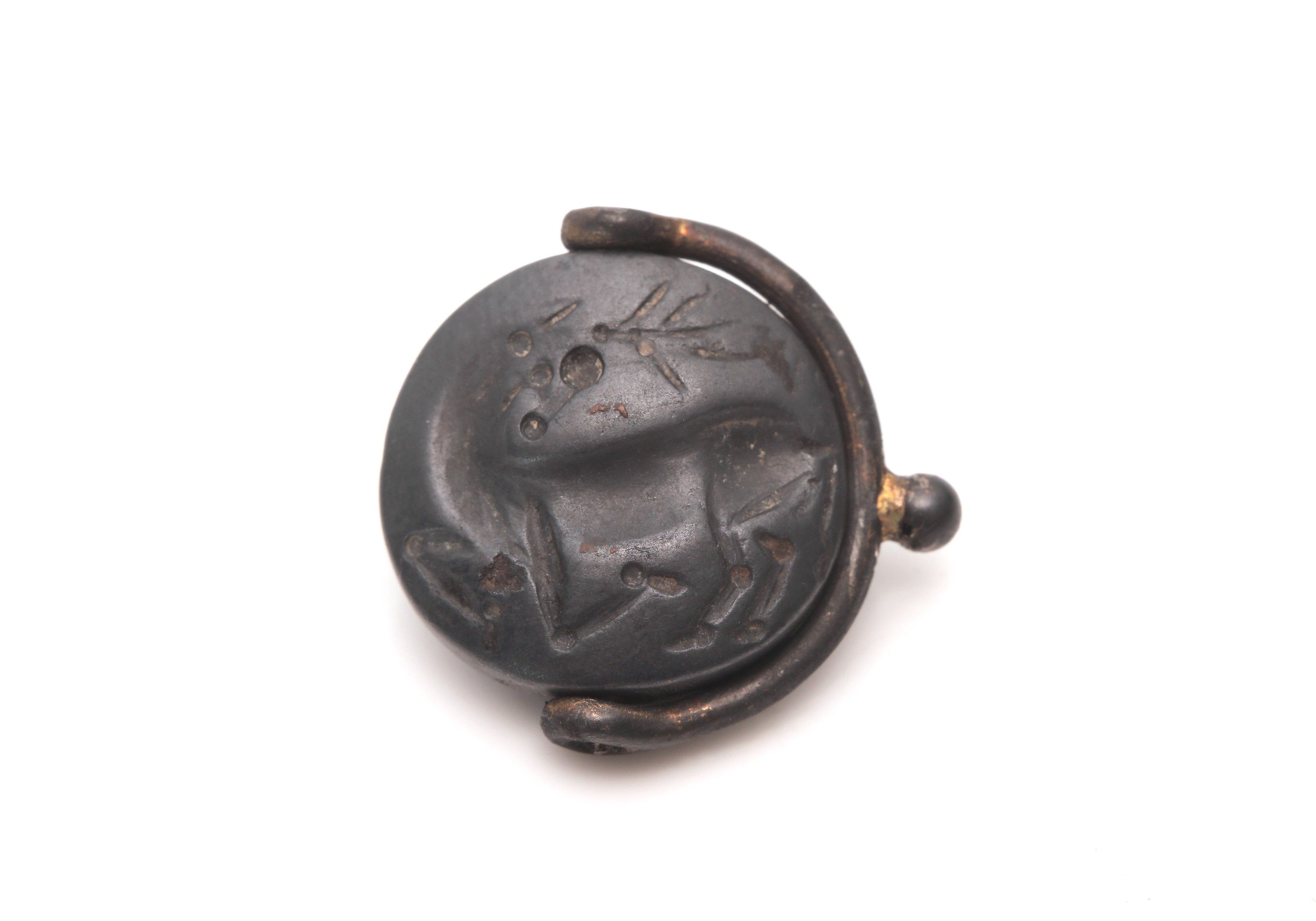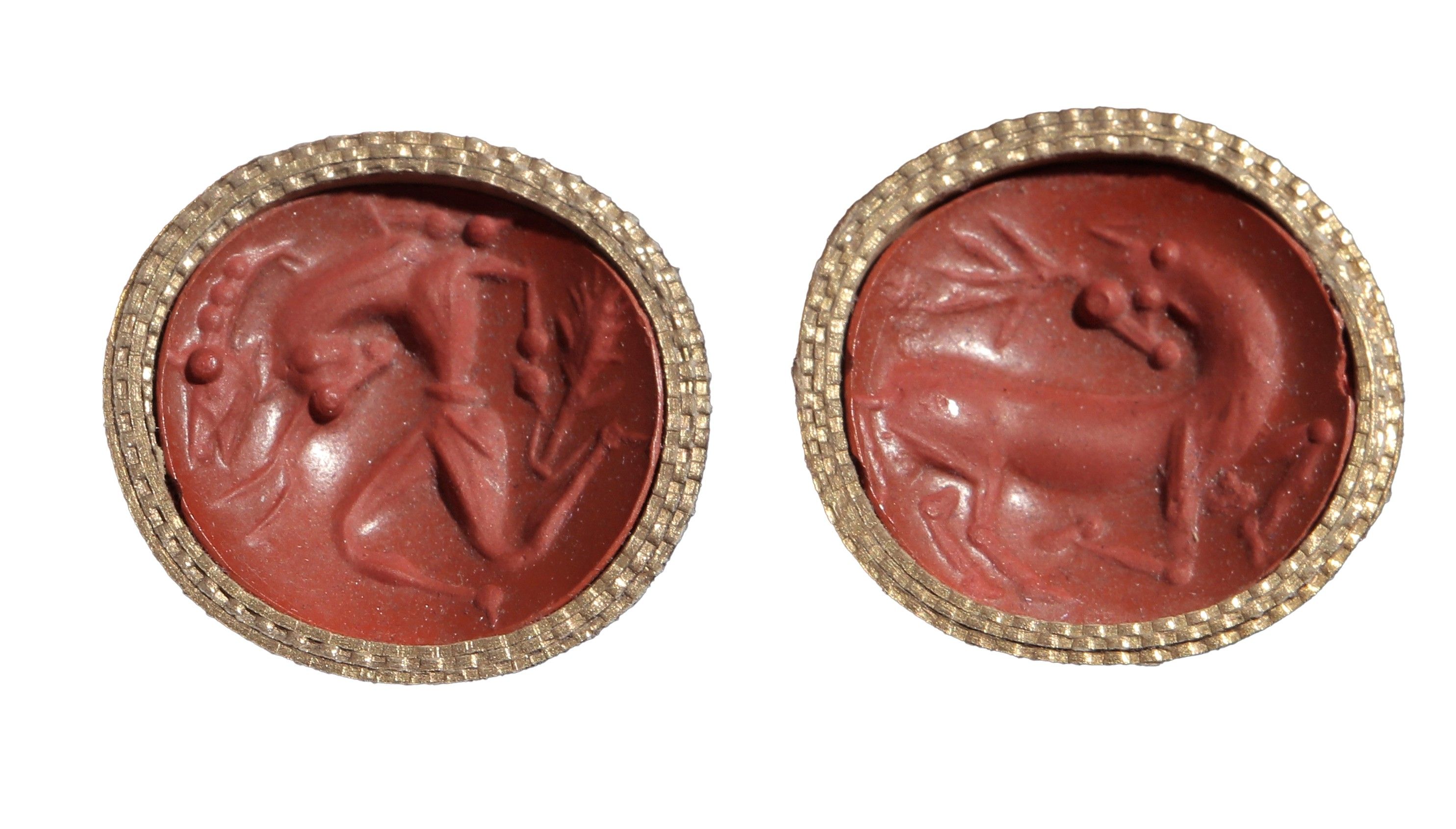 Double-sided lentoid seal. Late Minoan II-III, 1450-1375 BC Hematite D. 1.6 cm Excellent condition Presented on its wood and crimson velvet mounting dating from the early 20th c., with its impressions. On the back, inscriptions in ink and graphite: haematite 9 £ 24. Illegible inscriptions Knossos Side A: a fantastic half-man, half-bull: the upper part of a bull or cow (head and forequarters) is attached at the waist to human legs. In front, a goat's head. In the field, a branch of vegetation completes the decoration. Side B: a stag in profile, forequarters curved. Late Minoan double-sided lentoid seal