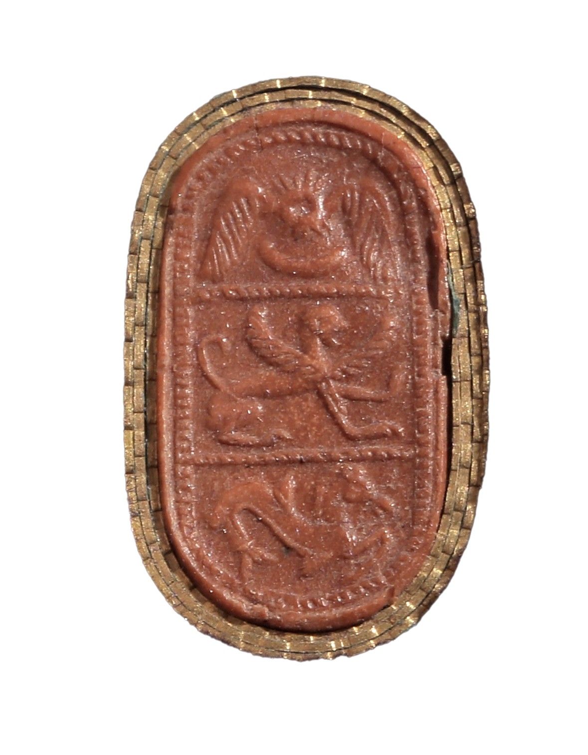 Ring with oval bezel. Solid ring with raised oval bezel engraved in three registers. In the upper field, a winged, radiant solar disc. Below, a crescent moon. In the central field, a seated sphinx. Below, a seahorse.