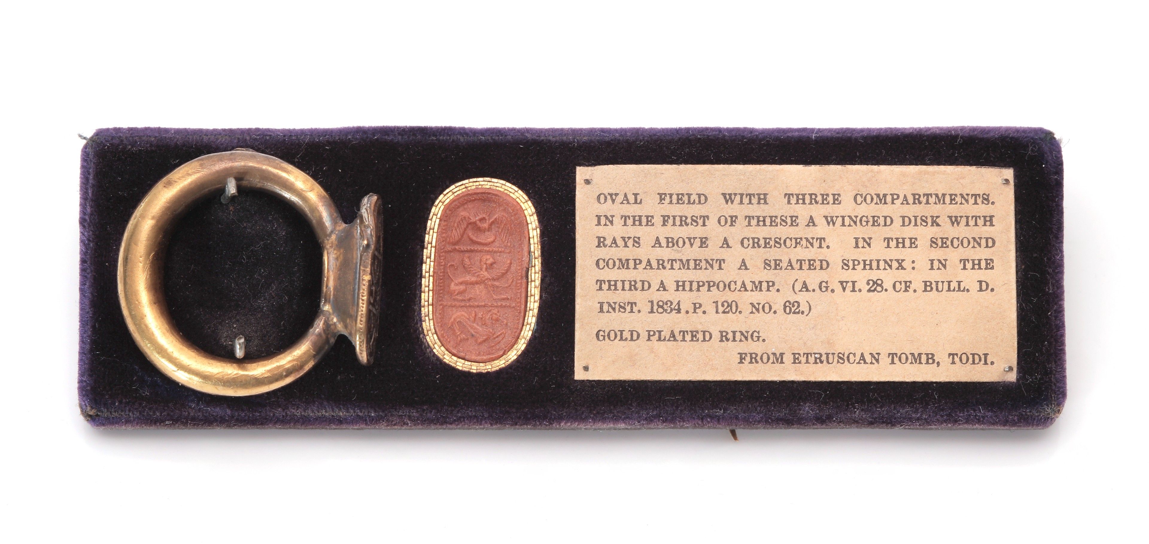 Presented on its crimson velvet and wood mounting dating from the early 20th century, with an imprint and a label: ( ) FROM ETRUSCAN TOMB, TODI