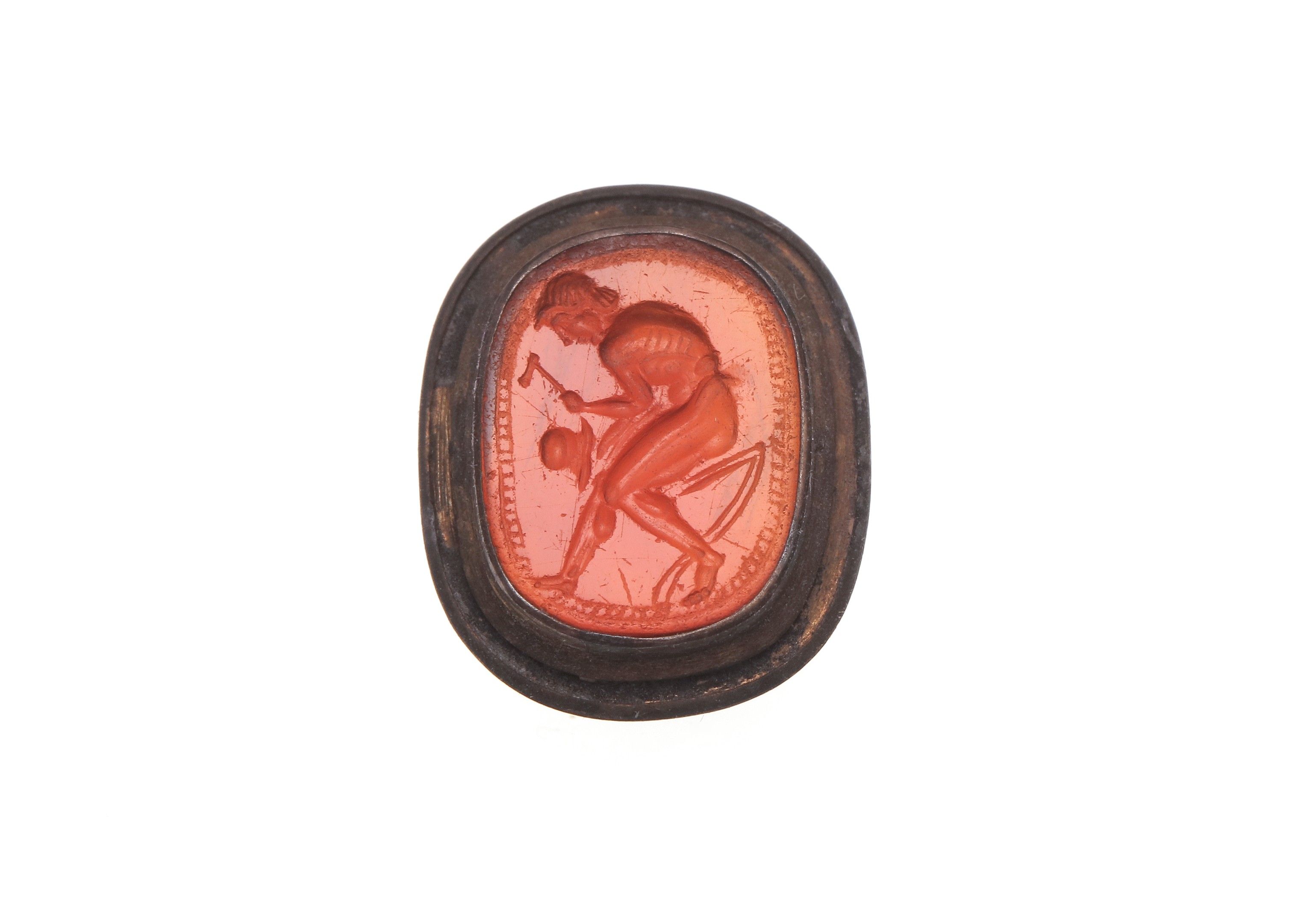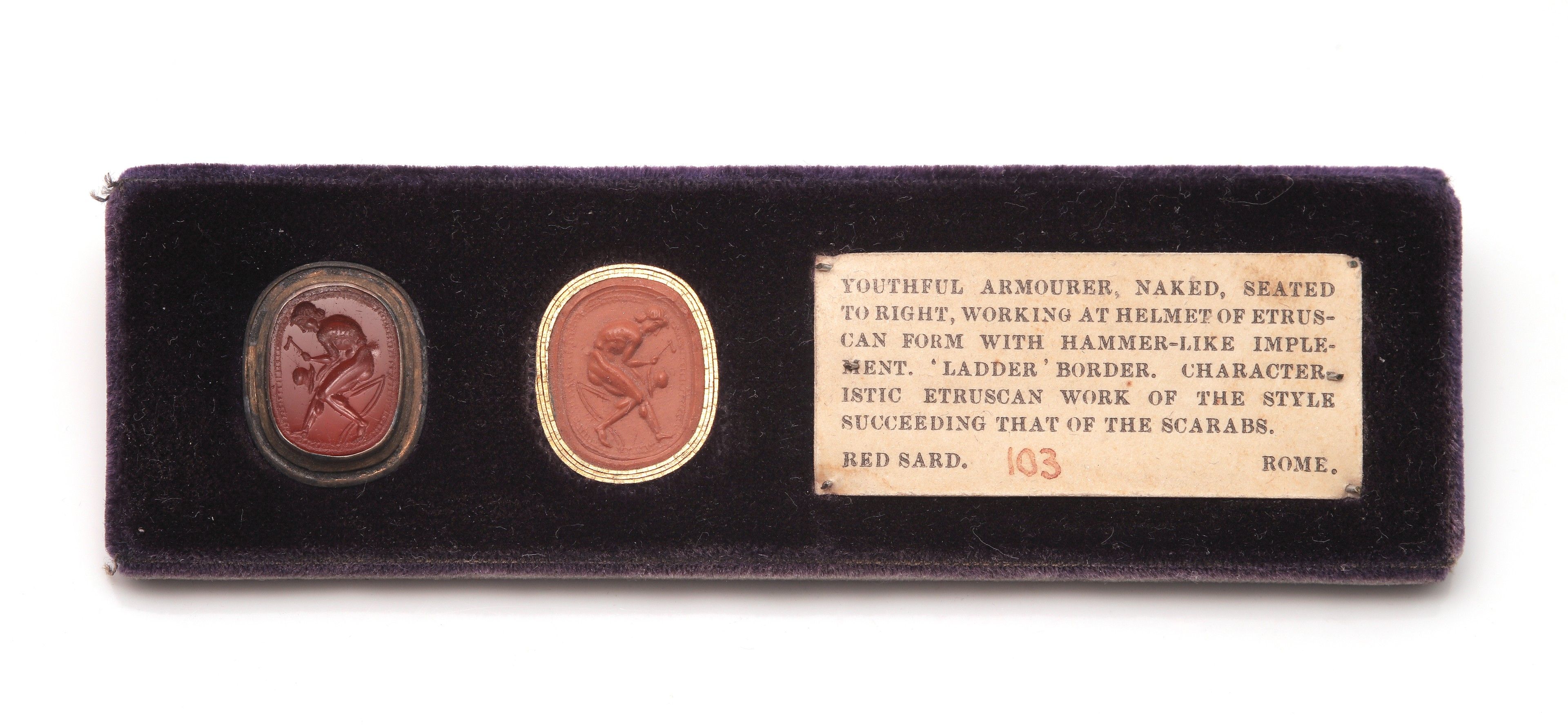 Intaglio. A naked man seated on the left, probably an armourer, holding a hammer and shaping a helmet. Fine hatched border. Etruria, 5th century BC Carnelian H. 1.27 cm Presented on its wood and crimson velvet mounting, dating from the early 20th century, with an imprint and a label: ( ) ROME On the back a numbered label: 57 Inscribed in graphite: 64 /£ 24 A 5th century BC Etruscan intaglio depicting a craftsman hammering a helmet