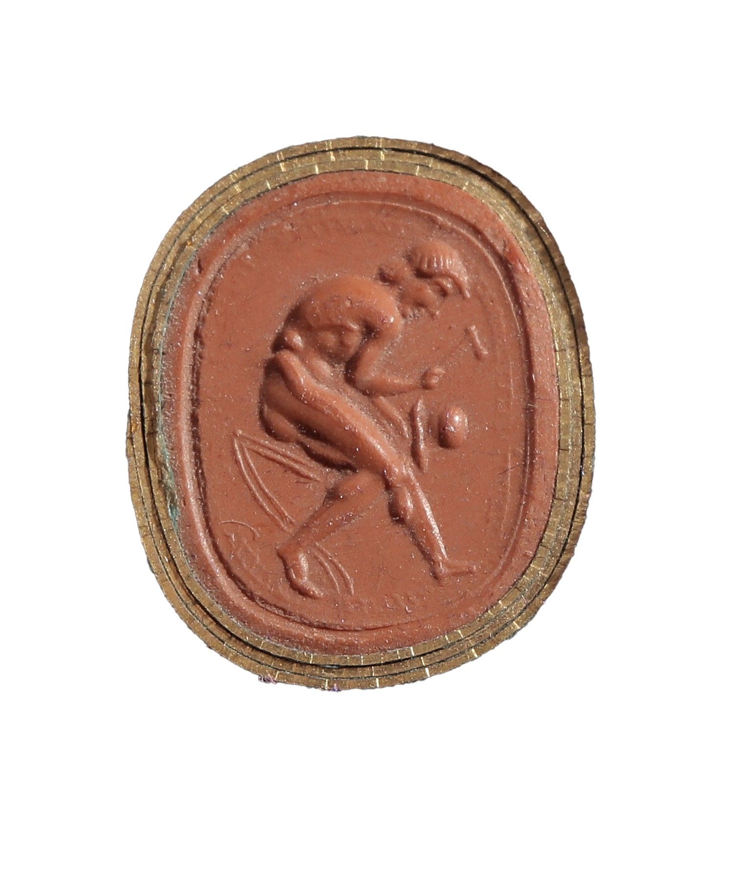 Intaglio. A naked man seated on the left, probably an armour…