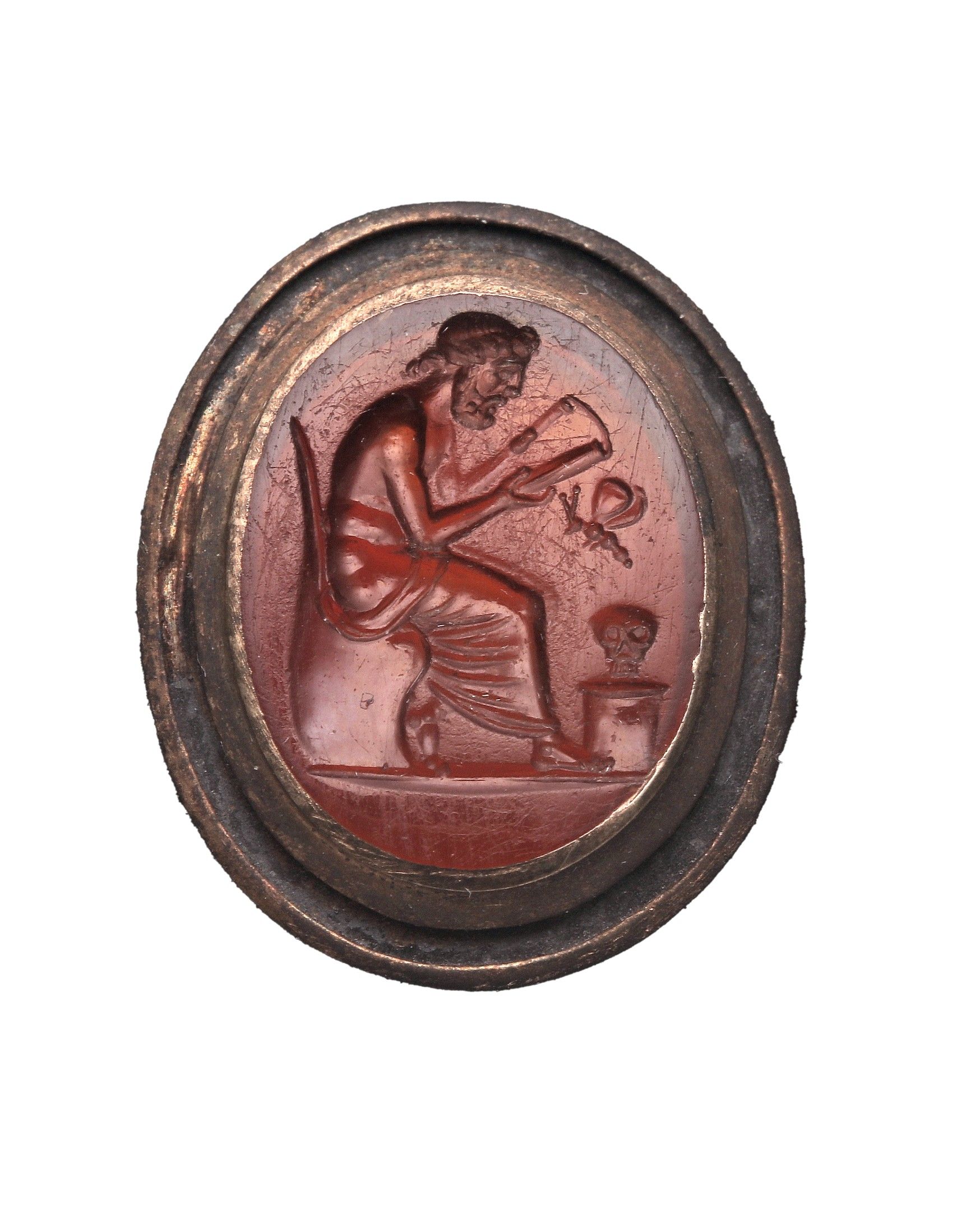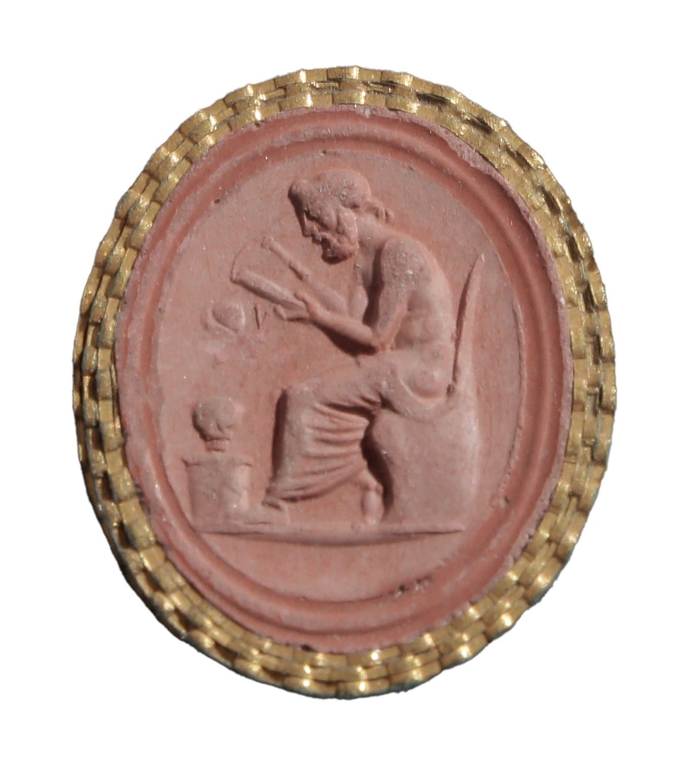 Intaglio. A philosopher seated in profile, reading a volumen…