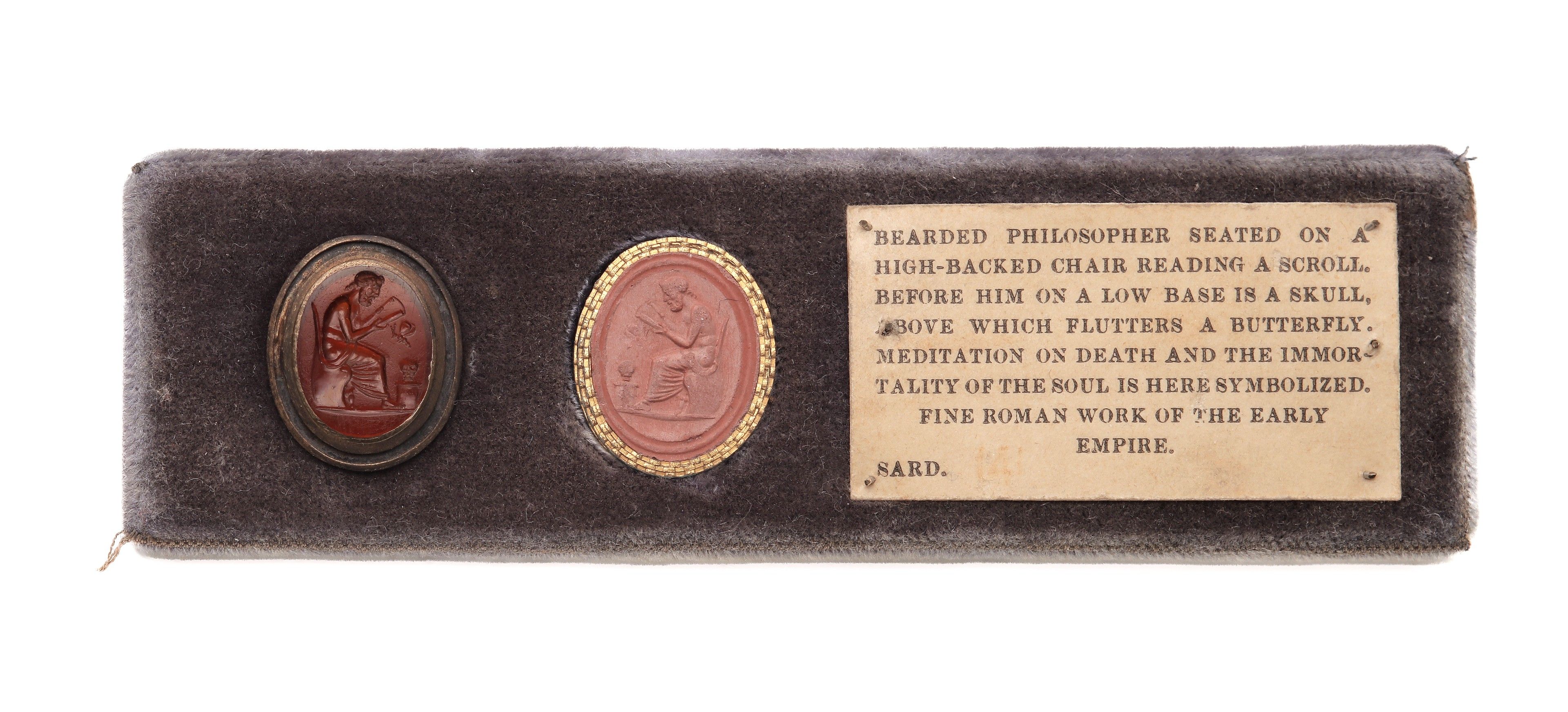 Presented on its wood and crimson velvet mounting dating from the early 20th century, with an imprint and a label: ( ) MEDITATION ON DEATH AND THE IMMORTALITY OF THE SOUL IS HERE SYMBOLISED. FINE ROMAN WORK OF THE EARLY EMPIRE