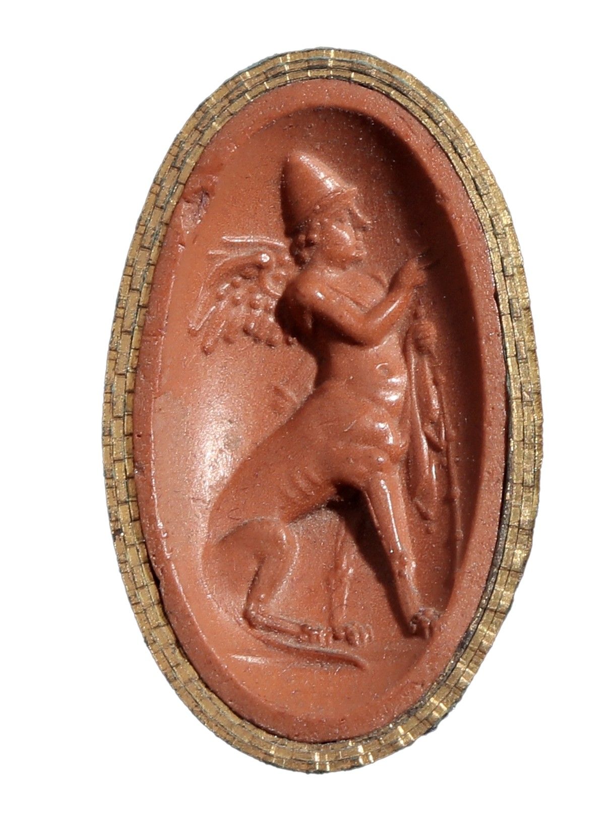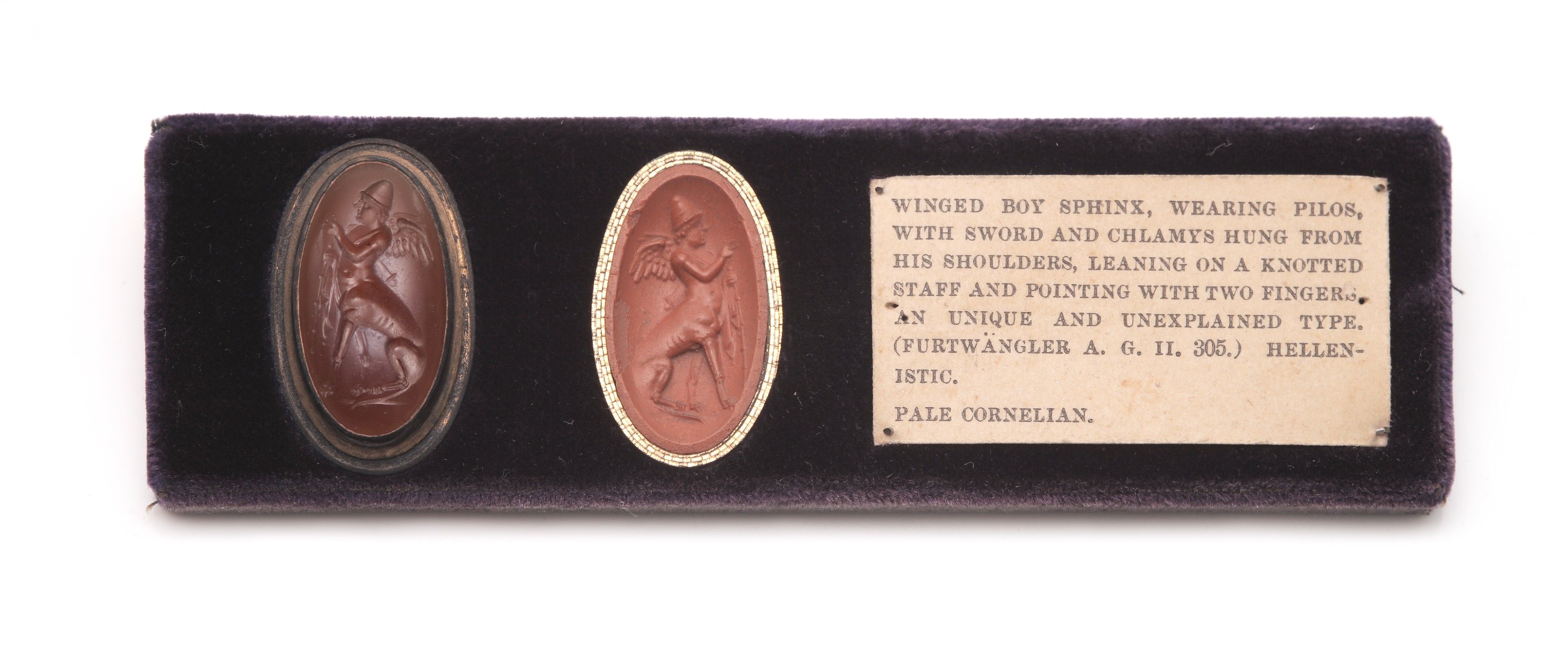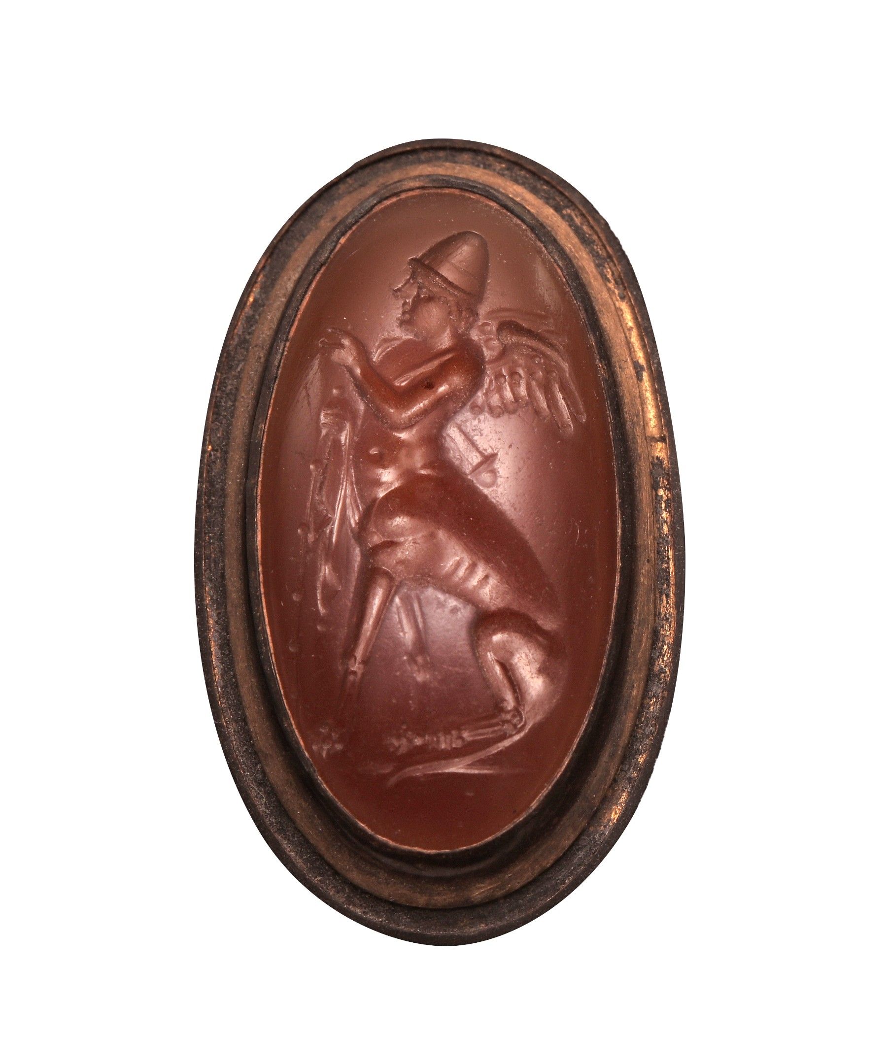A rare Hellenistic intaglio depicting a winged boy sphinx.