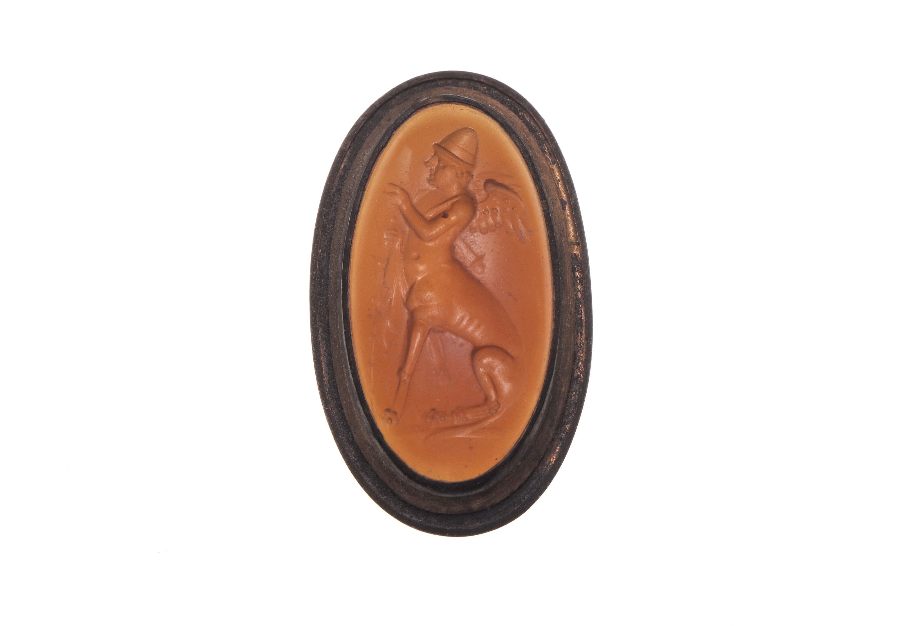 Intaglio. A sphinx with a winged boy's bust, wearing a pilos…