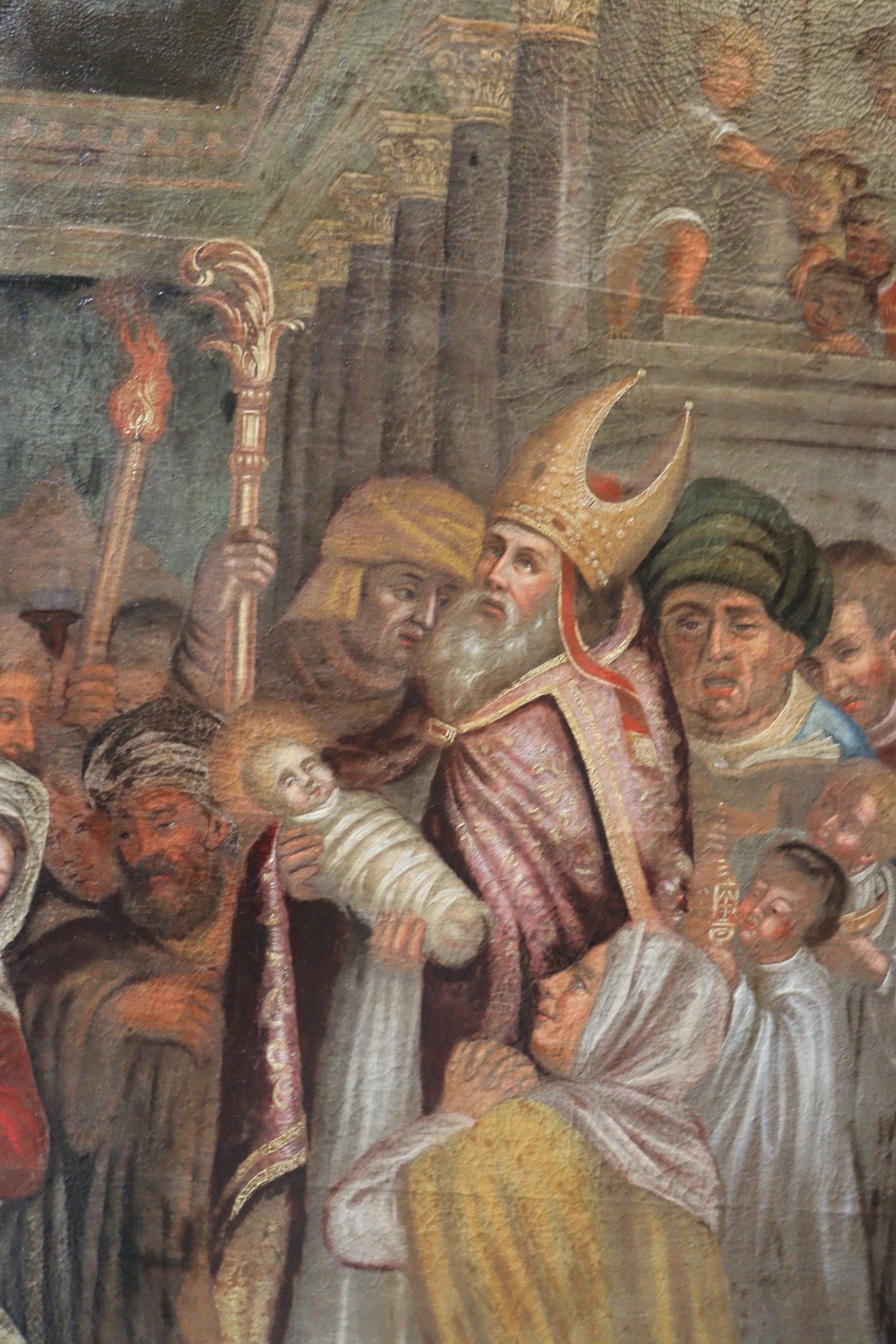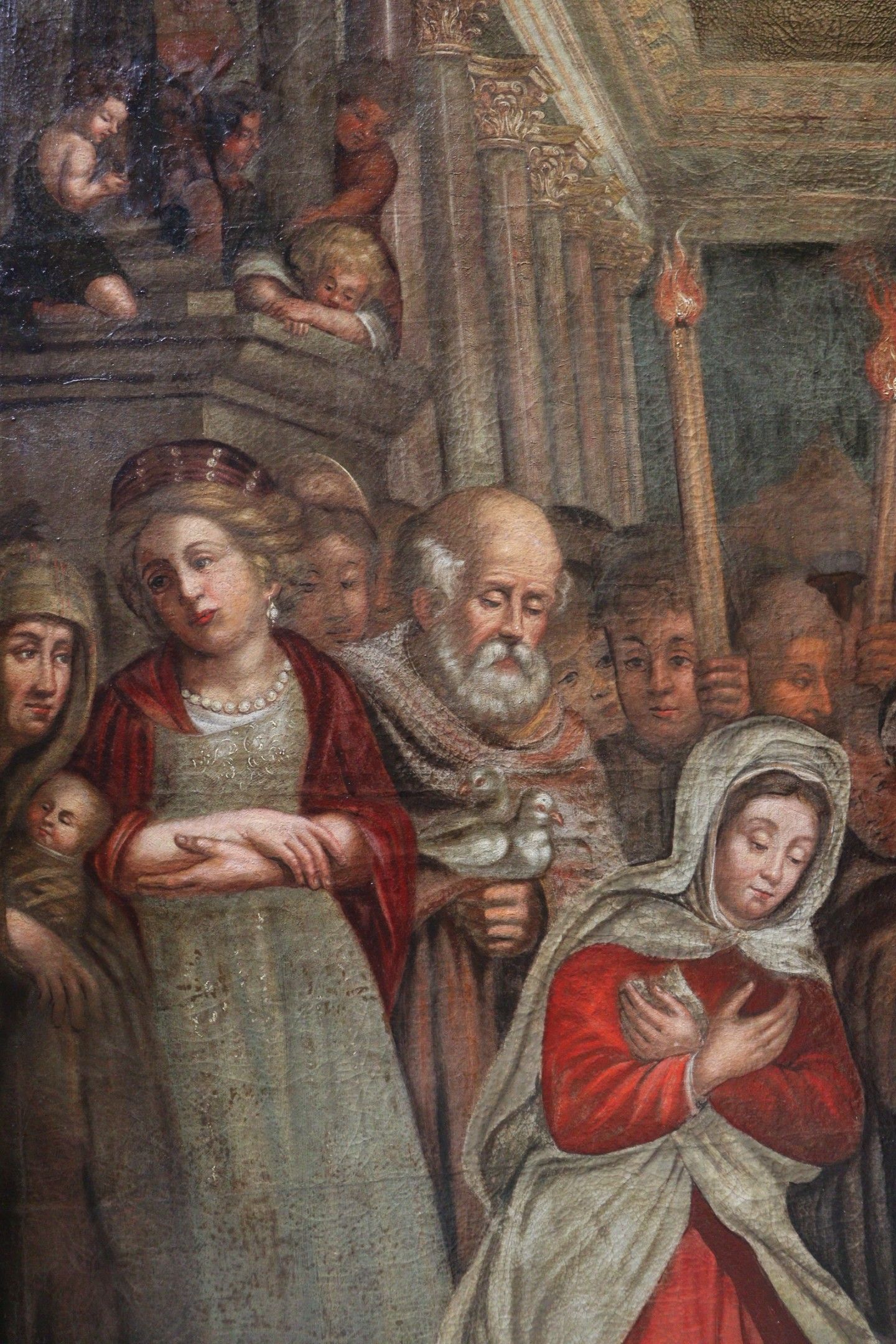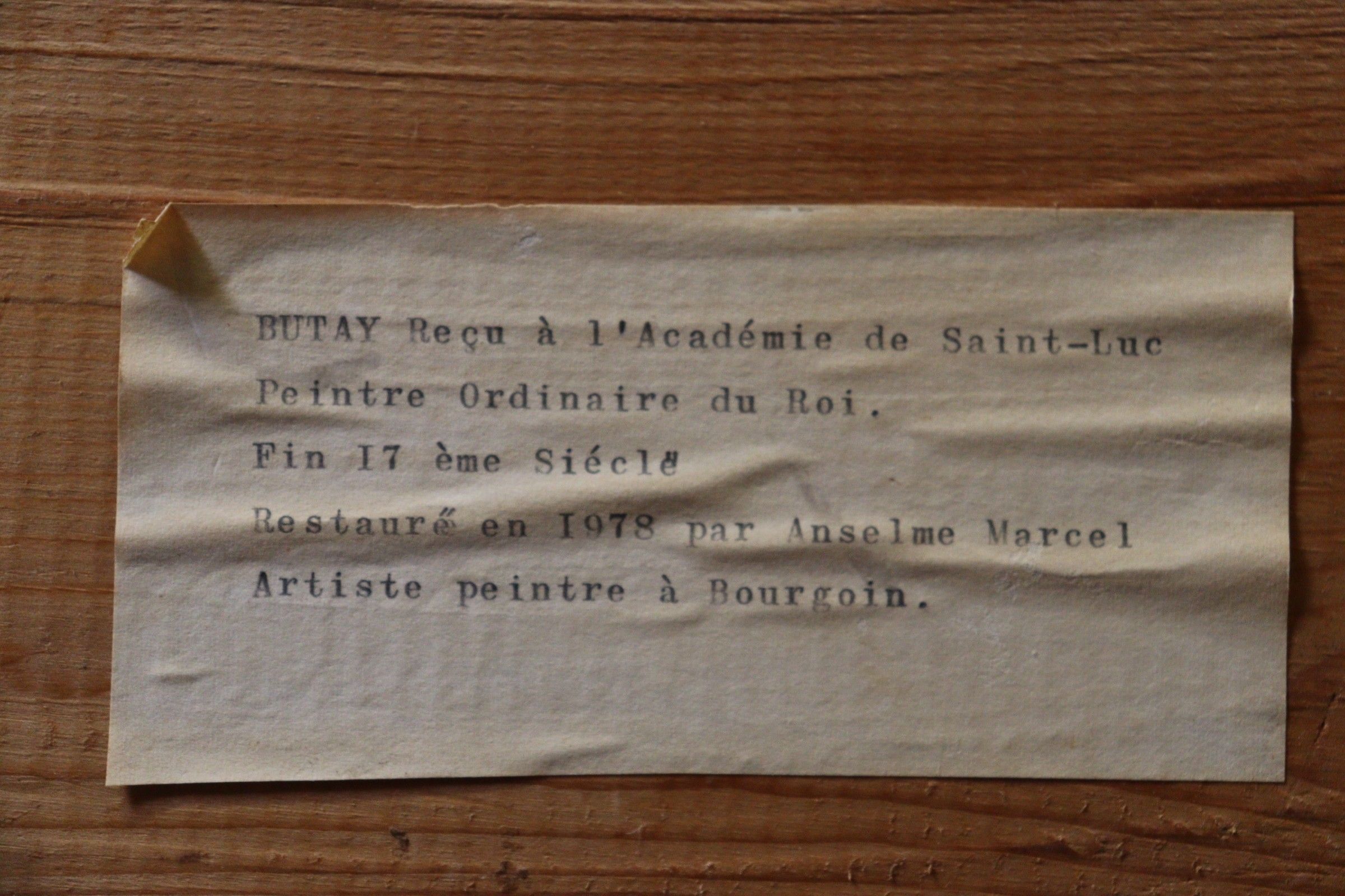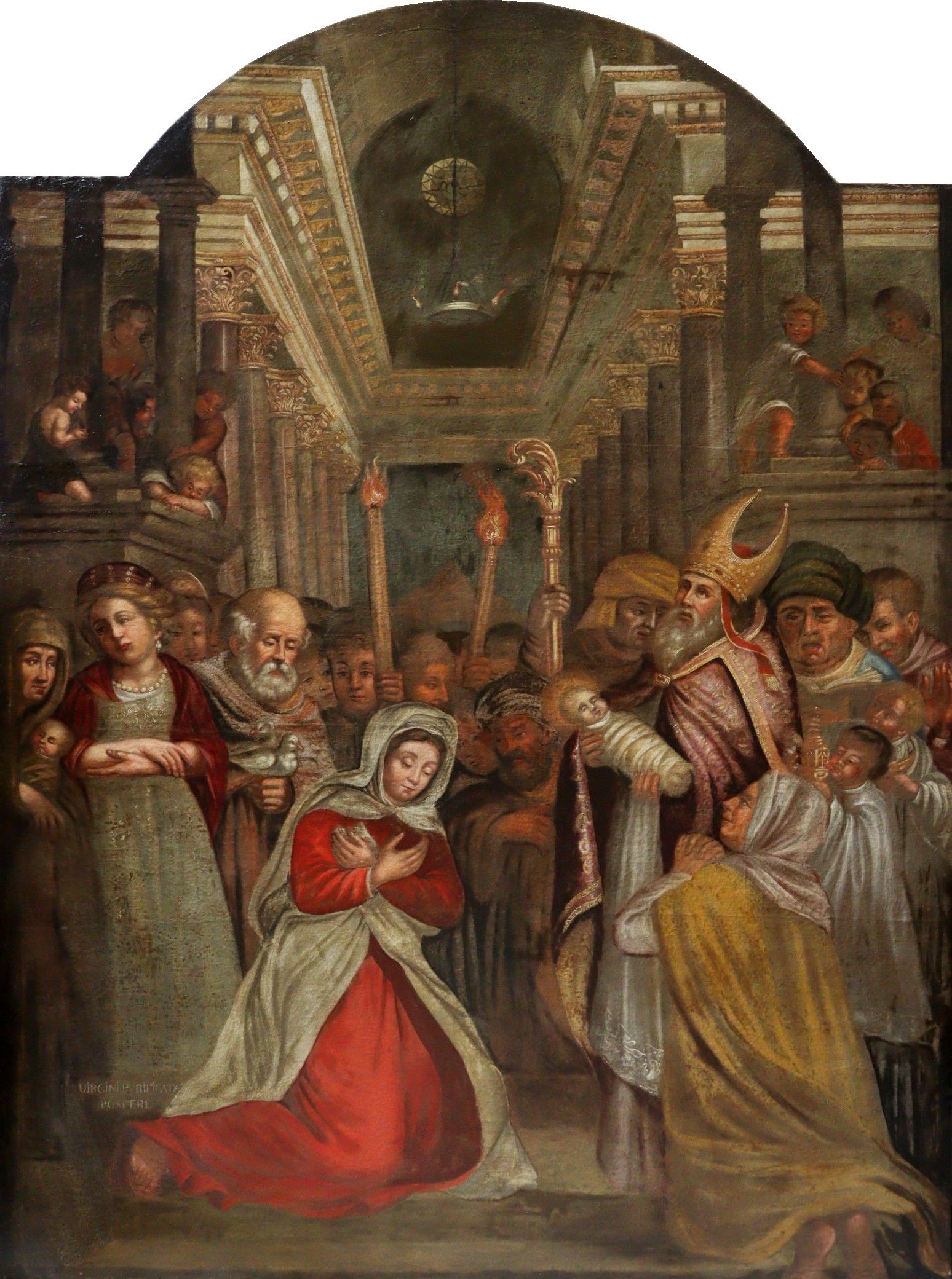 BUTAY (Late 17th century). Presentation at the temple. Oil on canvas, the upper part curved. Inscribed lower left "virgini purificata posuere". Restoration in 1978 by Anselme MARCEL. 188 x 132 cm