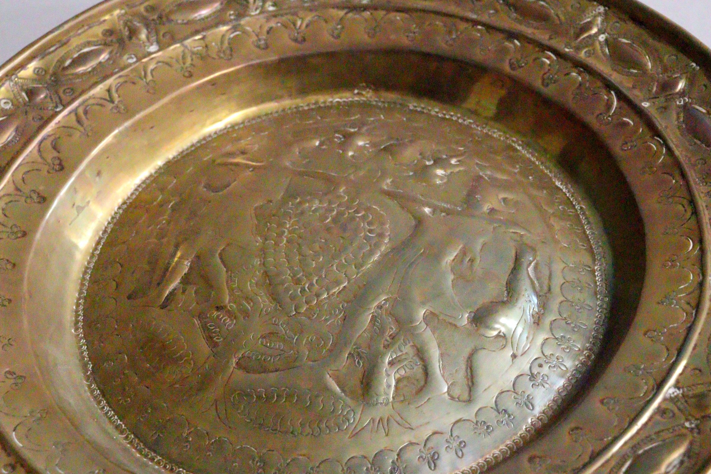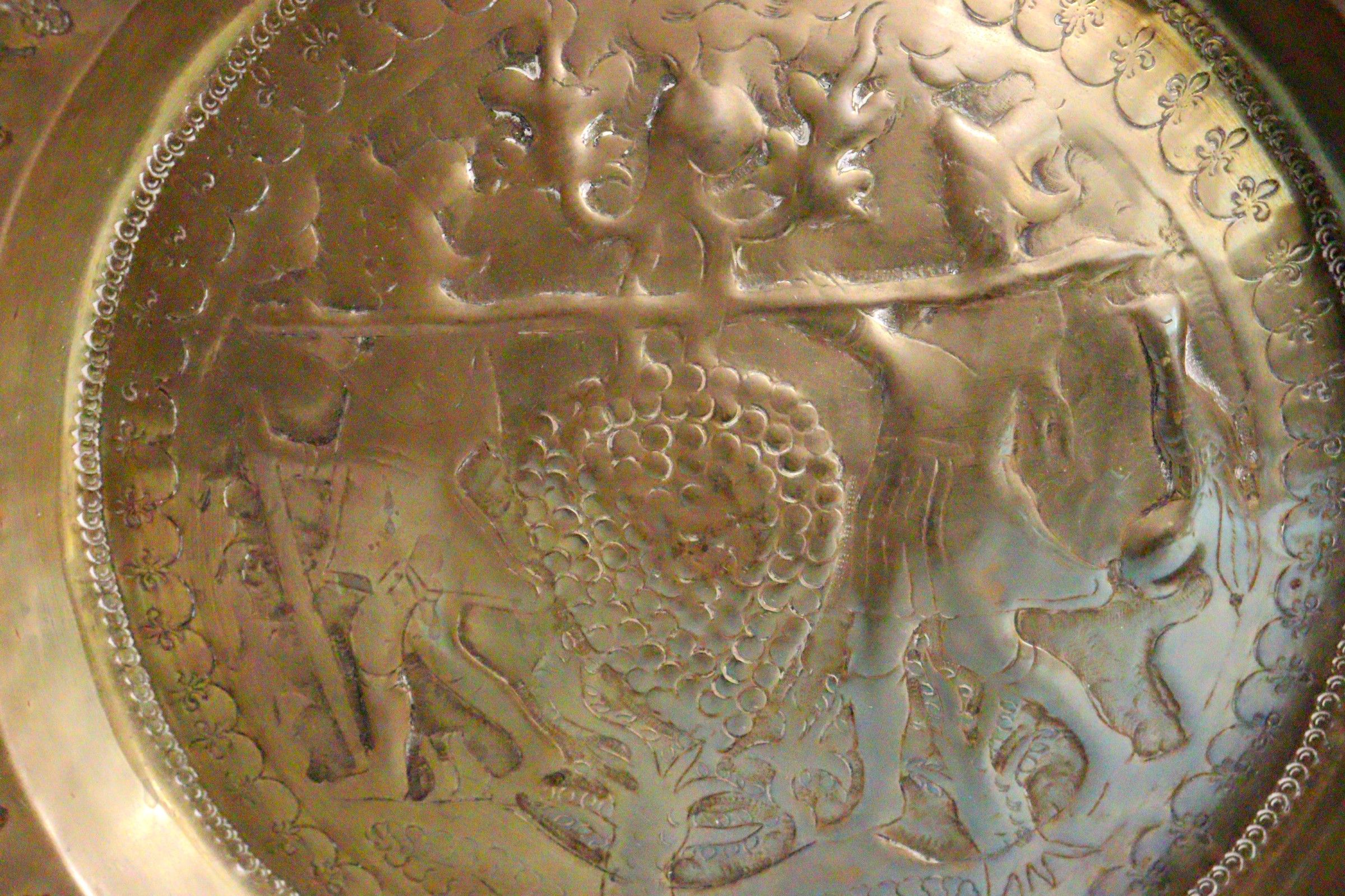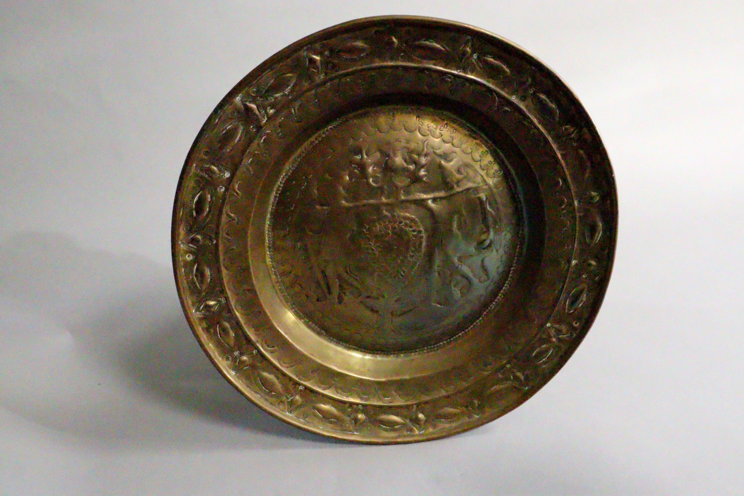 A gilt brass offering dish with repoussé decoration of an allegory of the grape harvest or mystical wine press, the rim embossed with a geometric frieze and stylised arcatures. Nuremberg. 17th century. D.: 37 cm