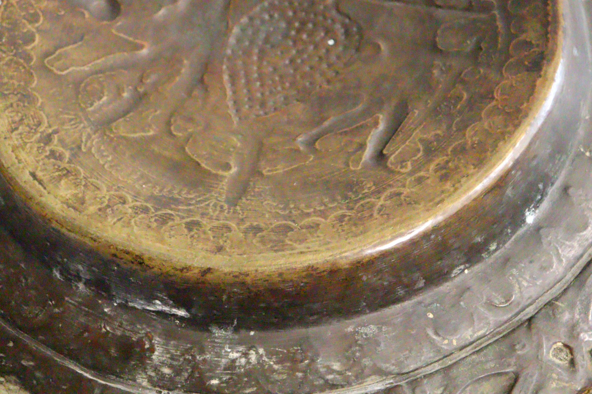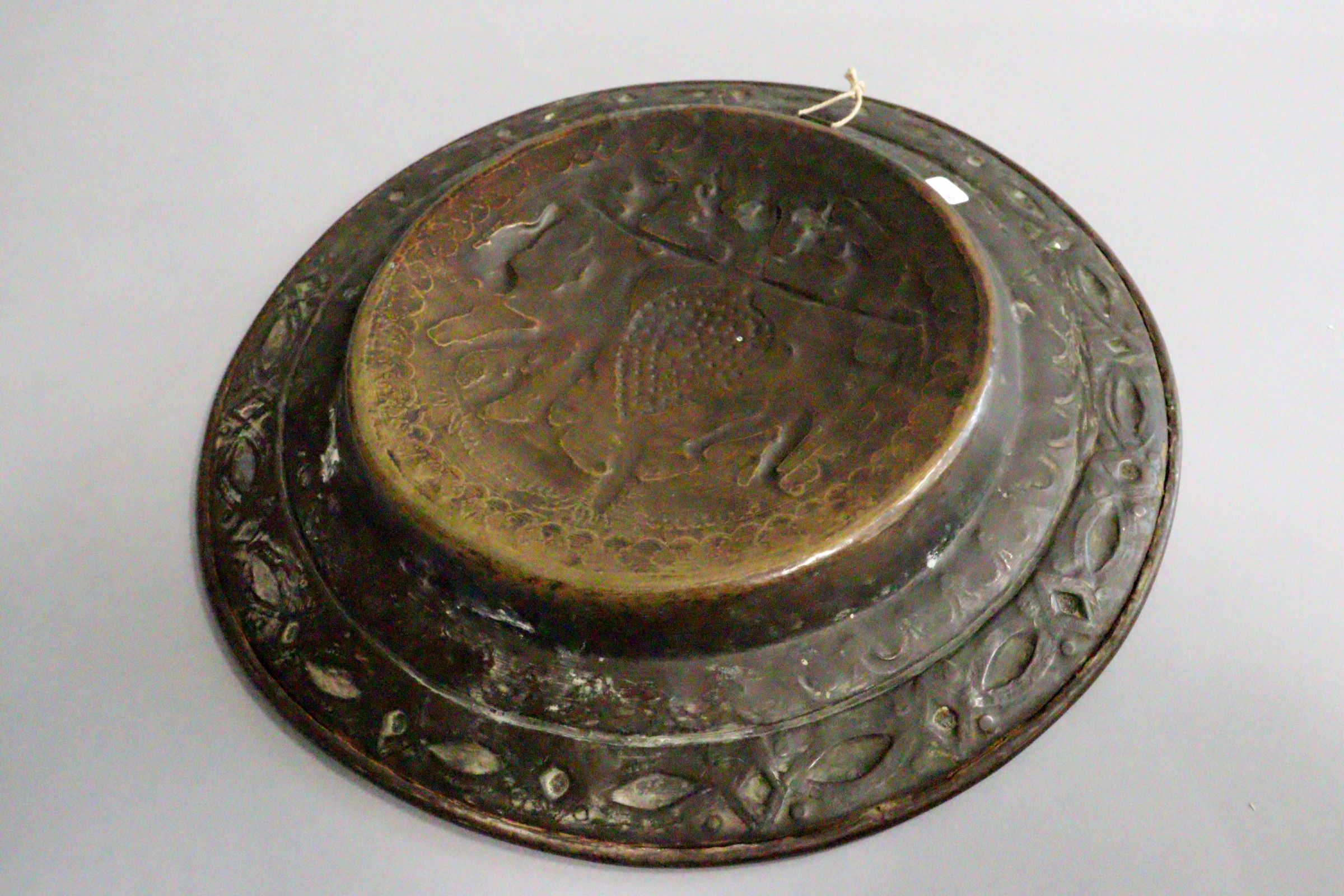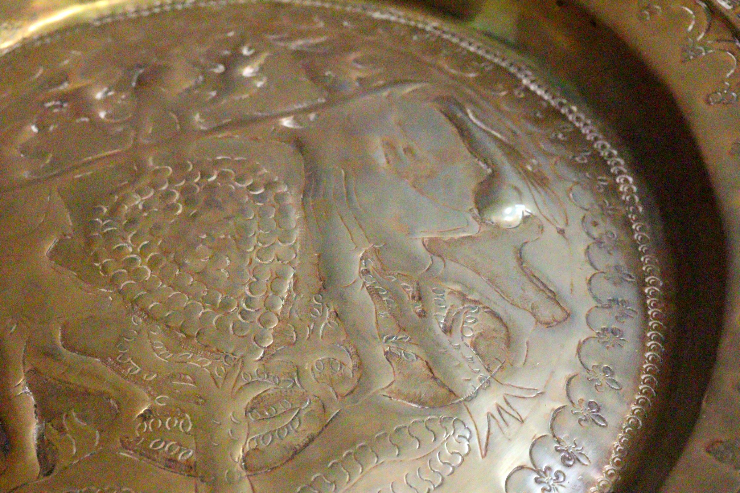 A gilt brass offering dish with repoussé decoration of an allegory of the grape harvest or mystical wine press, the rim embossed with a geometric frieze and stylised arcatures. Nuremberg. 17th century. D.: 37 cm