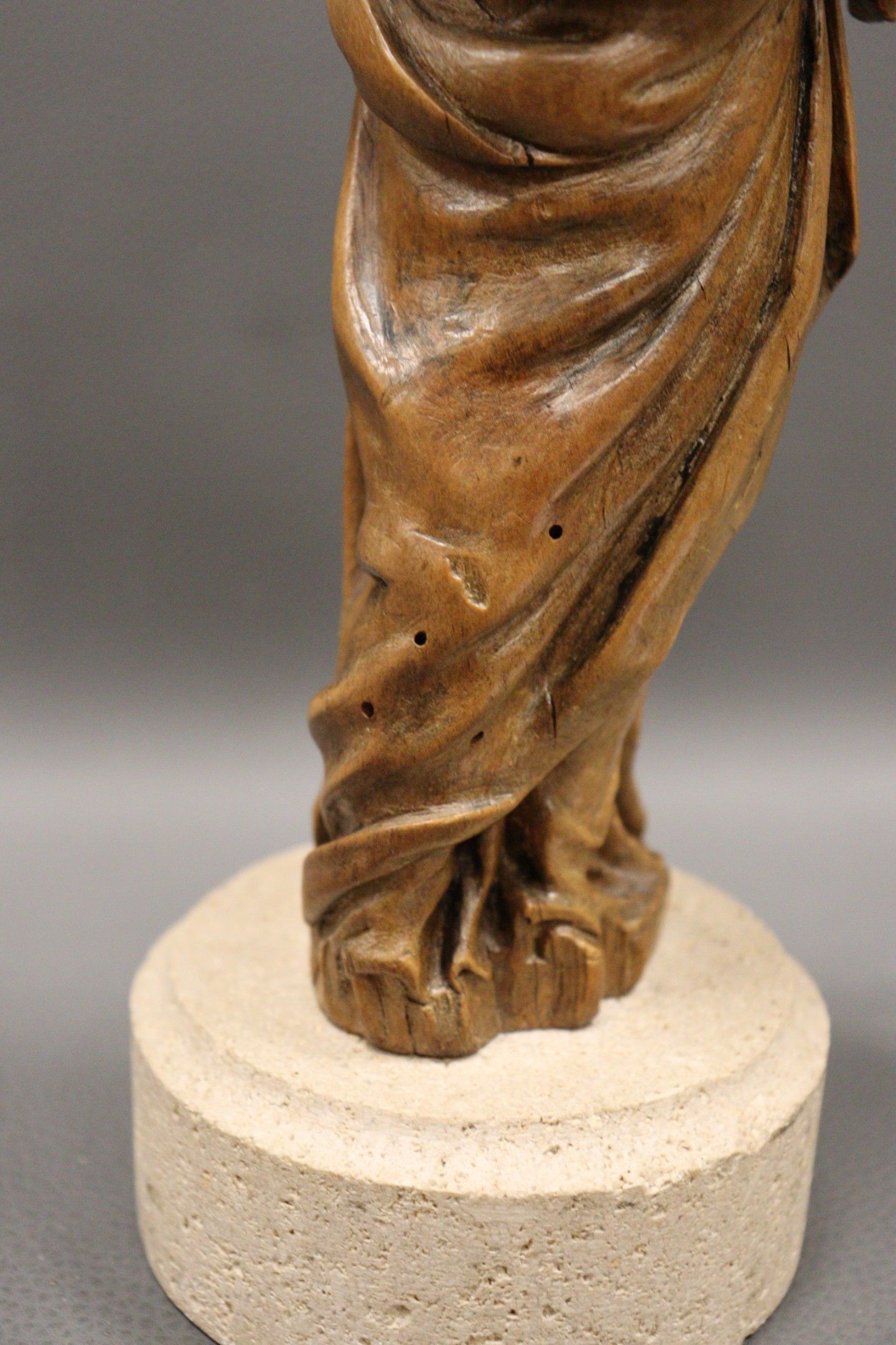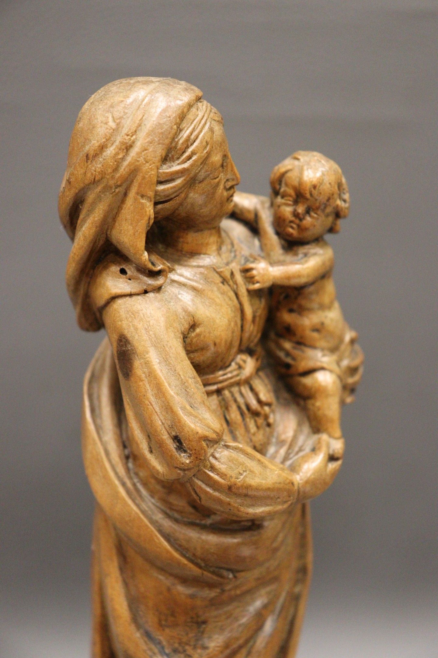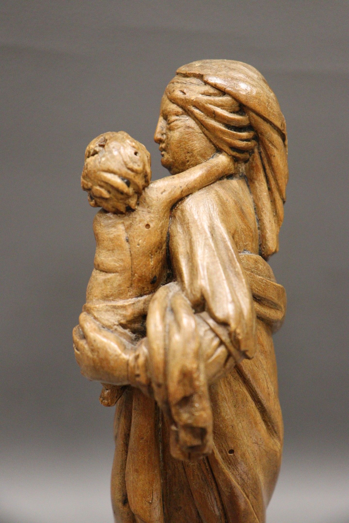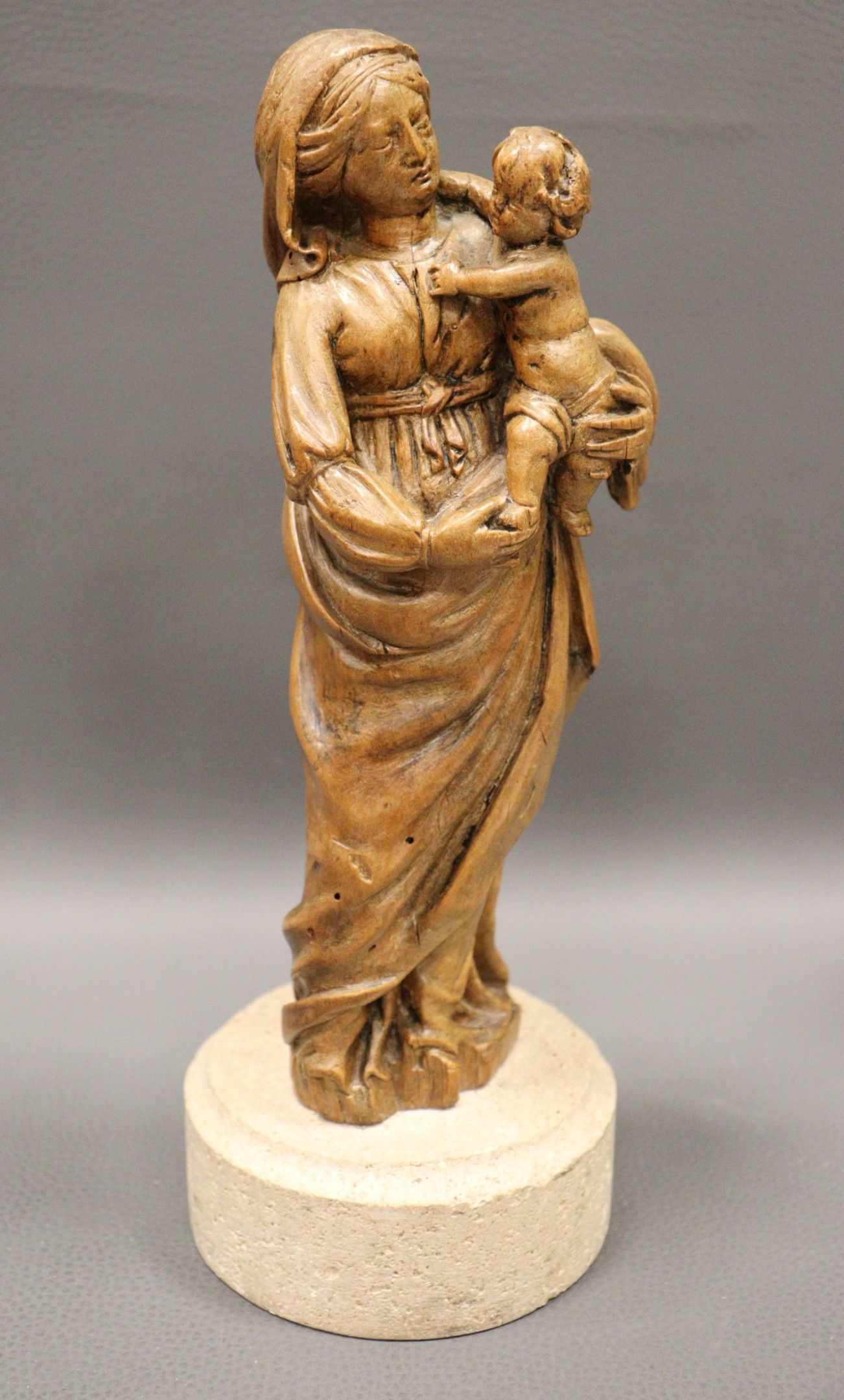 Early 18th century. Virgin and Child. Wood carved in the round (worn, damaged and missing). Circular stone base. Height: 27 cm