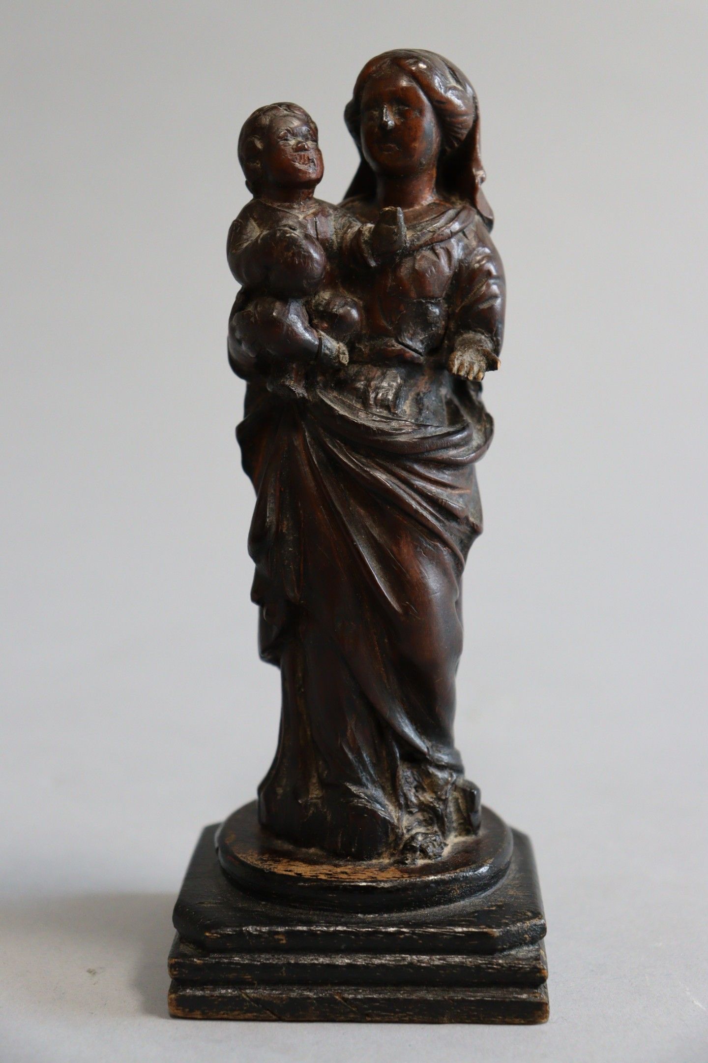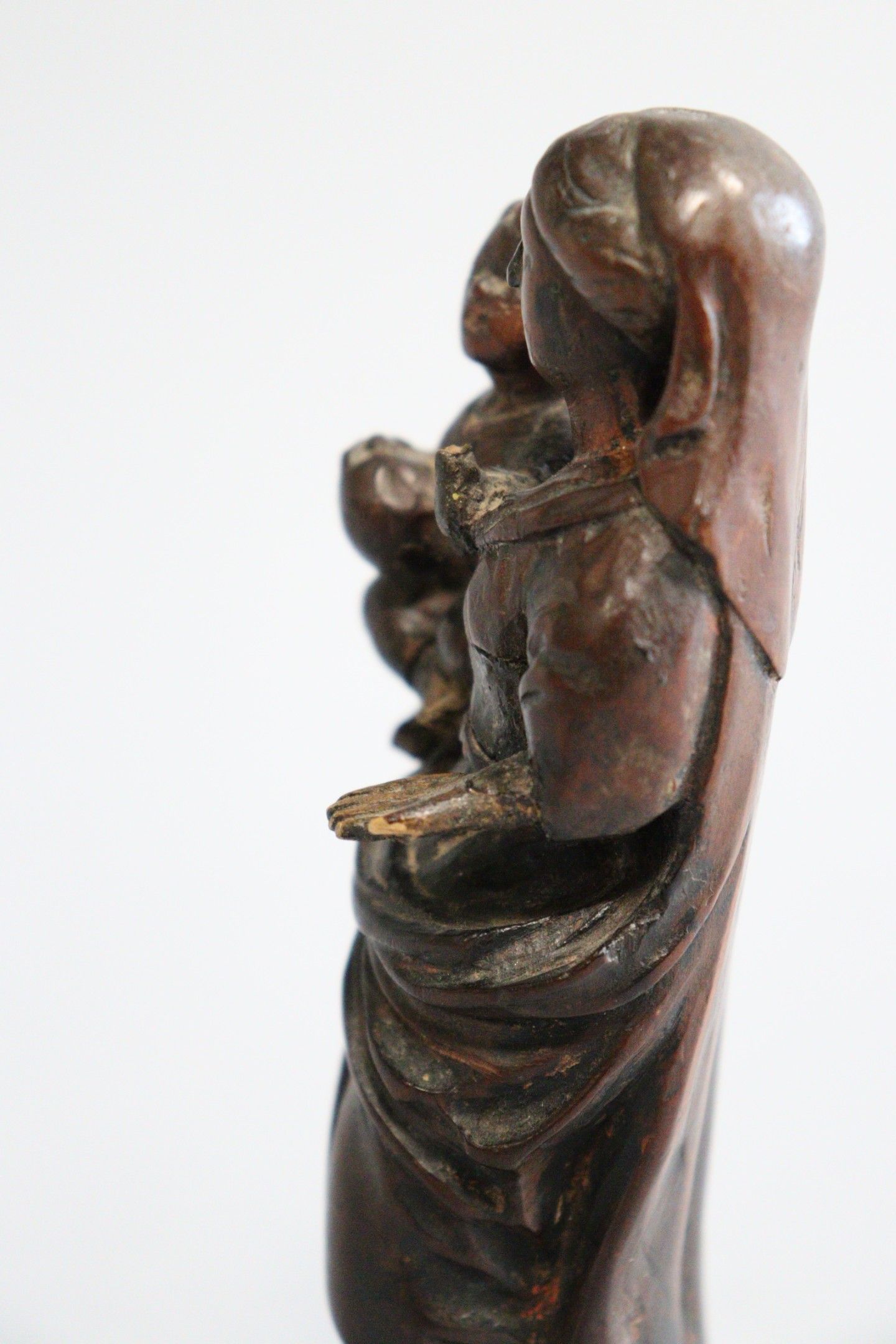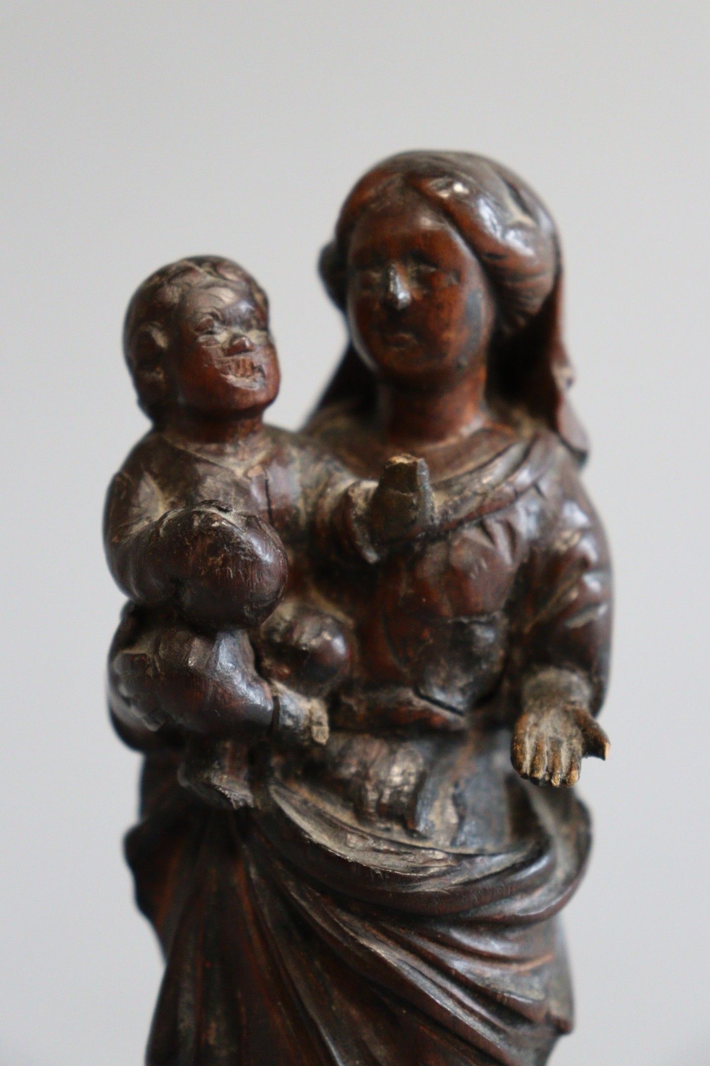French school of the 18th century. Virgin and Child wood carved in the round with traces of old red polychromy. H: 14 cm without the base - Total H: 16.5 cm