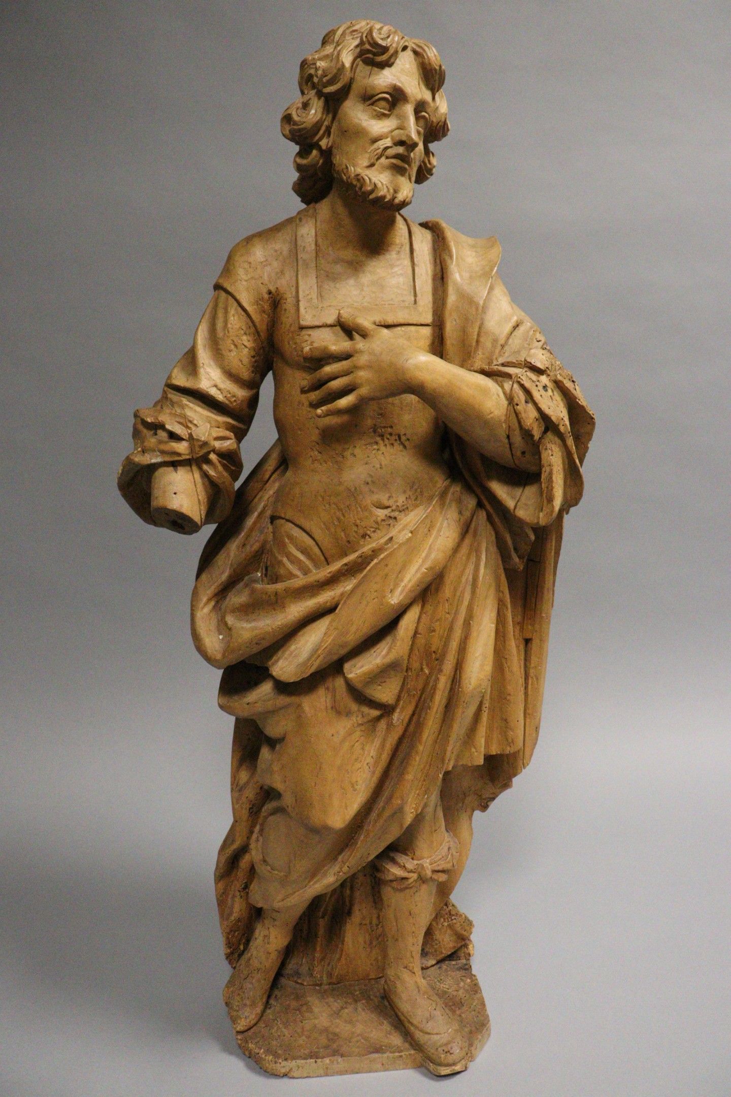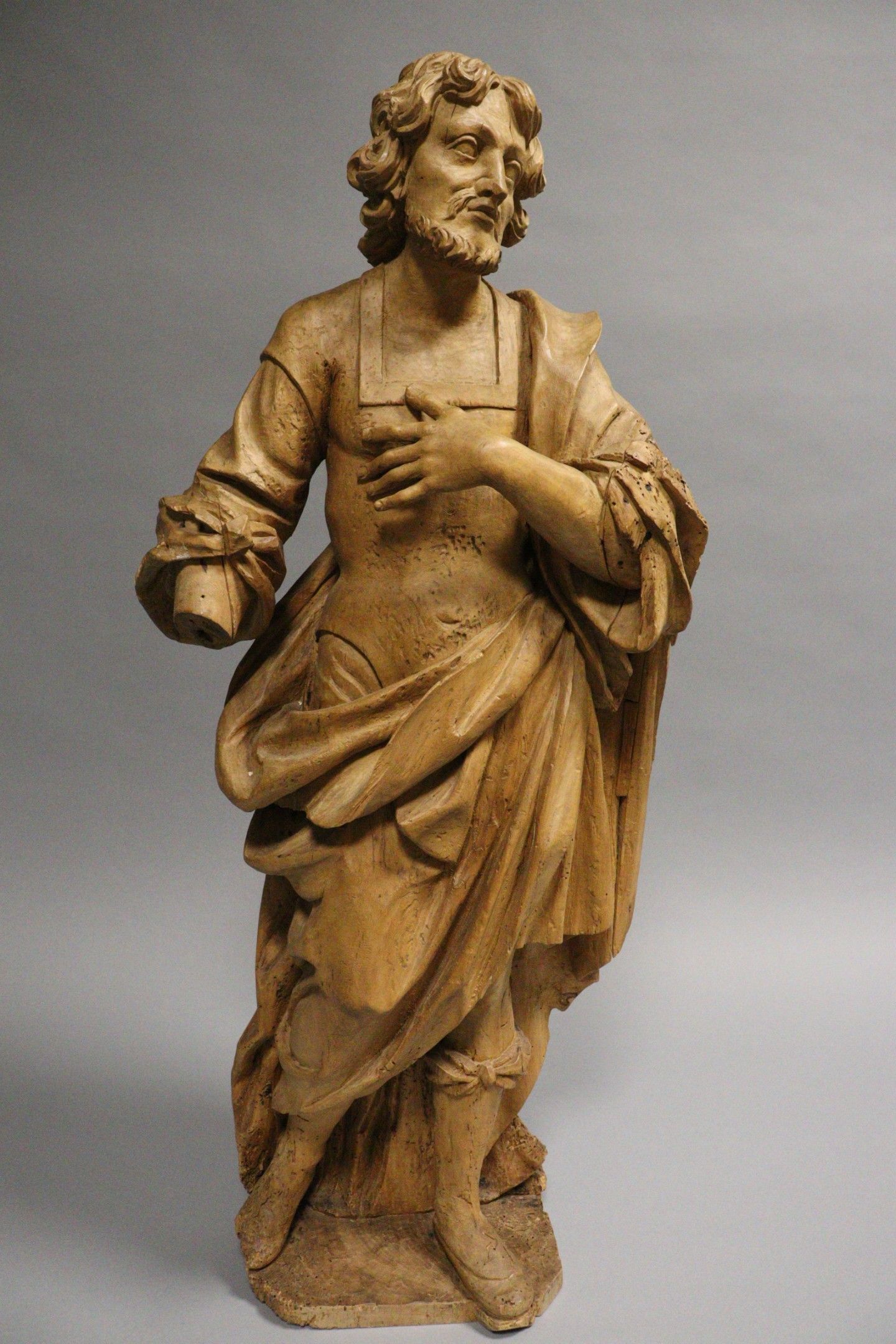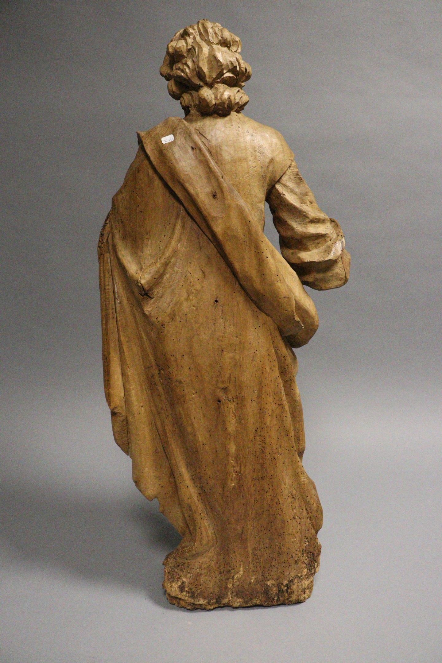 18th century school. Saint Peter. Wooden sculpture in the round with a rough back (stripped, accidents, cracks, missing parts, traces of xylophagous insects). Height : 98 cm
