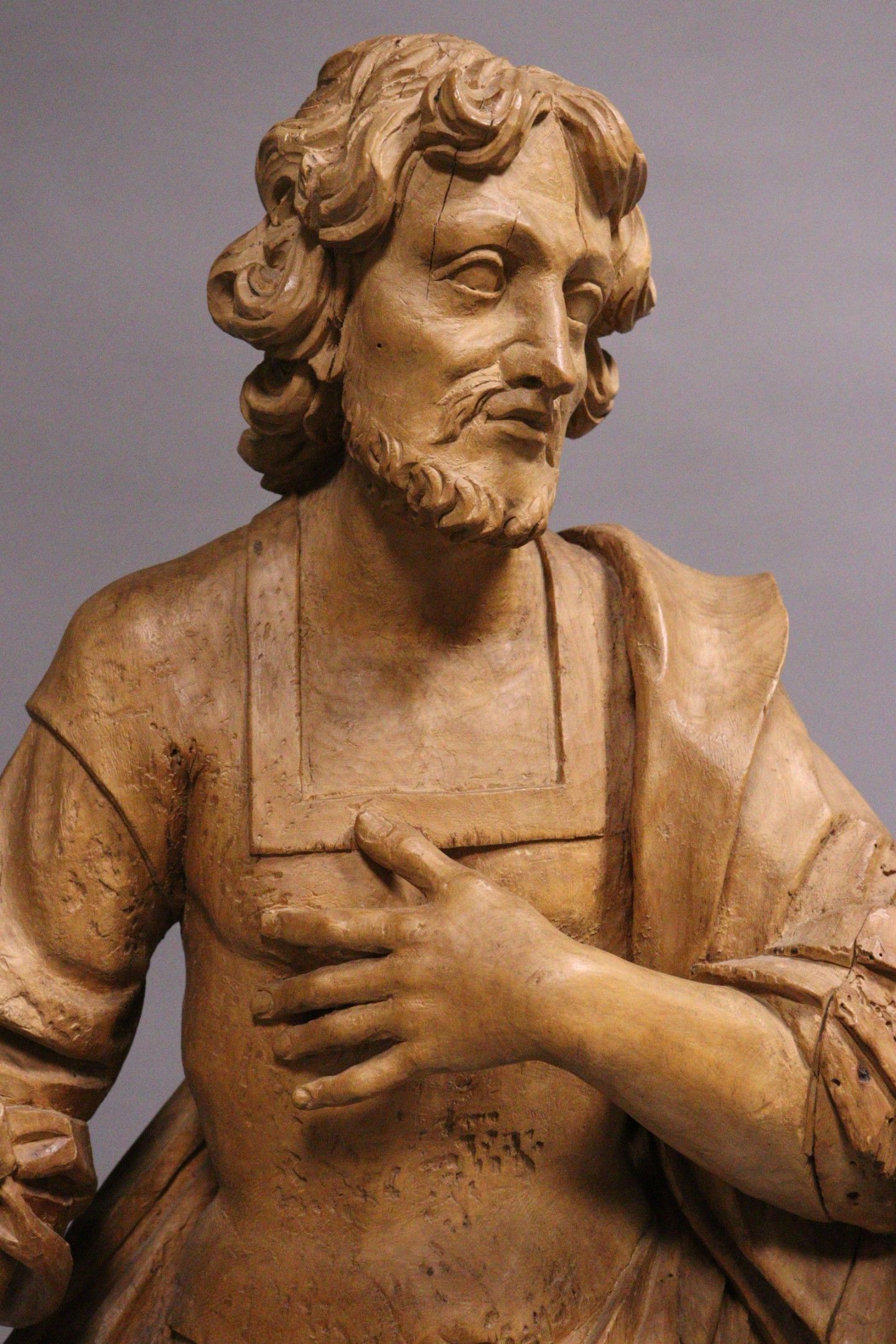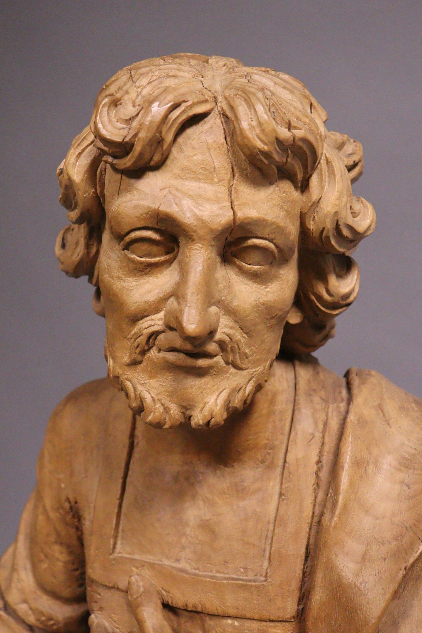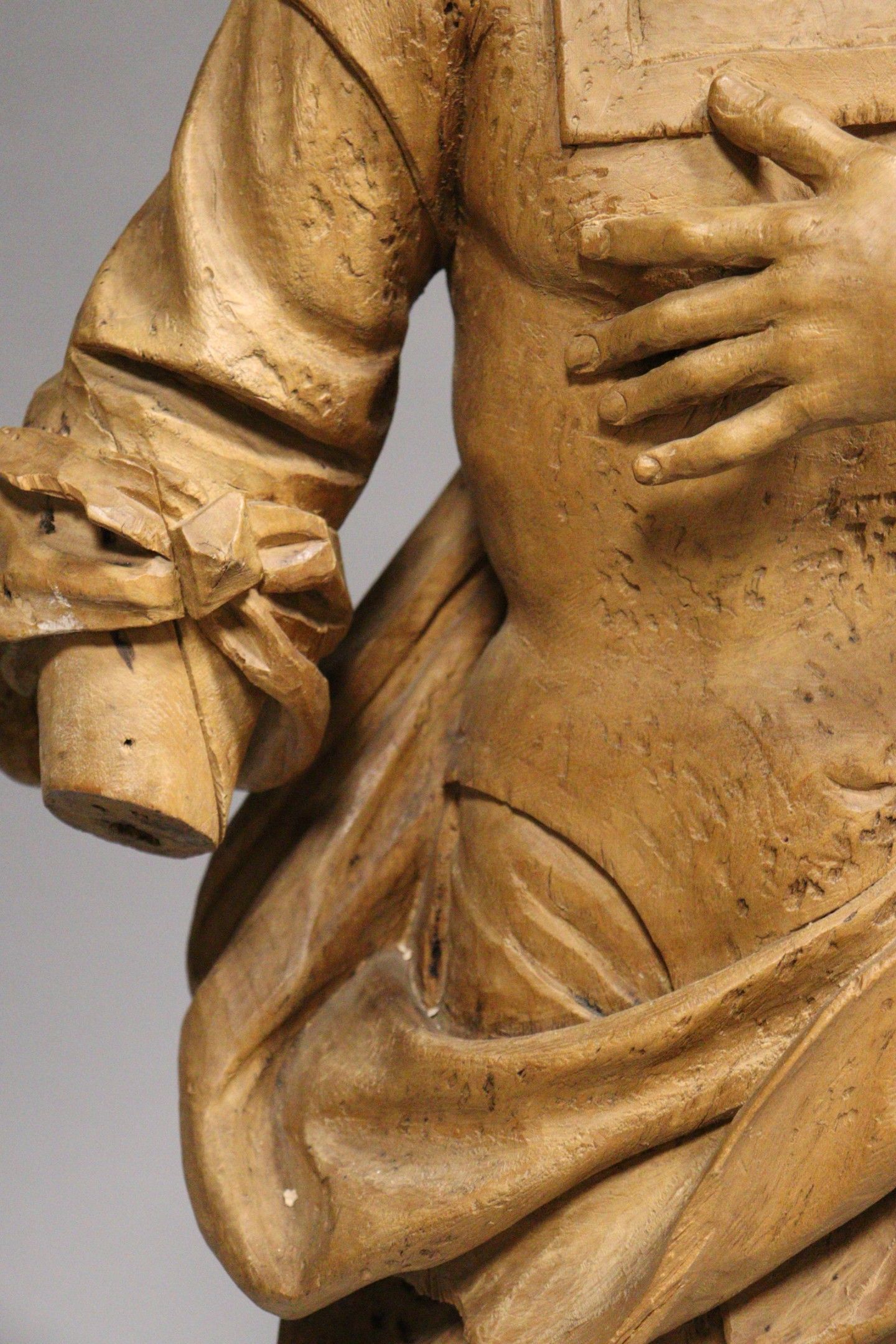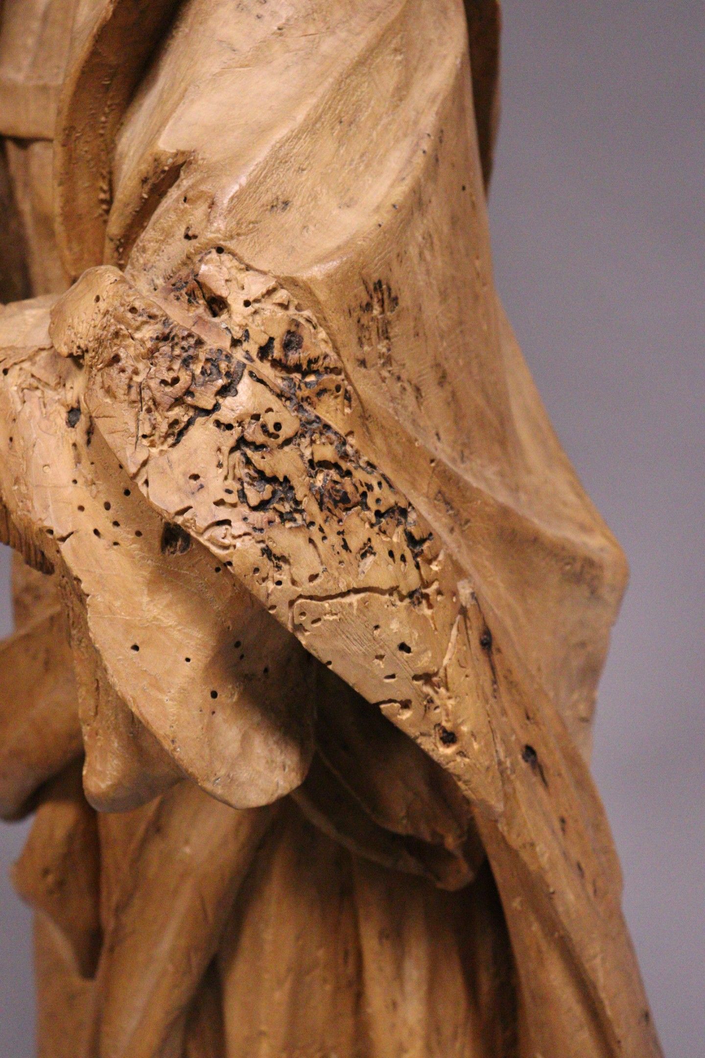 18th century school. Saint Peter. Wooden sculpture in the round with a rough back (stripped, accidents, cracks, missing parts, traces of xylophagous insects). Height : 98 cm