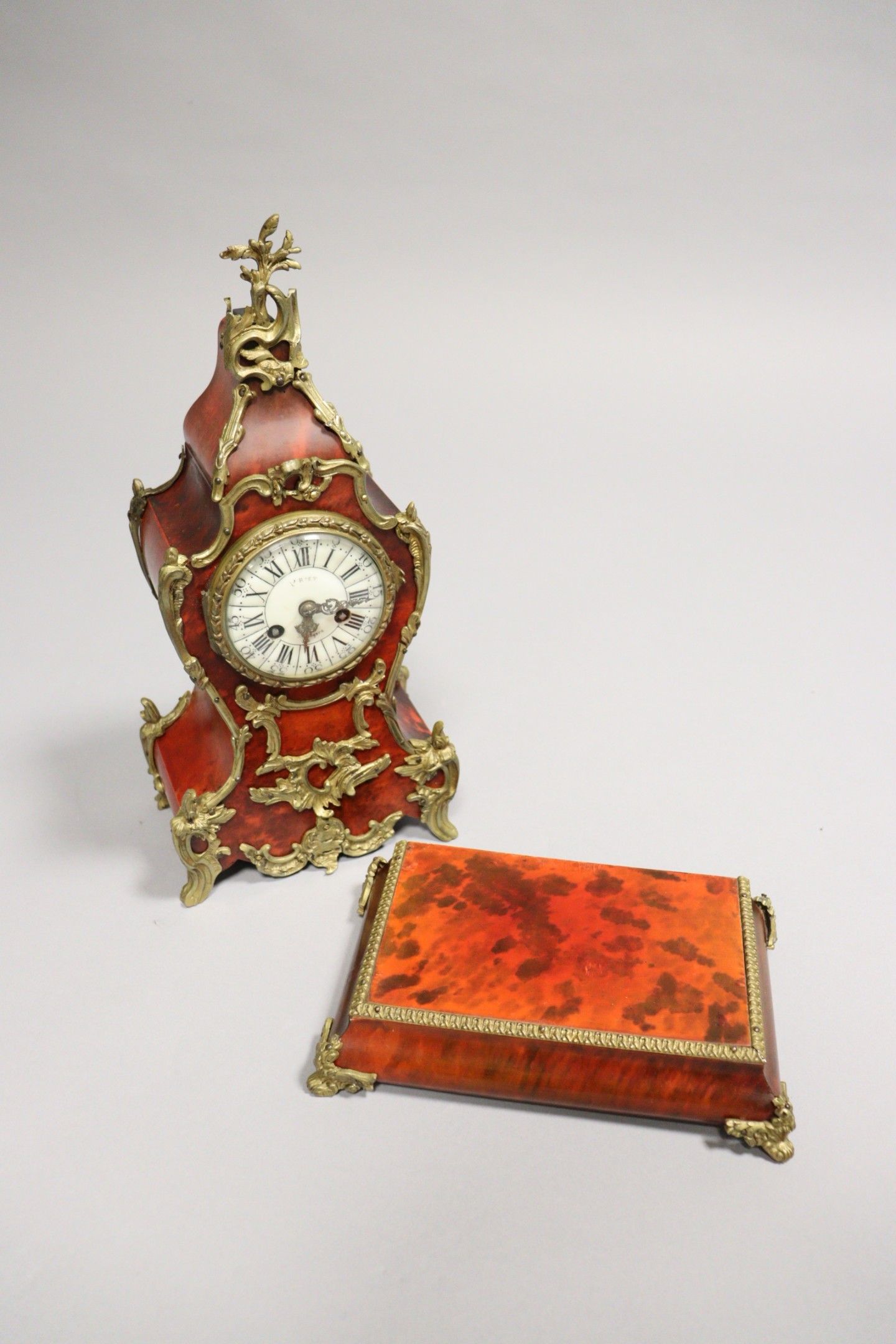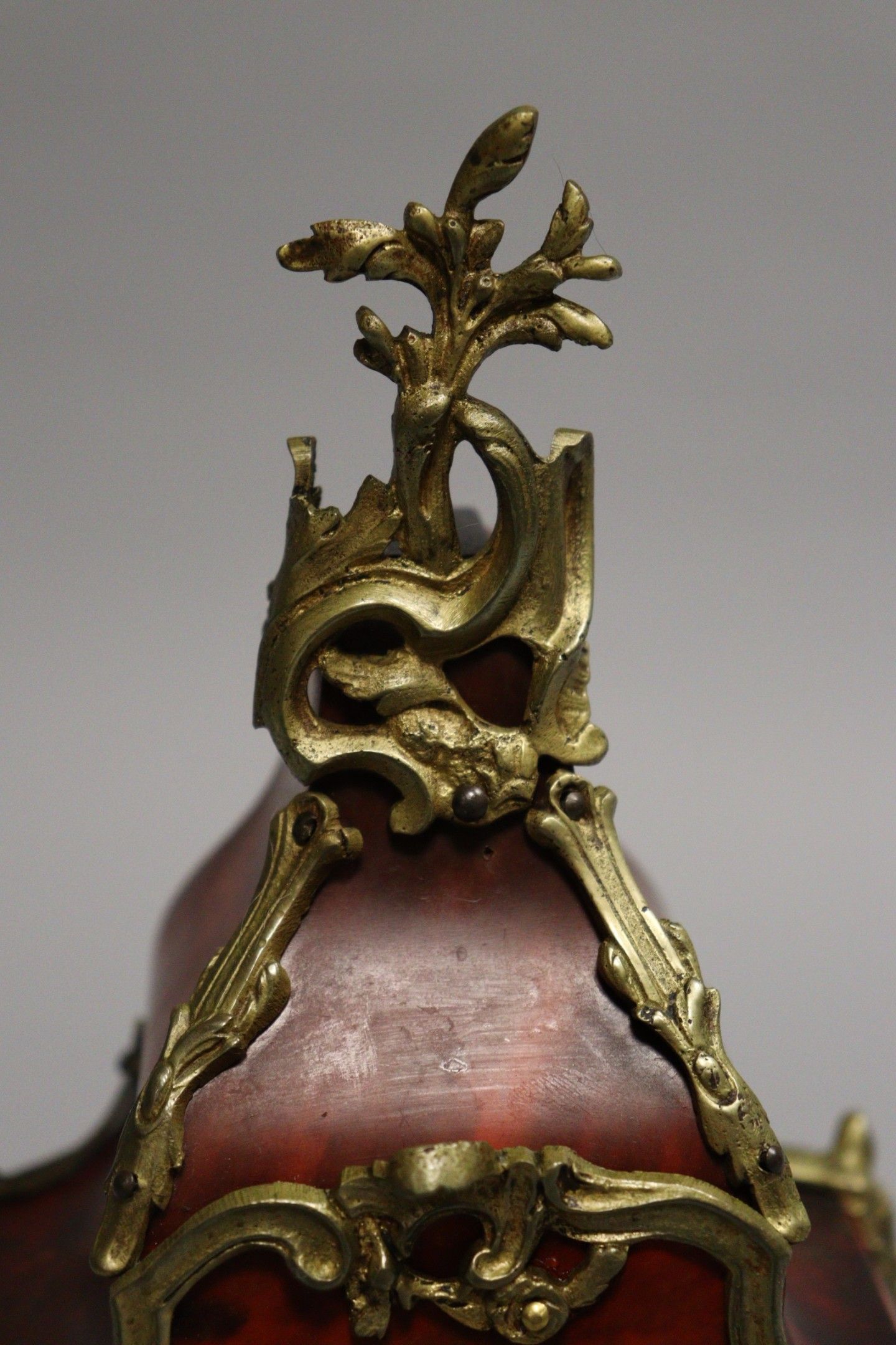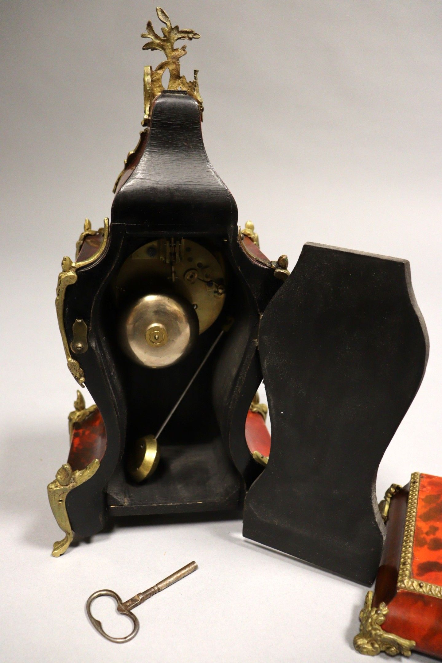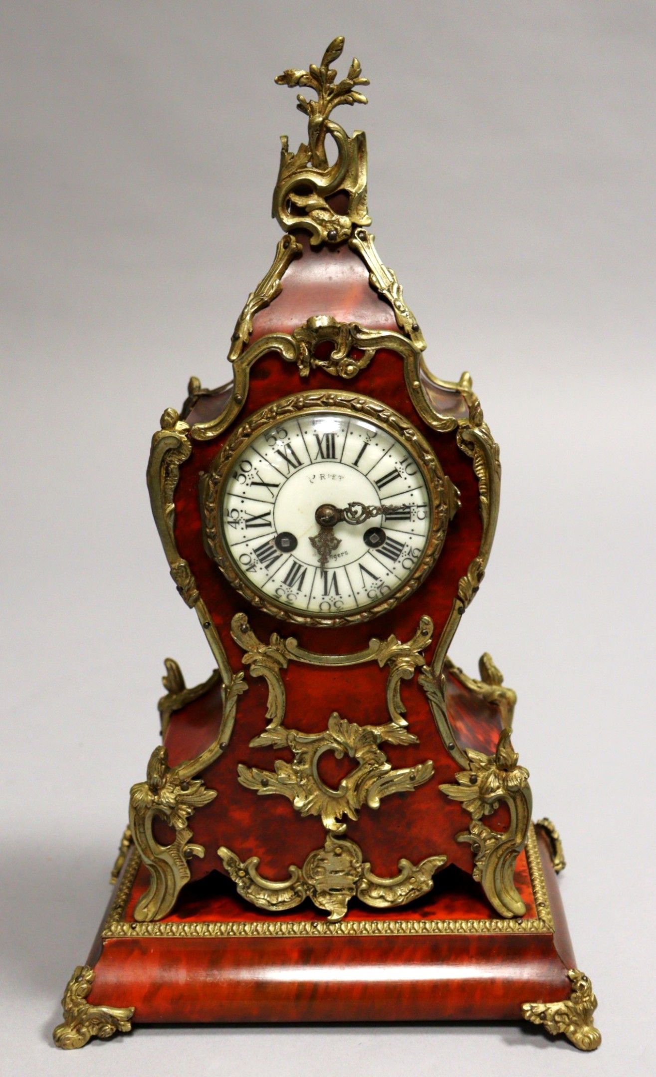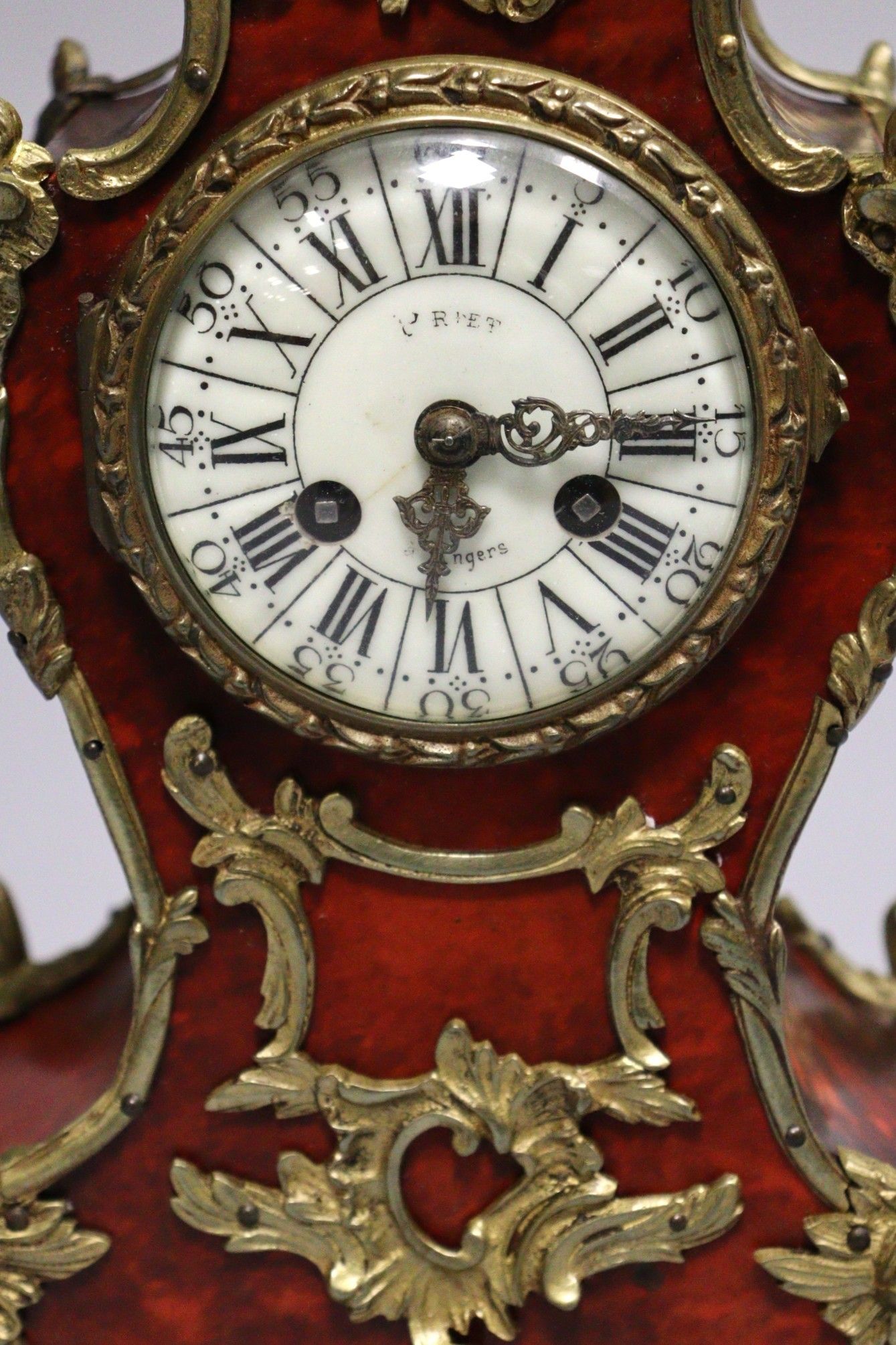 PRIET in Angers. A violin-shaped clock on a stand in red tortoiseshell veneer with gilt bronze ornamentation and foliage decoration. The dial is signed with white enamel. Louis XV style. In working order. Height: 42 cm