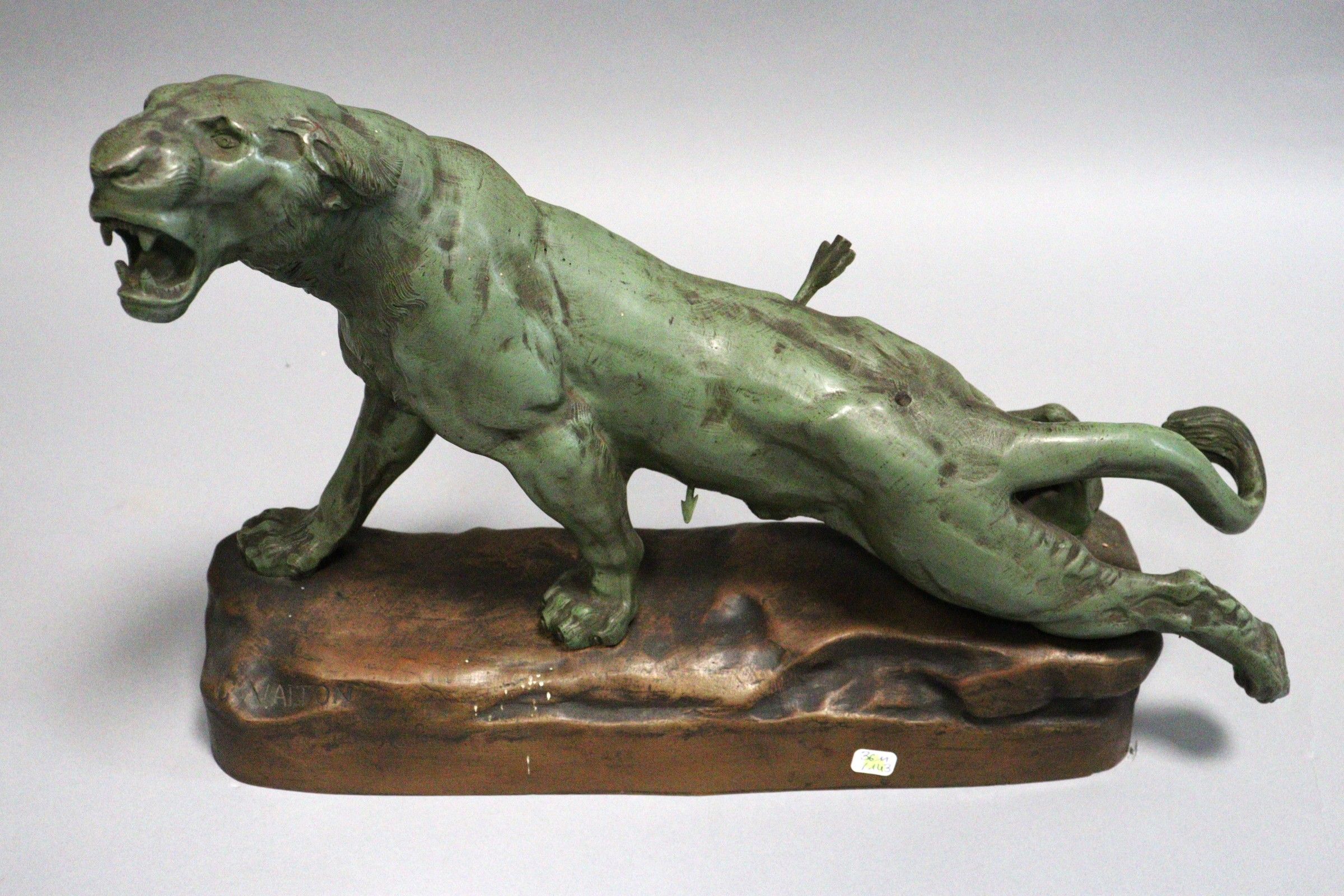 Charles VALTON (1851-1918). Wounded panther. Green patina bronze, signed on the base. H.: 30 cm - L.: 47 cm